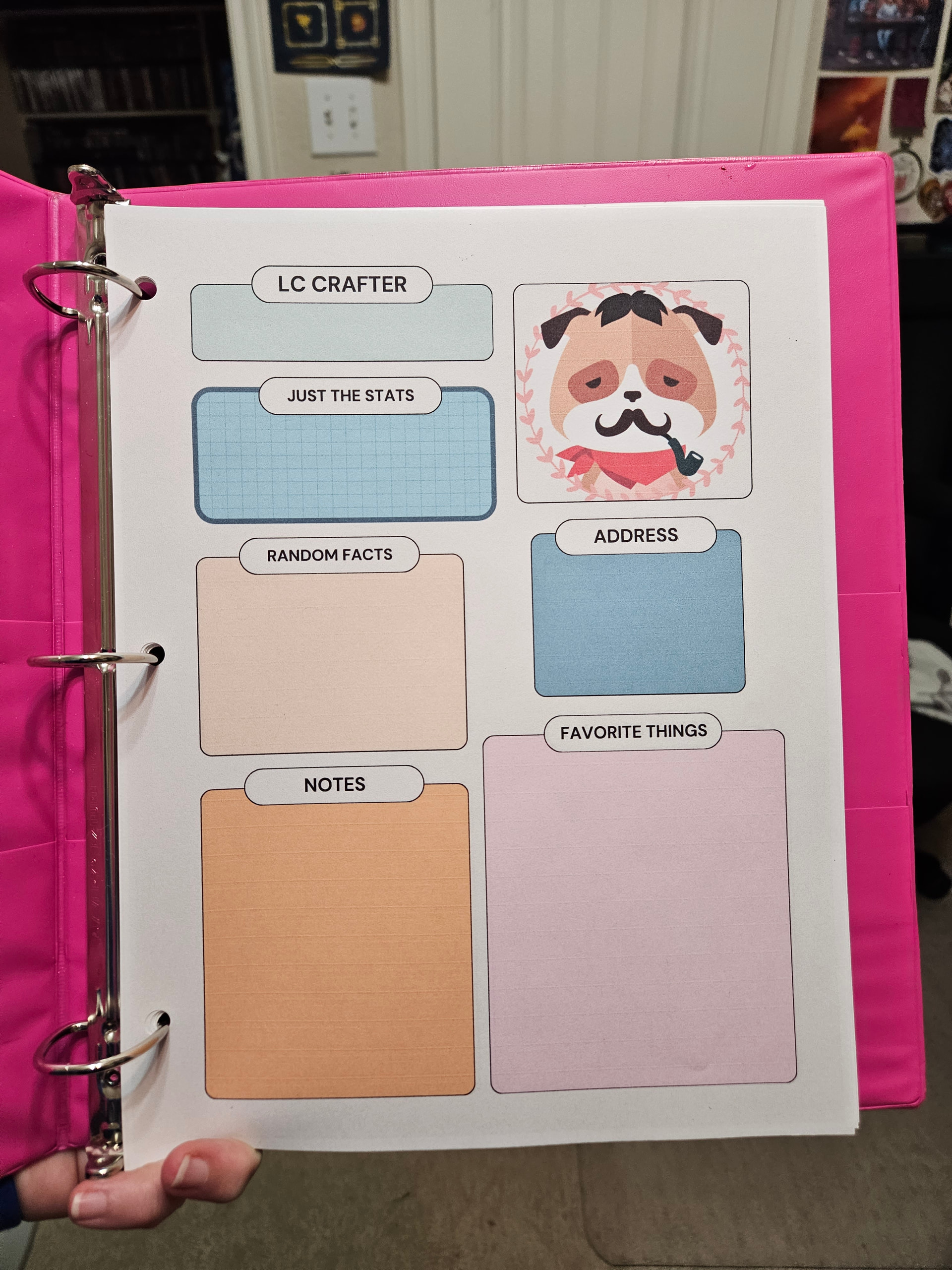 Brief Description: I have trouble keeping track of mailing addresses, especially now that I’m trying to be better about sending happy mail. And sometimes you find something perfect and just want to send it to someone. Or want to keep track of all the things they love for swaps (especially little things that might not be in a swap questionnaire). These address and more pages are my answer to that. They’re 8.5x11 and I printed 25 or so and put them in a bright pink binder. And they’re multi-colored.