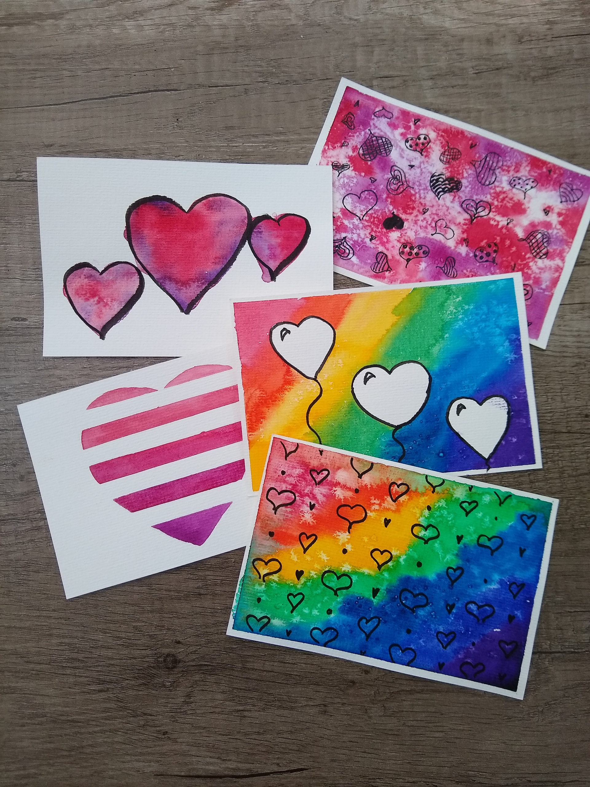 Brief Description: These Valentine’s Postcards are rainbow-colors, are for sending words to friends, and use water (watercolor) and are red!