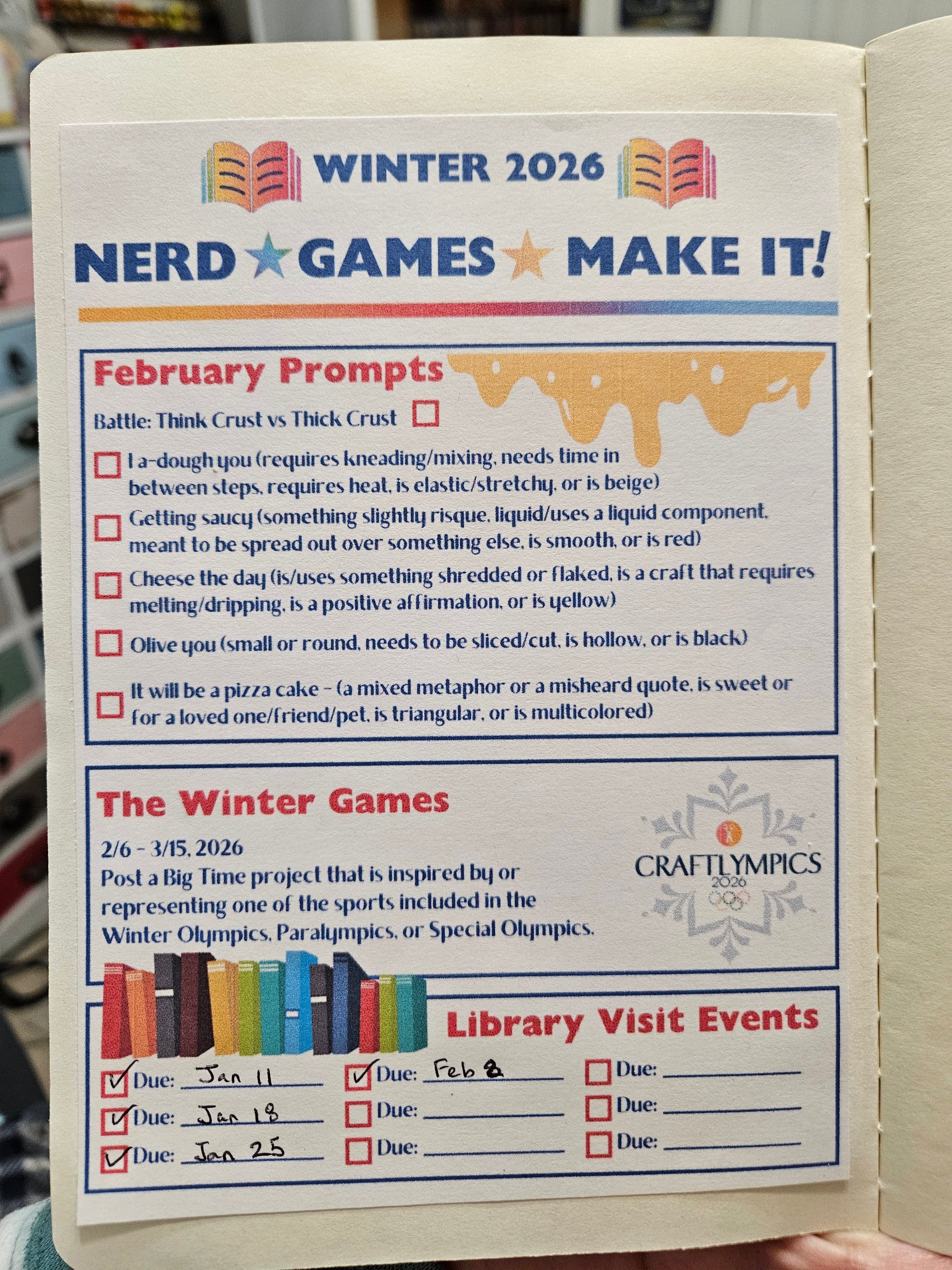 Brief Description: Tracking page for February, Craftlympics, and the library events. This was printed and is meant to be spread out over a notebook and glued down…at least for my notebook.