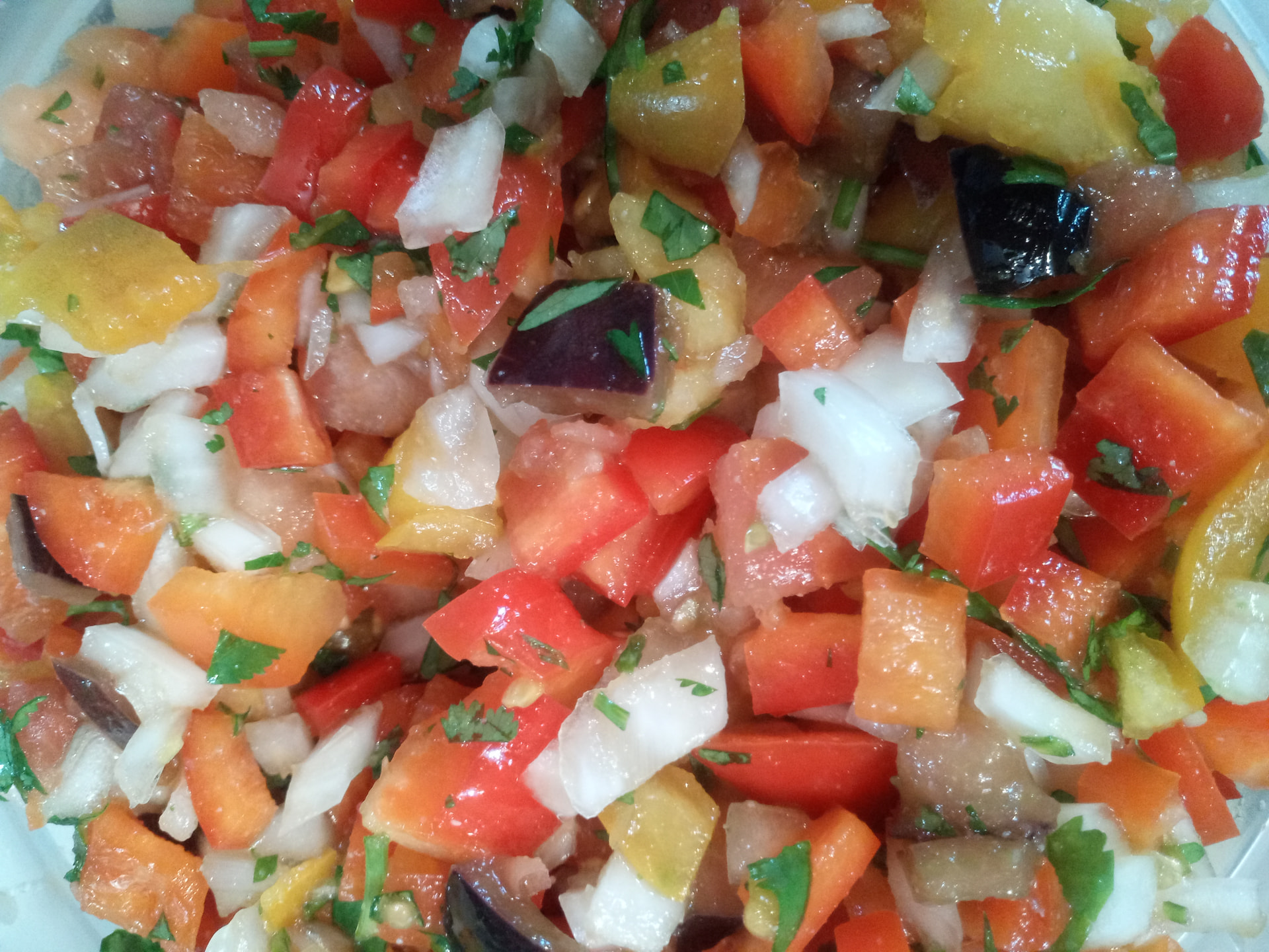 Brief Description: Fresh pico de gallo for my son’s birthday dinner, made with a rainbow of veggies (including delicious heirloom tomatoes).