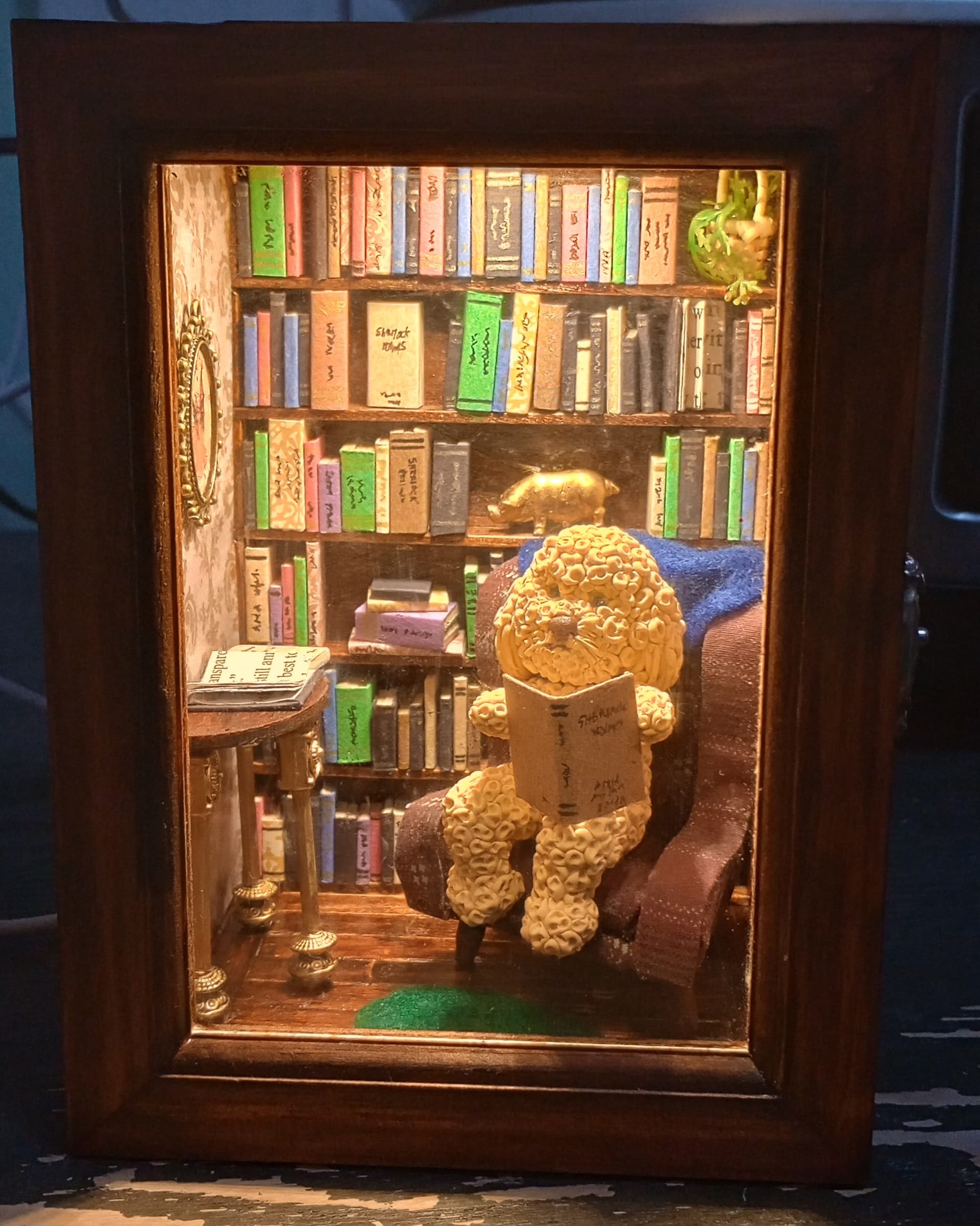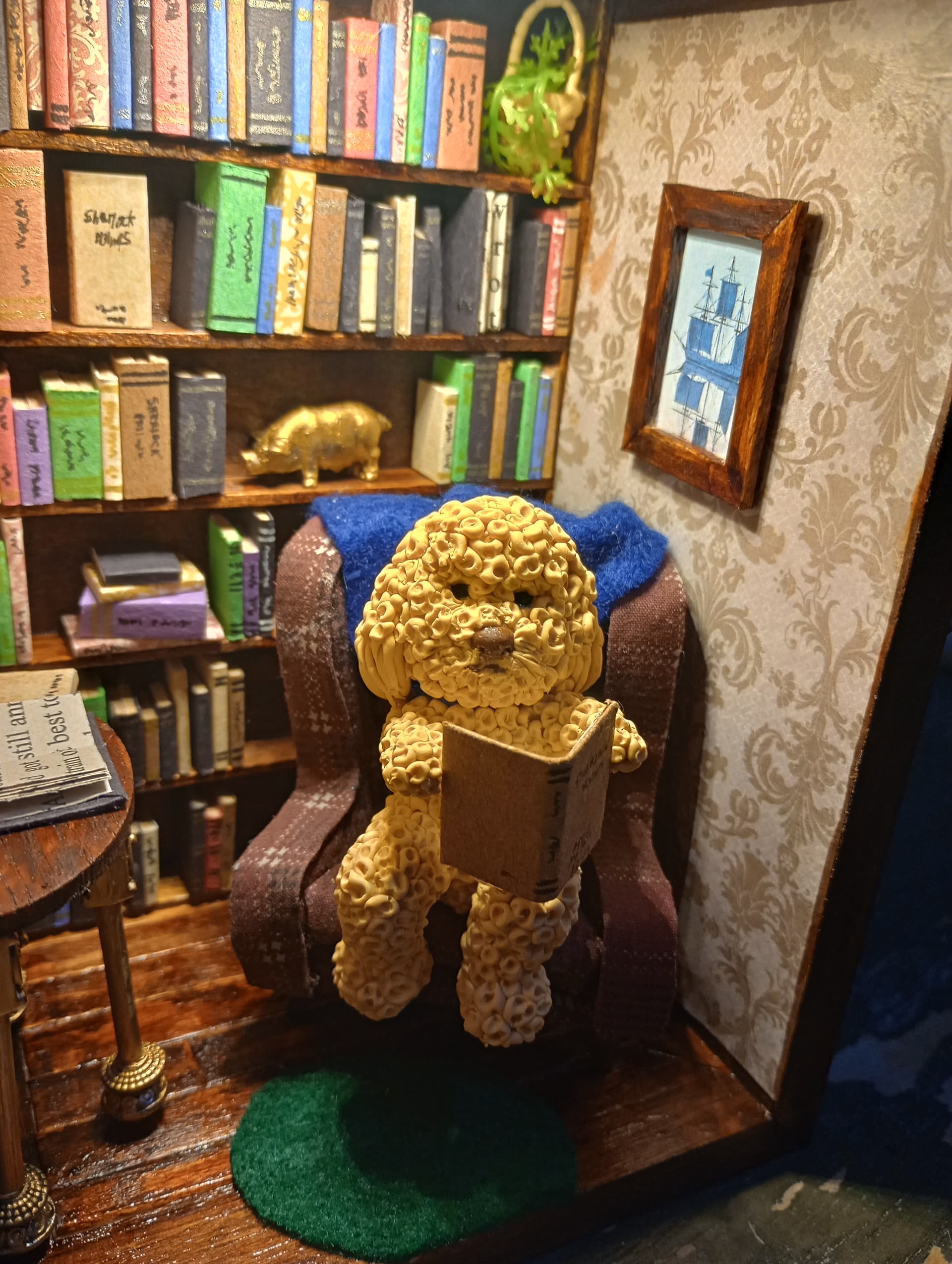 I am a dog walker and I’ve been walking my clients’ dog, Ollie, for the last eight years. Ollie’s parents and I have become good friends and I adore them. Unfortunately they moved about thirty minutes away into a retirement community but I couldn’t just give them up!! So I go over there once a week. Ollie’s dad got really sick recently and I wanted to make him something. At first I tried to make a model of his red MG 52’ but that was really difficult. I had no idea what I was doing. I had a recollection that he loves Sir Arthur Conan Doyle and some other mystery writers so I made a mystery library with Ollie sitting in a comfy old armchair. I was actually really surprised how well I sculpted Ollie.