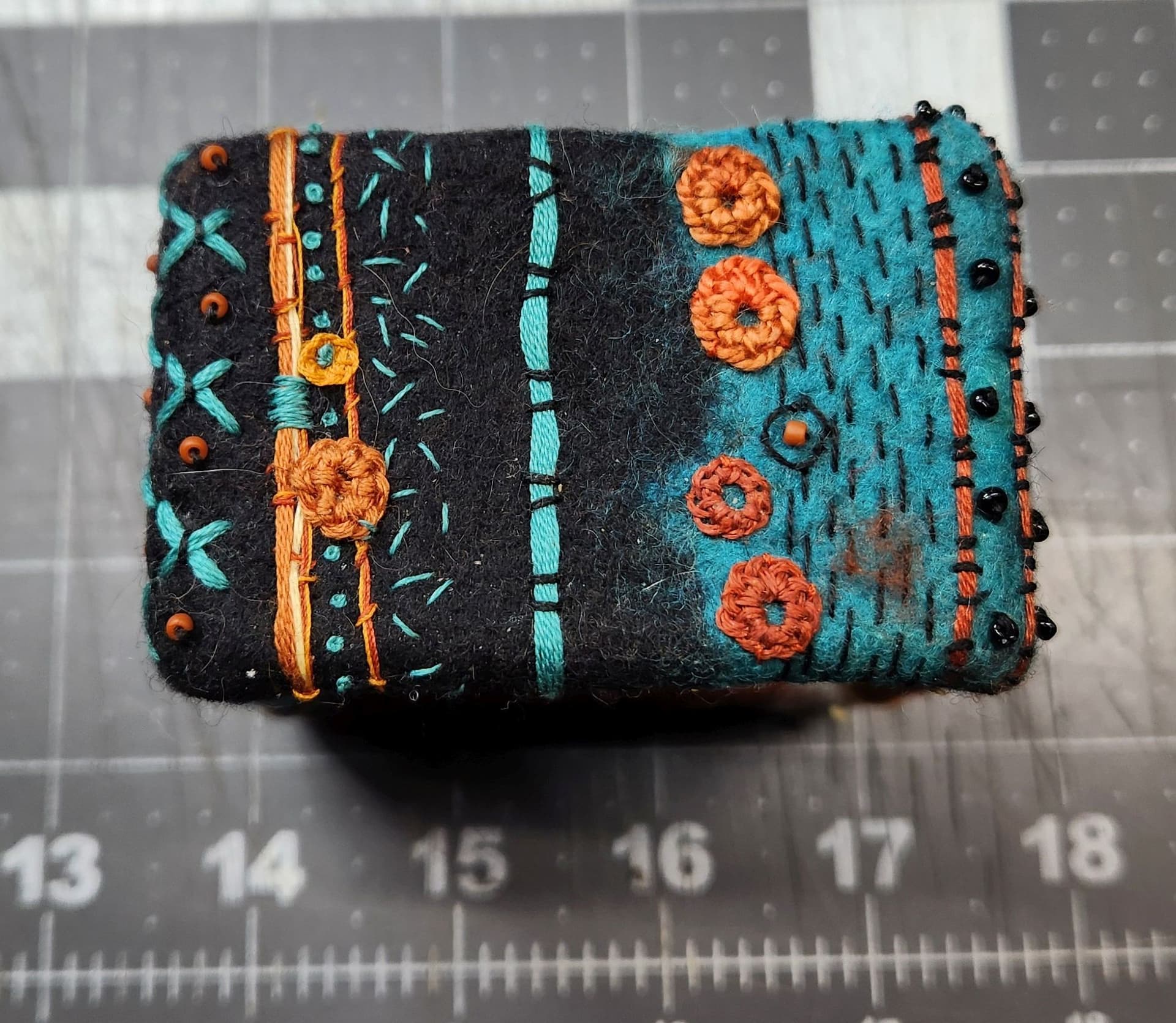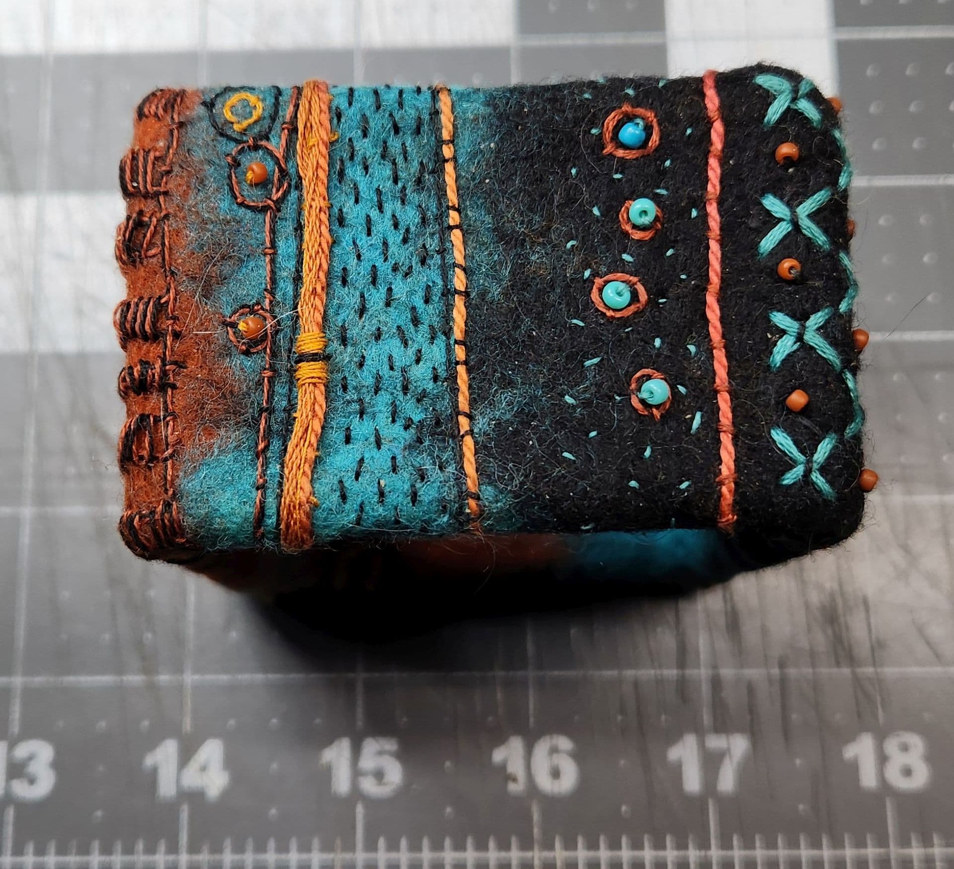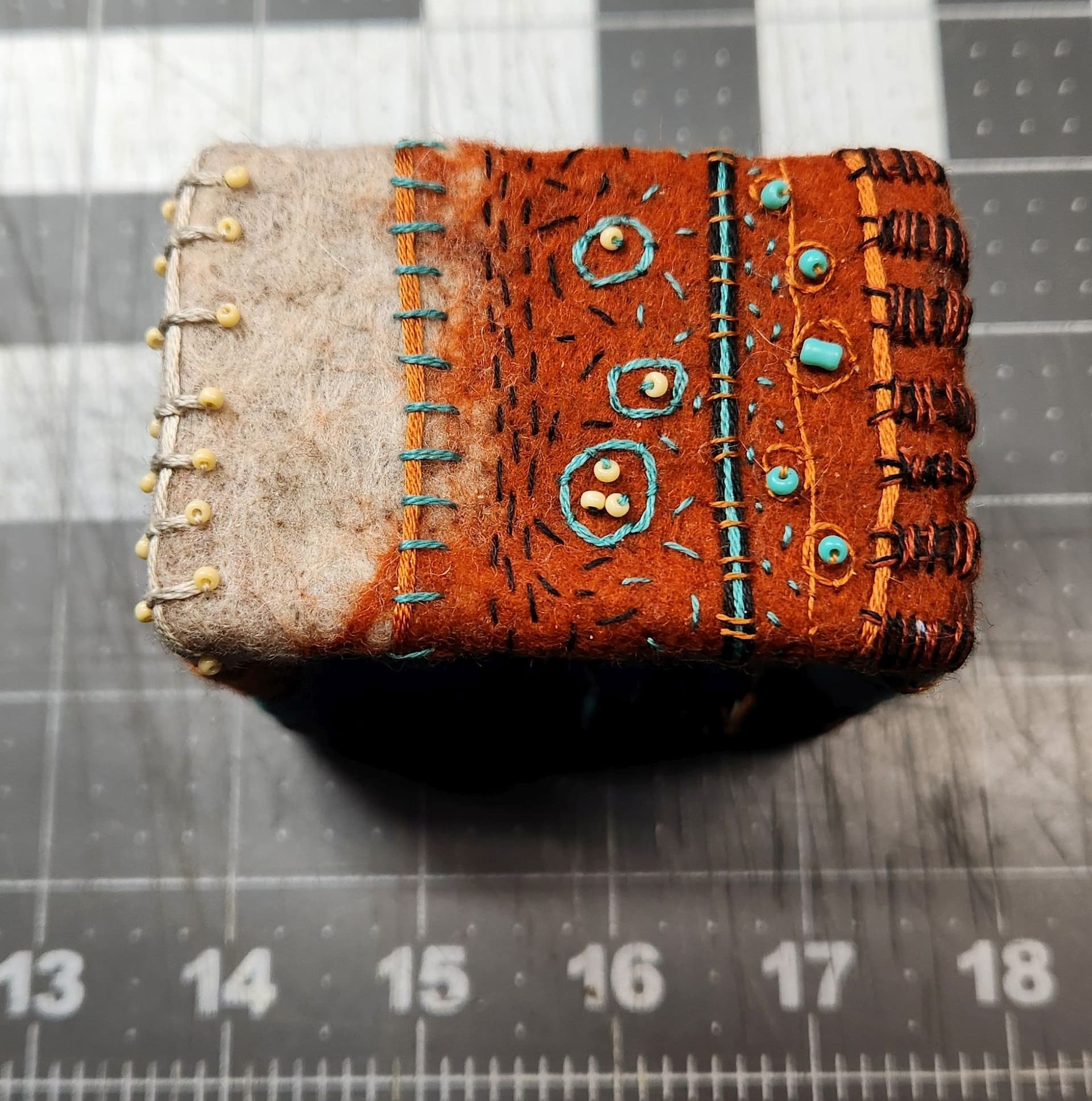 I made a point of NOT using really hot water when wet felting the foundation on this bracelet. These colors were chosen because of a post @AIMR made about an afgan she created in these colors years ago.