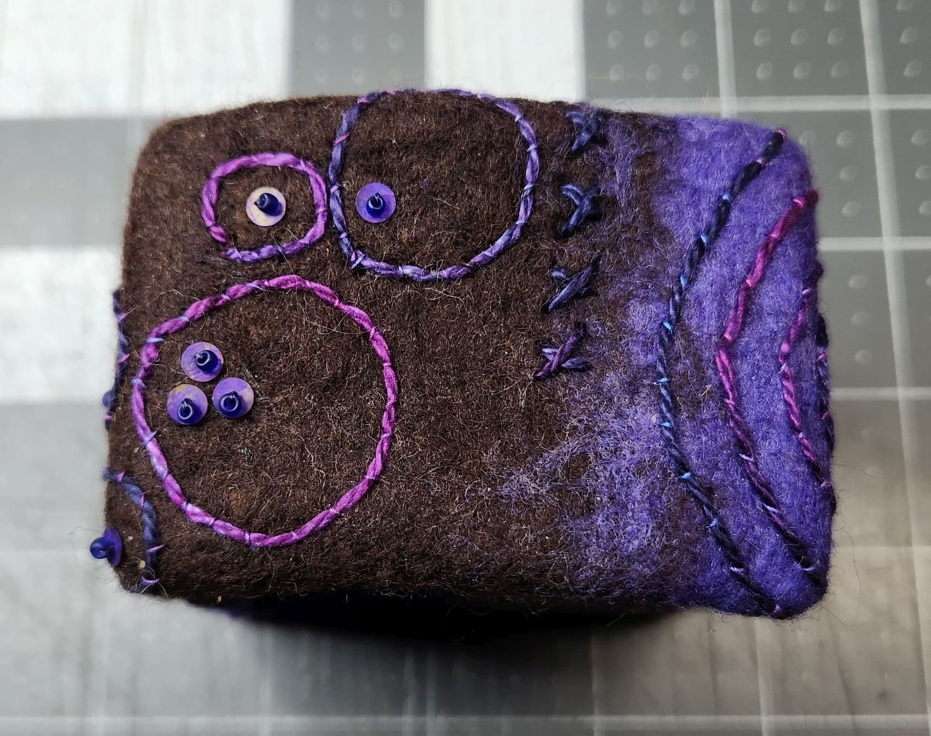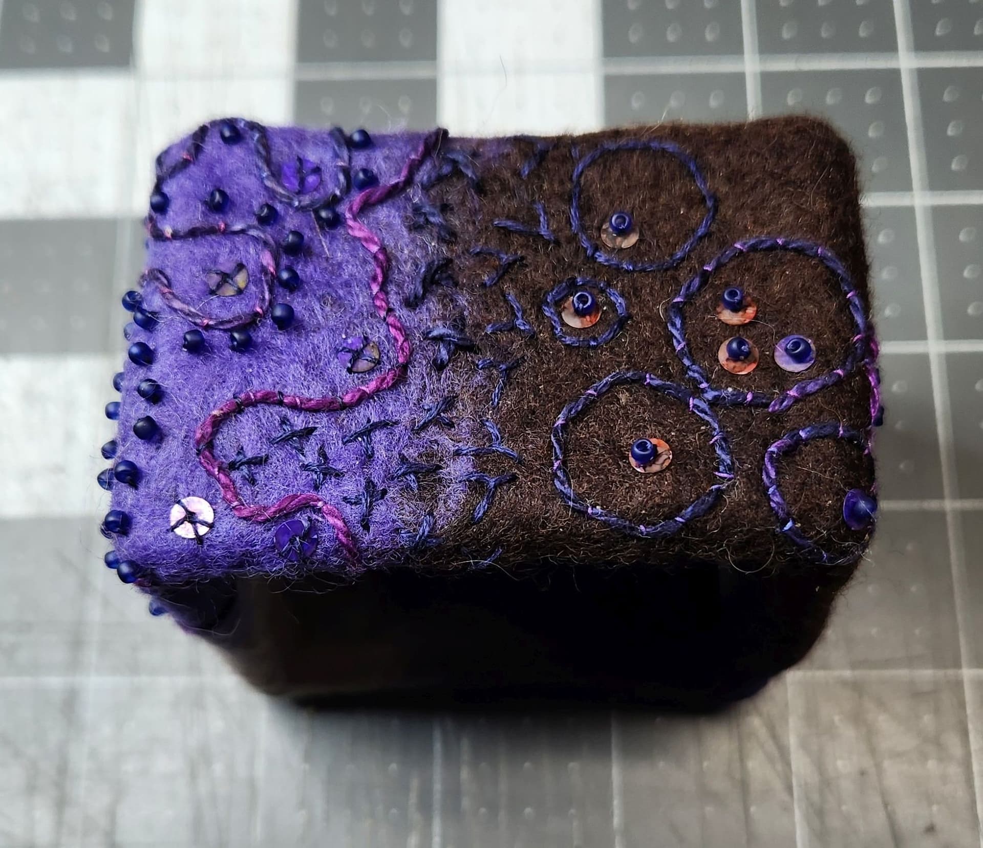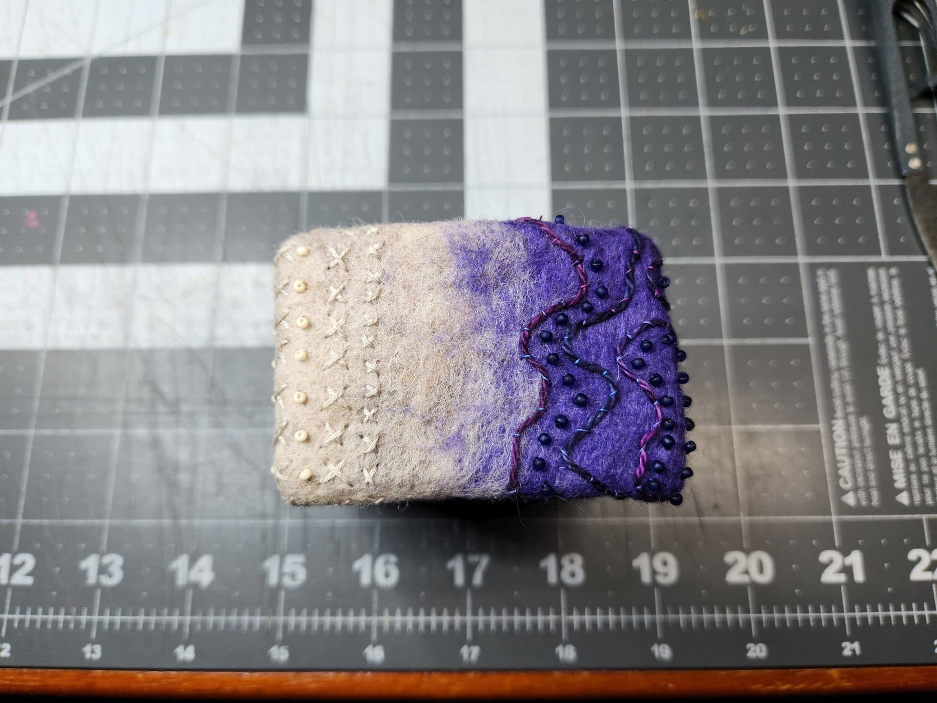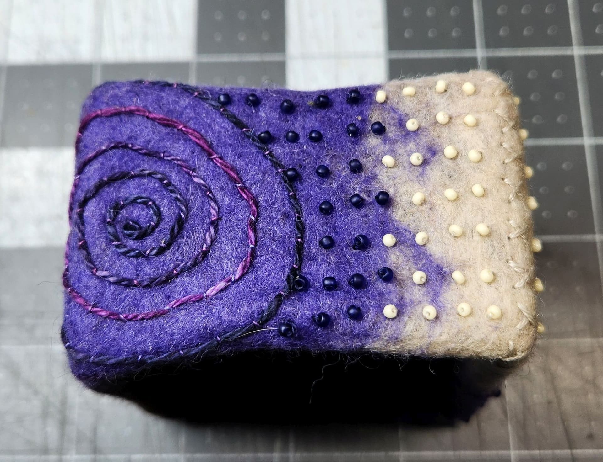I made a point of NOT using really hot water when wet felting the foundation on this bracelet. These colors were chosen because of a post @AIMR made about an afgan she created in these colors years ago.
