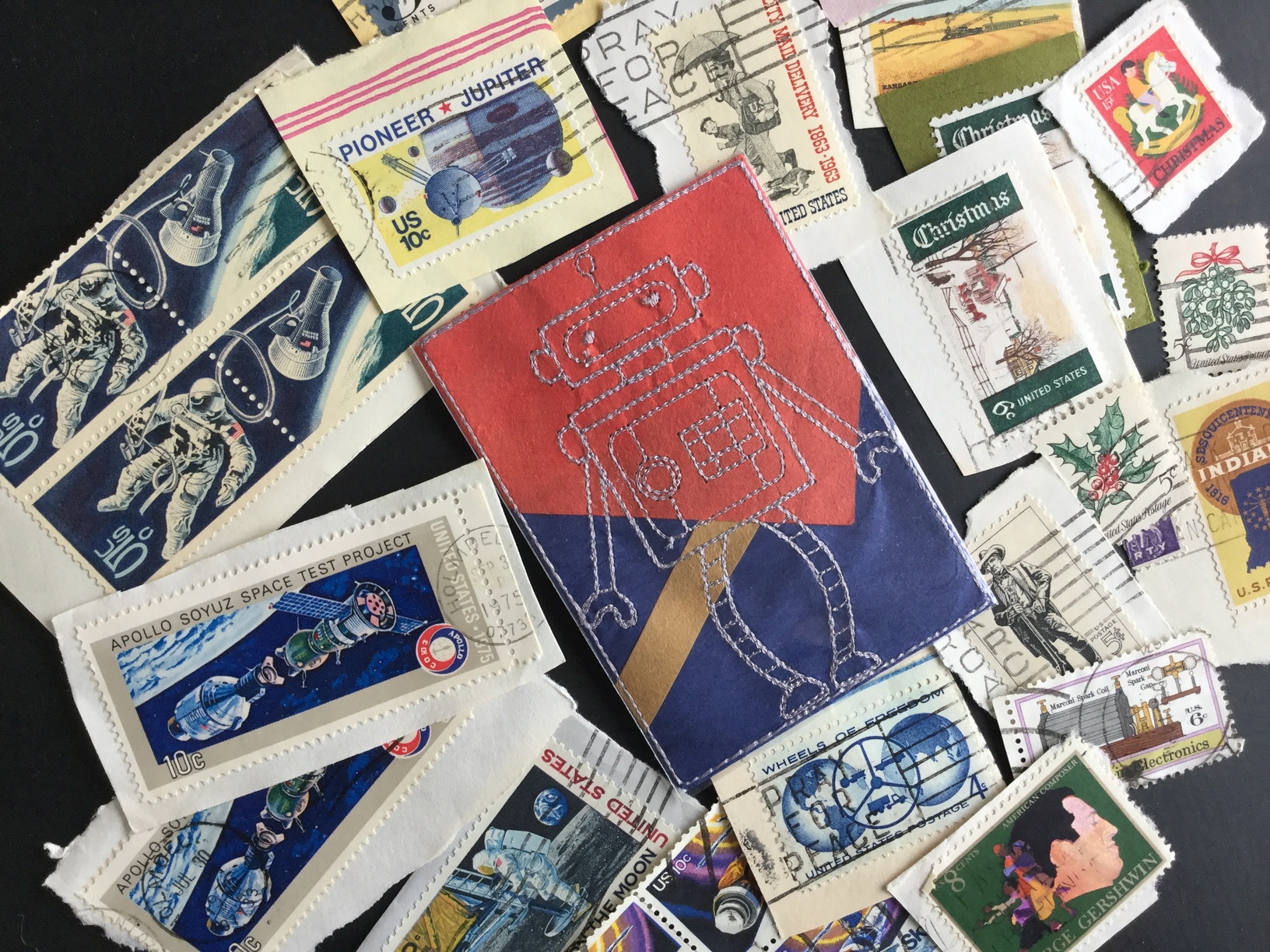 @thanate sent me a fantastic robot stitched on paper! It’s so precise and delicate! And bonus, she also some wonderful vintage postage stamps (space stamps zomg!!) as an extra!