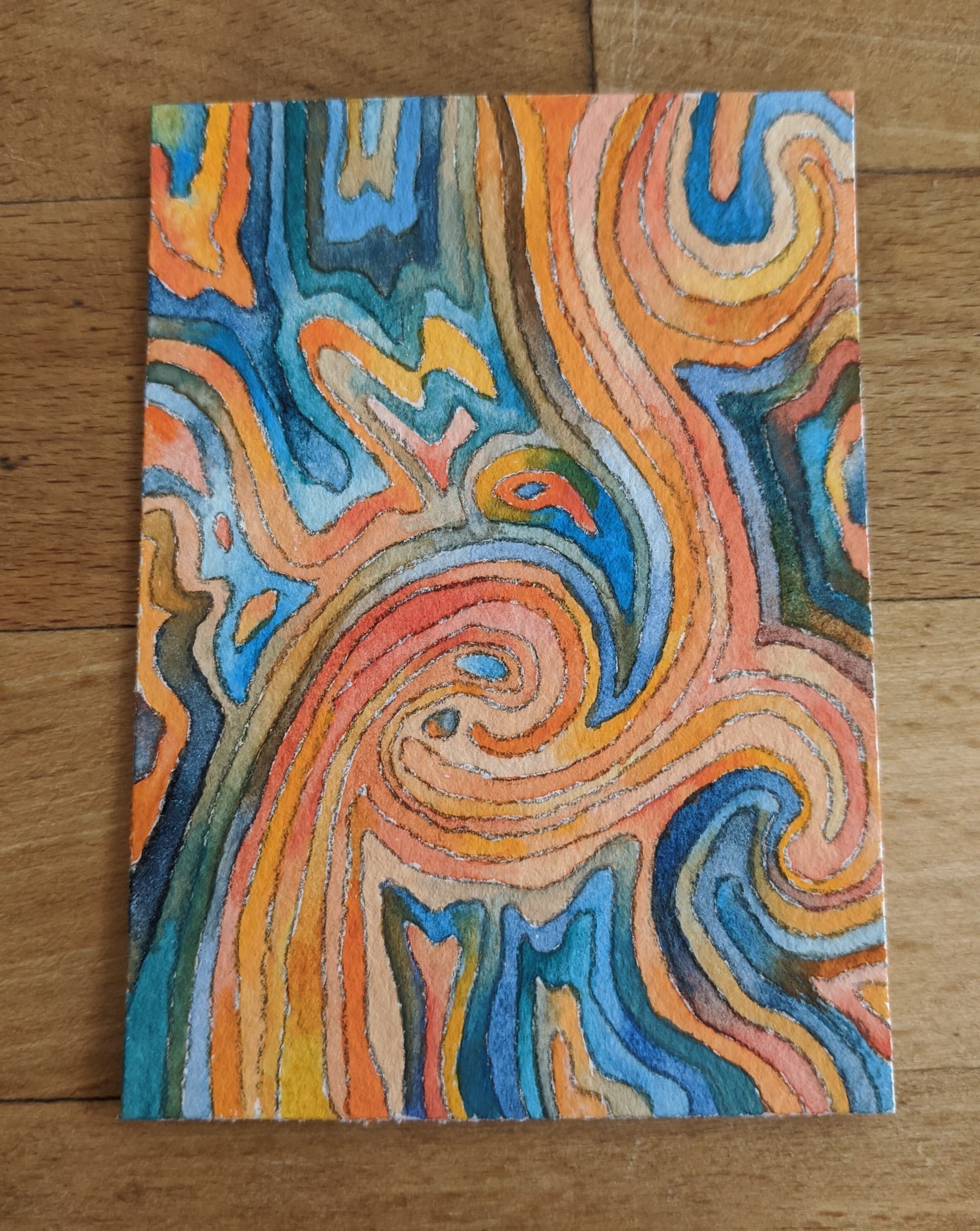 I received from curiousfae this ATC for my theme of a zentangle or doodle with orange elements. This is the kind of doodle she likes to create with her favorite colors. Looking at it it reminds me of the images I’ve seen of lava flowing into the ocean in Hawaii. The swirling of hot and cold together is mesmerizing.