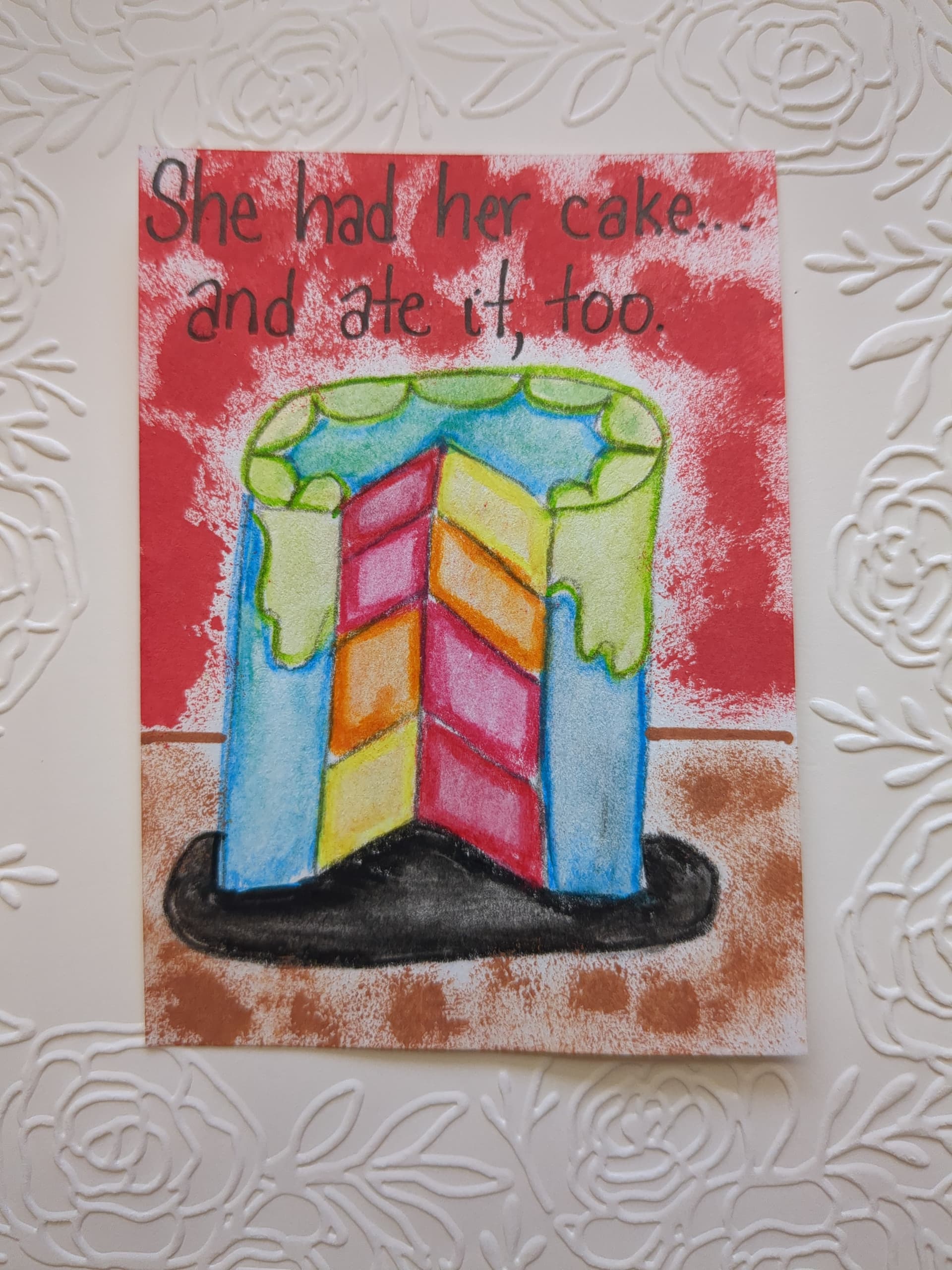 Here is my ATC from @Lynx for my slice of cake theme. You see, the slice of cake had been eaten so this is what is left. In actuality, the first ATC which was the wedge of cake did not arrive. I think it’s a funny way to continue the story of the missing piece.