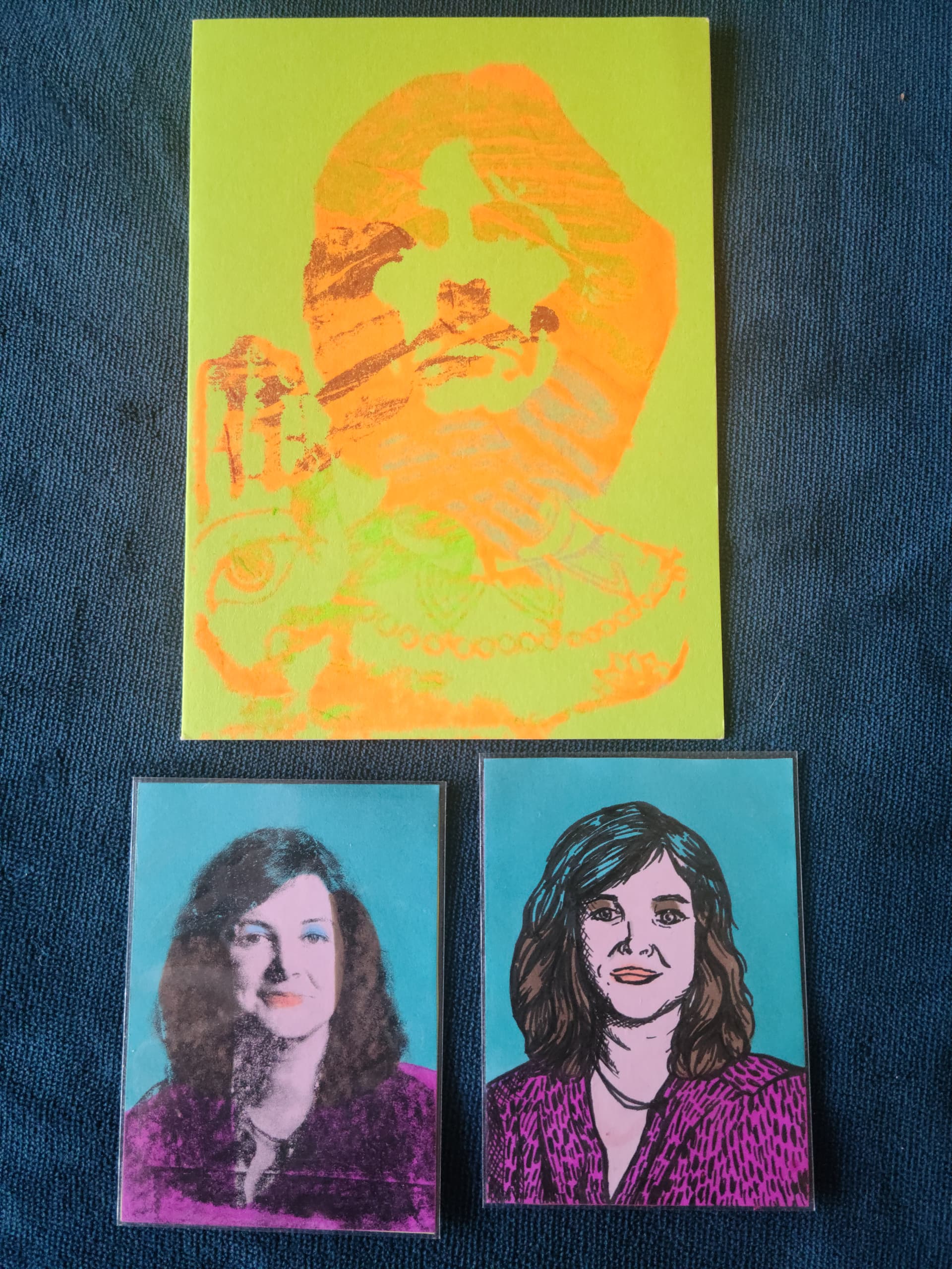 The one on the right is actually hand done with marker. It was my first attempt at a Warhol-esque self portrait, but it just didn’t shmeck for me! Then the parchment transfer idea popped in my head and I had to try it out.