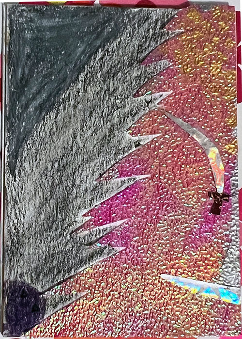 I received a shimmery iridescent card from @coryjo ! It’s called “locking down the hoard” and she says her inspiration was from a book where a dragon melted her hoard for a nest and to make it harder to steal.