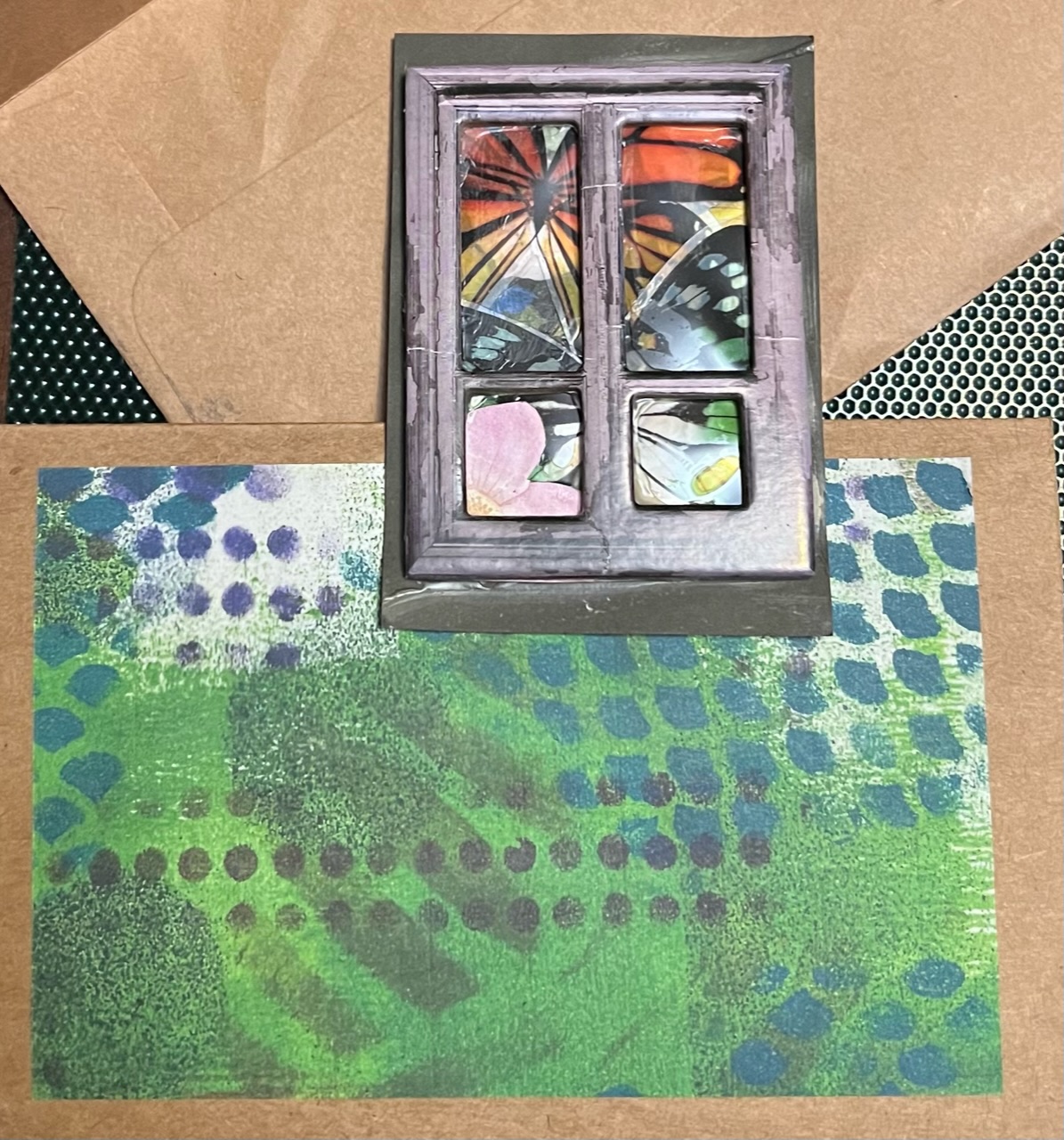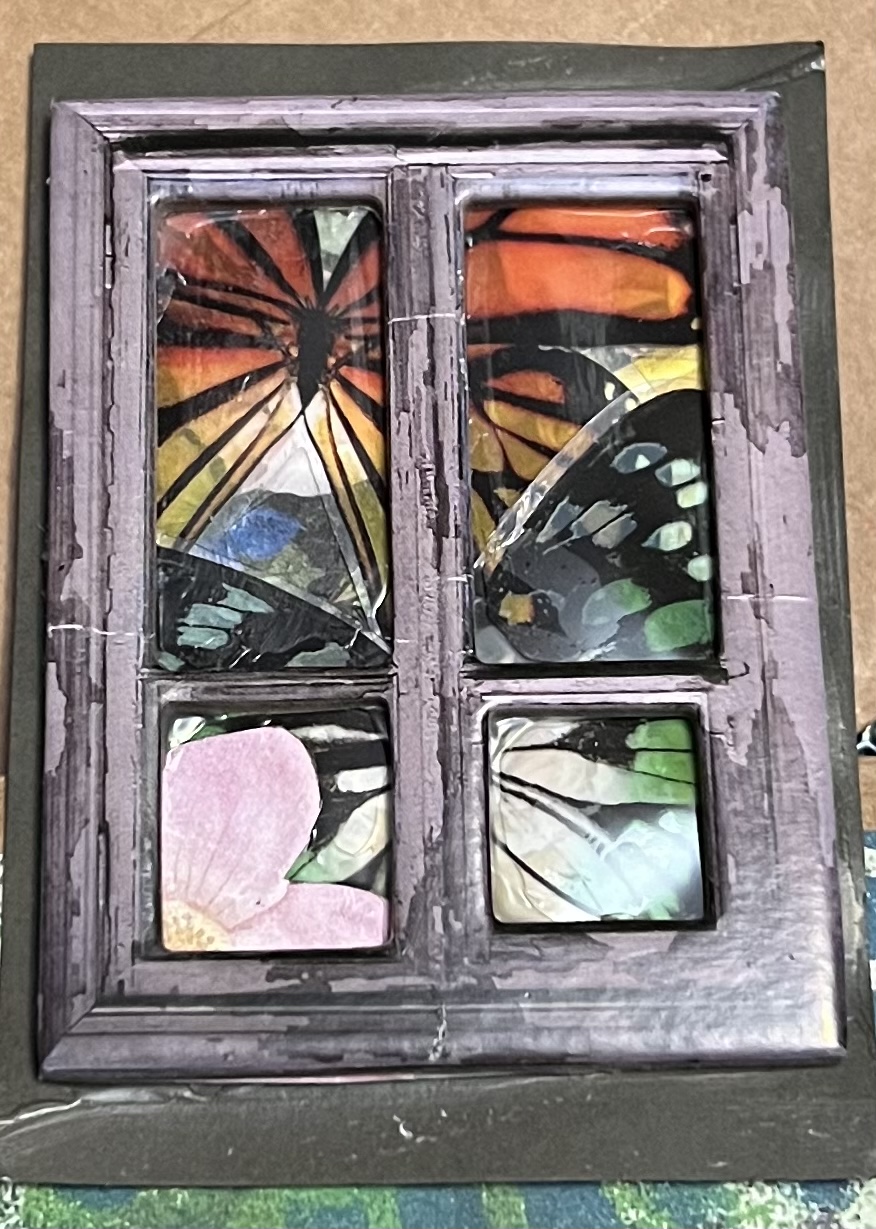 She said she used a variety of different Tim Holtz components: flower, butterflies, and window frame. I love it! The colors are vivid and the layering of the components gives it such depth.