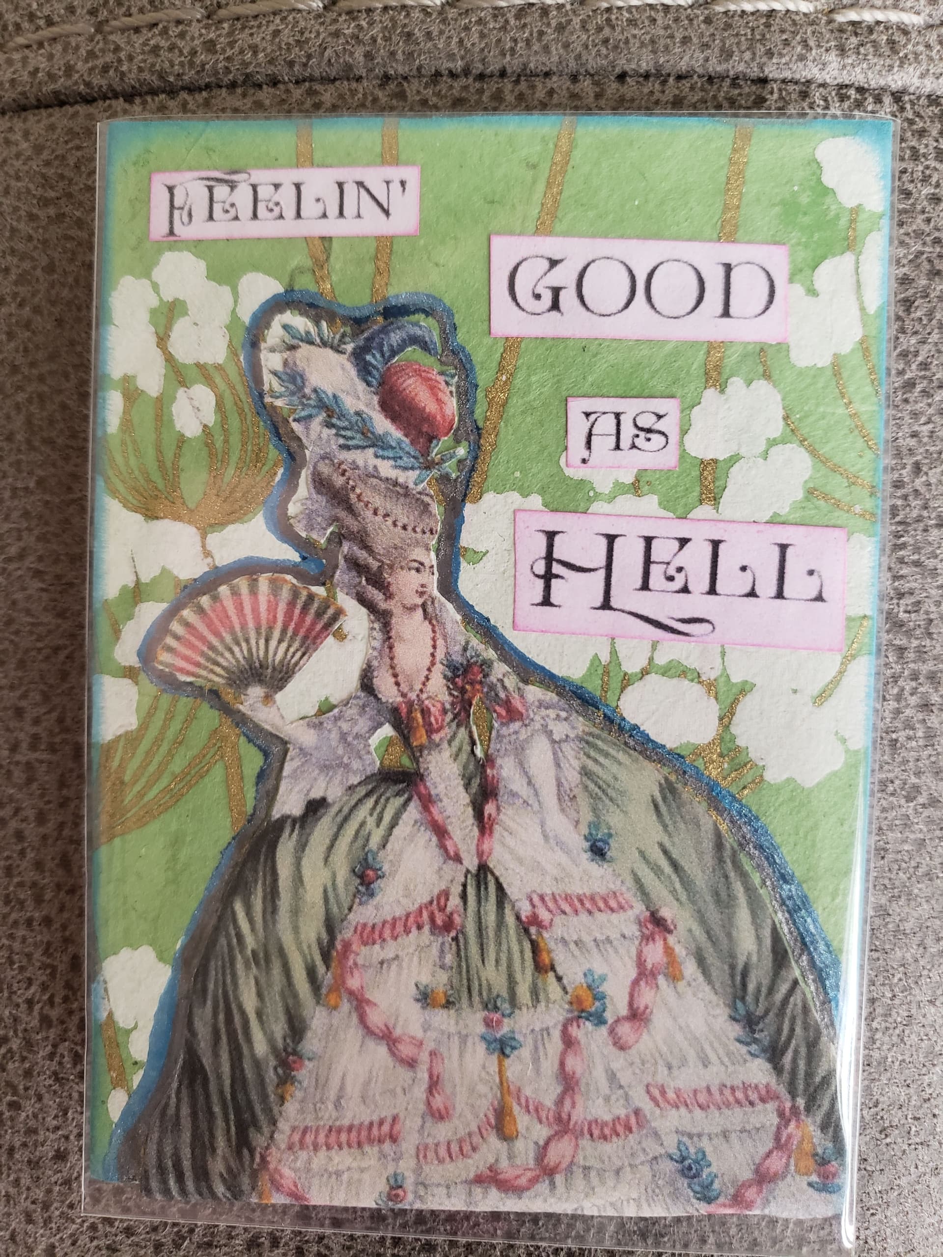 I received a lovely card from @irid3sc3nt for my Victorian Imagery theme. It’s titled “Feelin’ Good,” and has a quote from the amazing Lizzo. She used Nepalese paper for the background and Sakura pens & colorbox ink for details. It’s a fun card. Thank you Carissa!