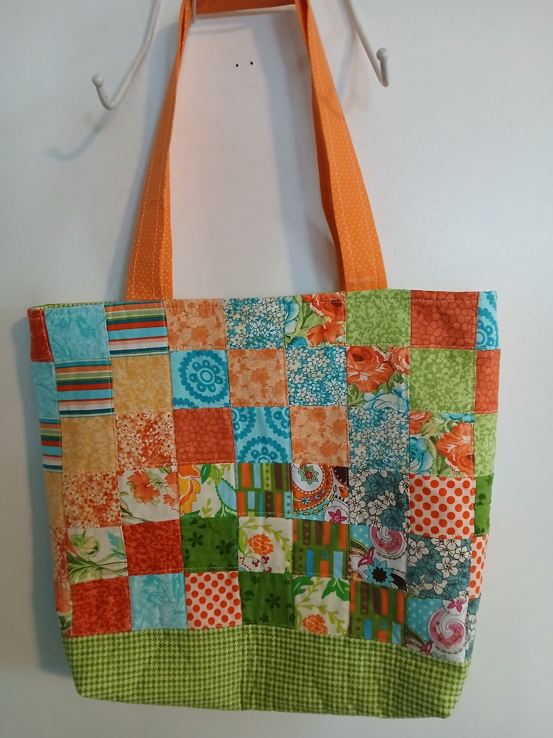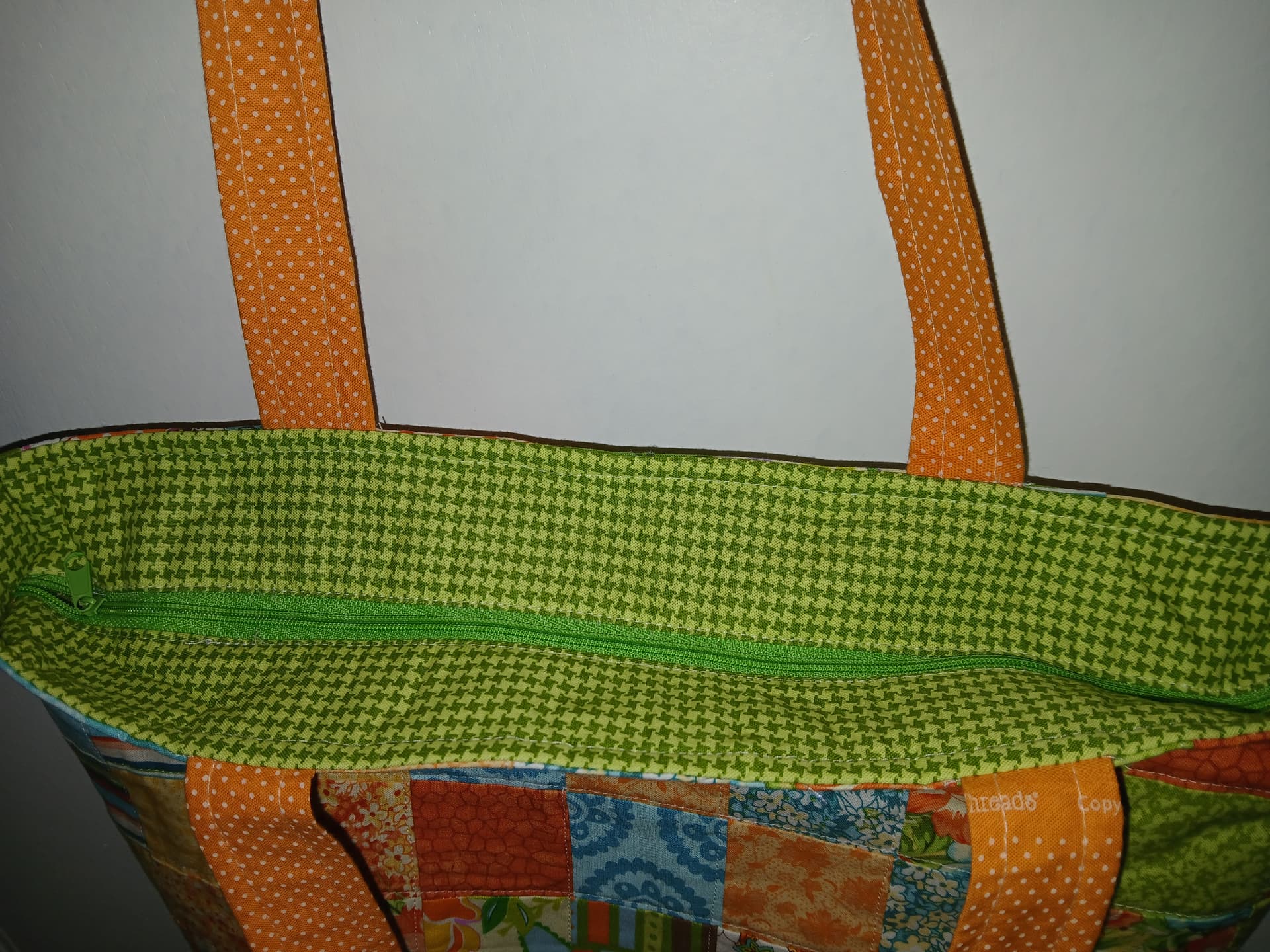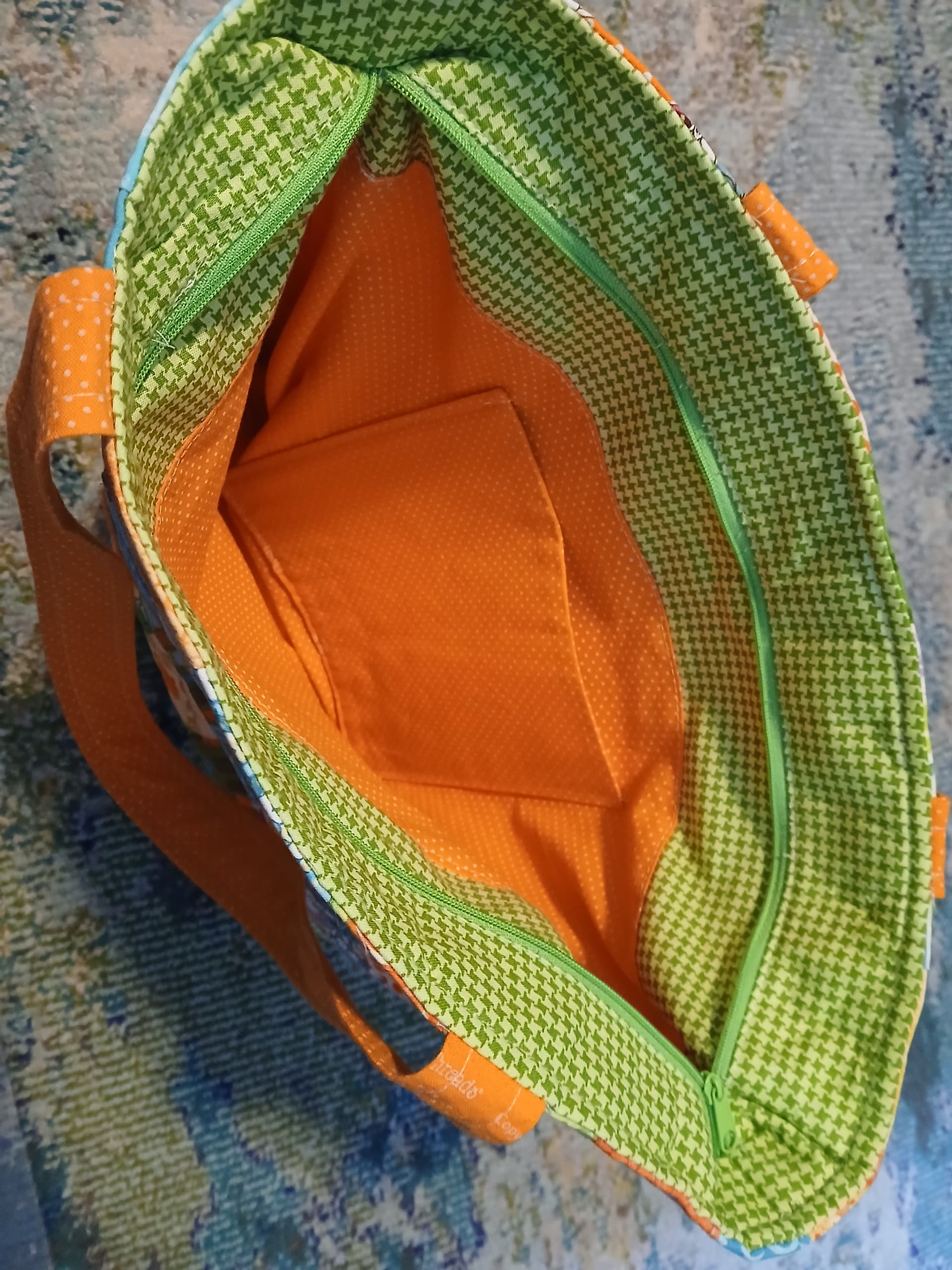 Whoever did the blocks did a great job. You did great by crafting them into a tote. Love the top zip and the colors. Very bright and cheery!