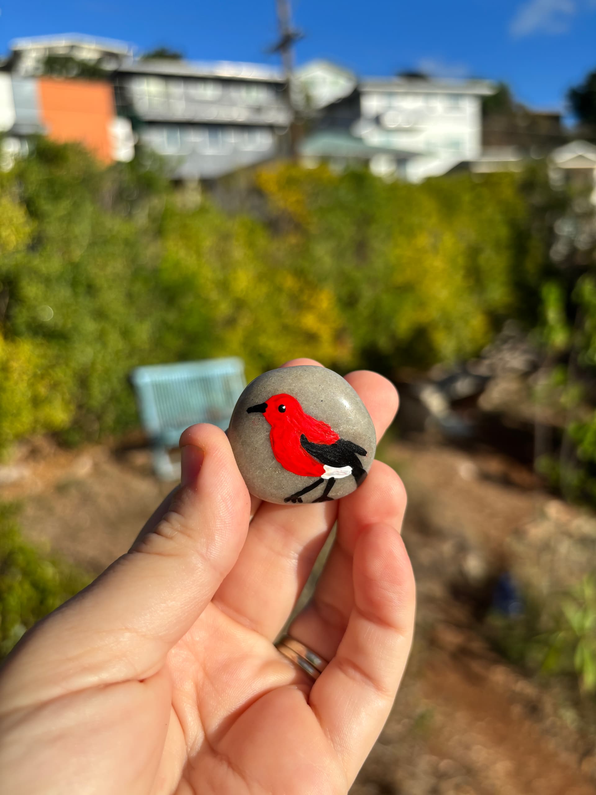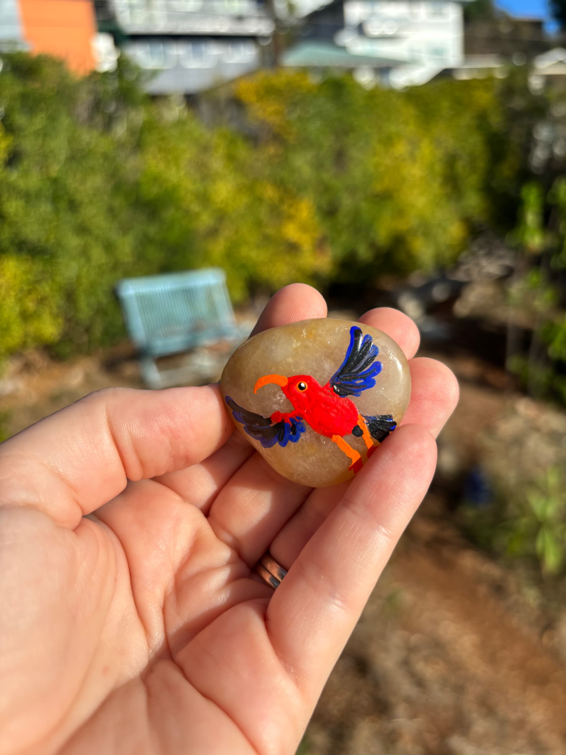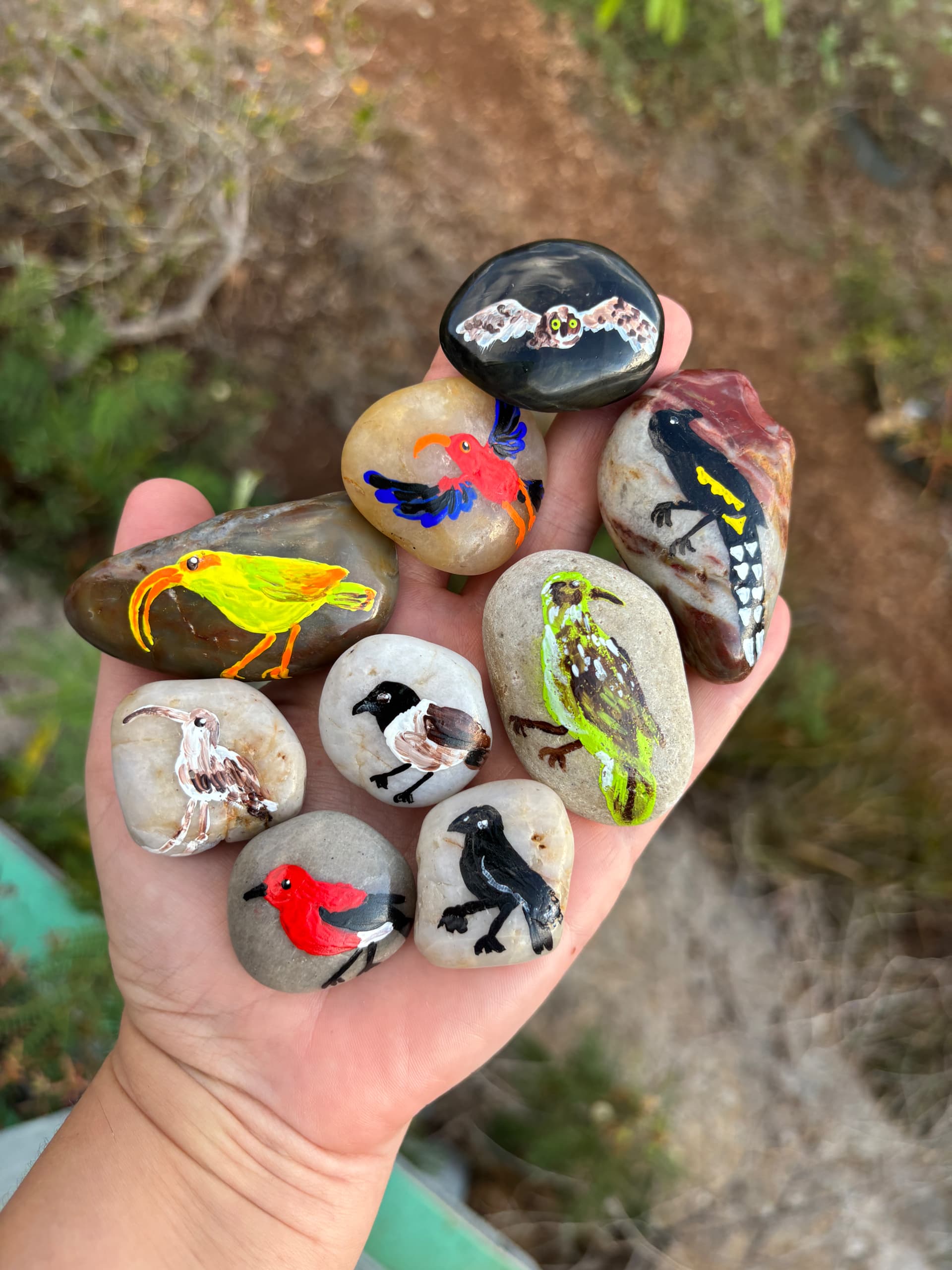 Some of our local conservation groups have created lists too, and I randomly decided I was going to paint a rock for our list of native manu (birds) created by Birds Not Mosquitoes, Birds_Hawaii_Past_Present, and Aloha Post, and is mostly on Instagram. (The calendar/list can be found here.)