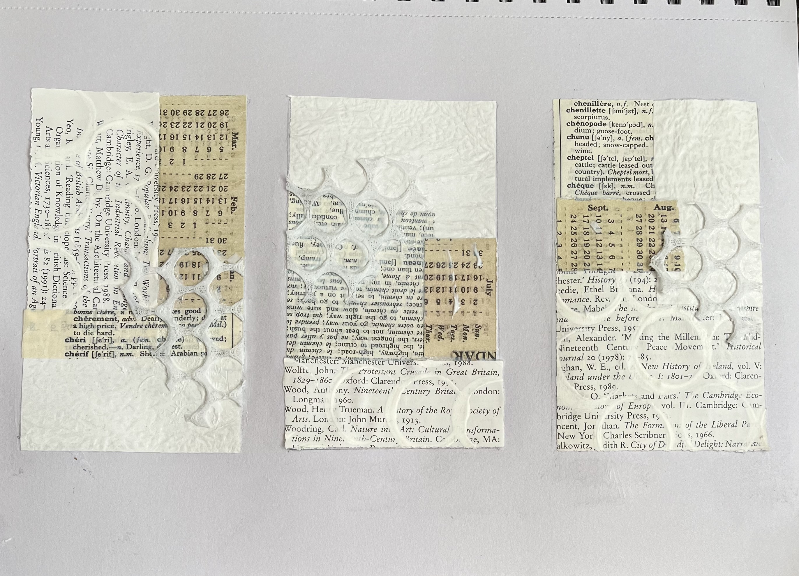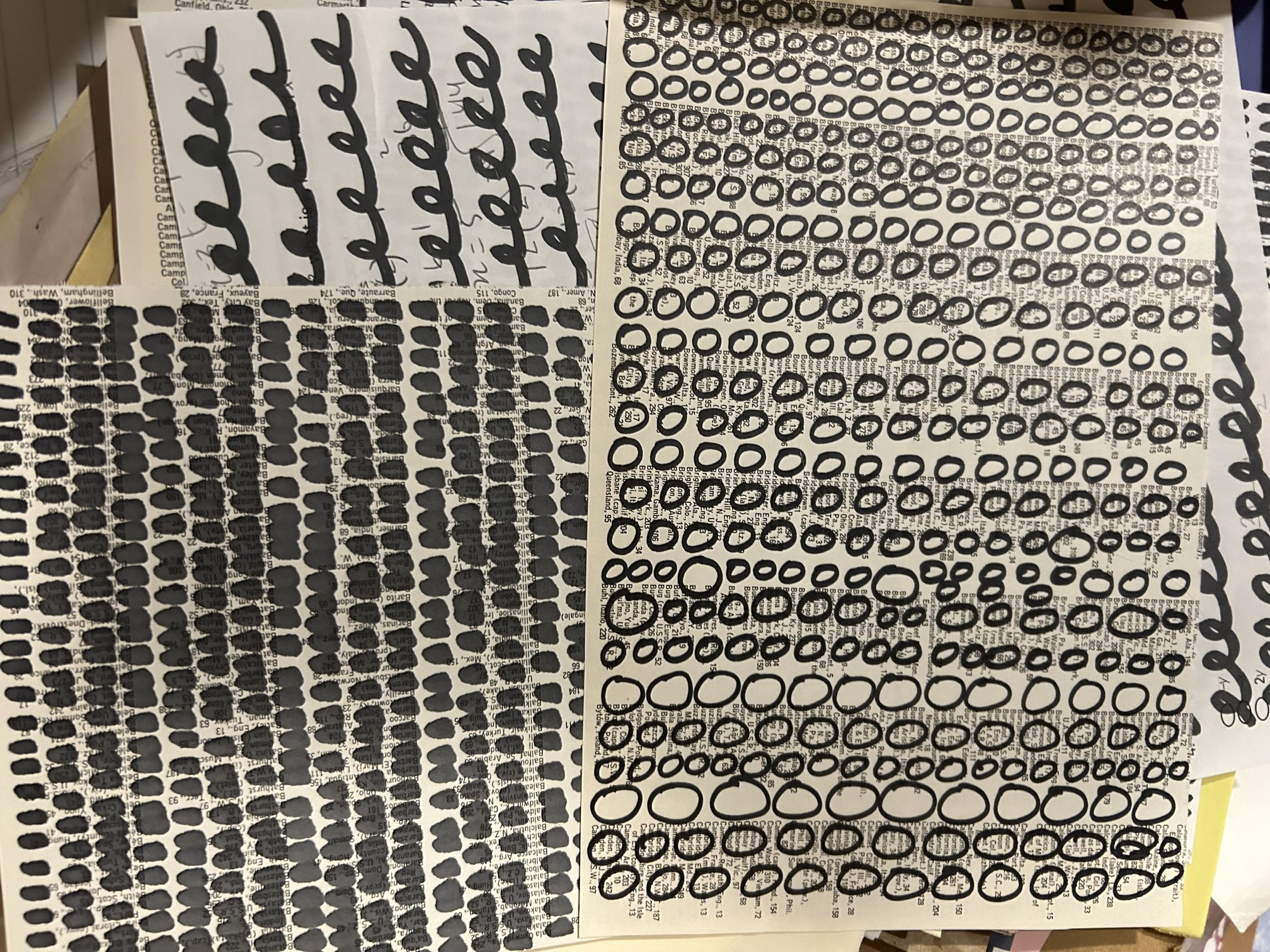 I’m making a stack of random papers - Kraft packing paper, book text, some vintage things, and every kind of white paper in my house. Then when taking a break from cleaning/organizing, I use the collection of black pens to make marks. I need to look at my Pinterest & Instagram saved posts to try some new marks.