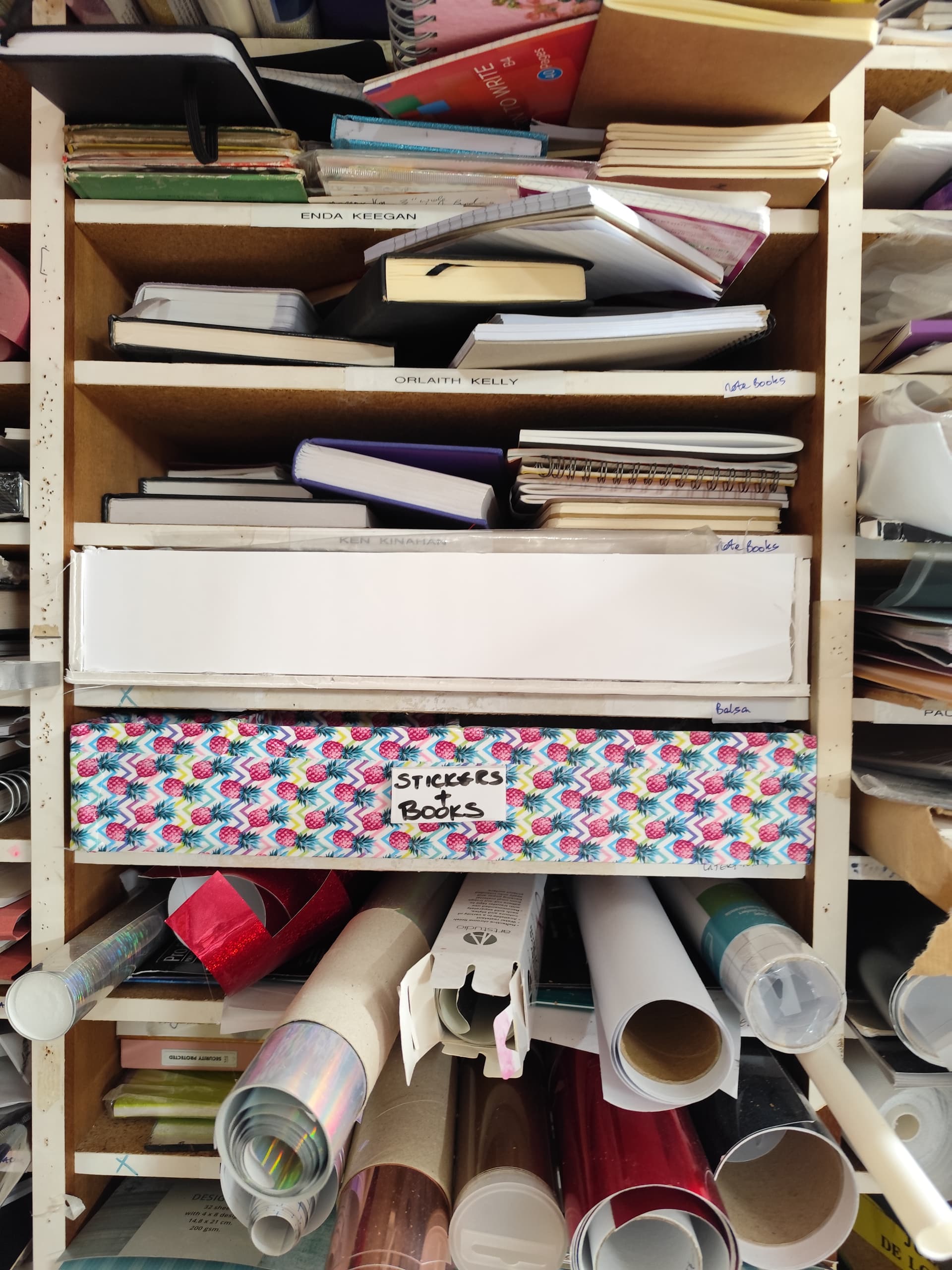 In the meantime, I made this organising tray so that I can access different sticker types more easily -trays are made from foam core board, hot glue and duct tape.