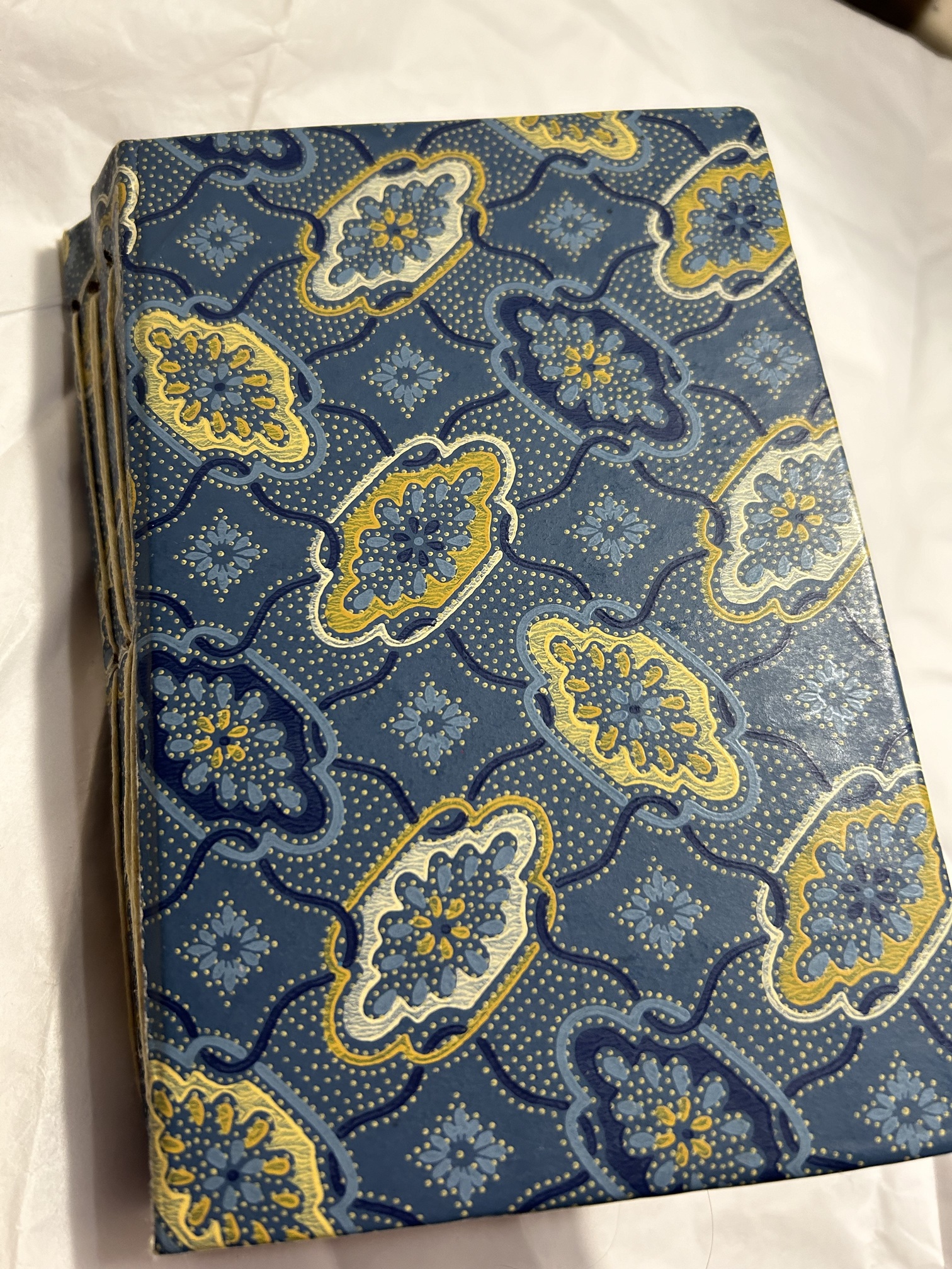 This is an altered book - I found the wallpaper at the creative reuse store and used it for the cover.