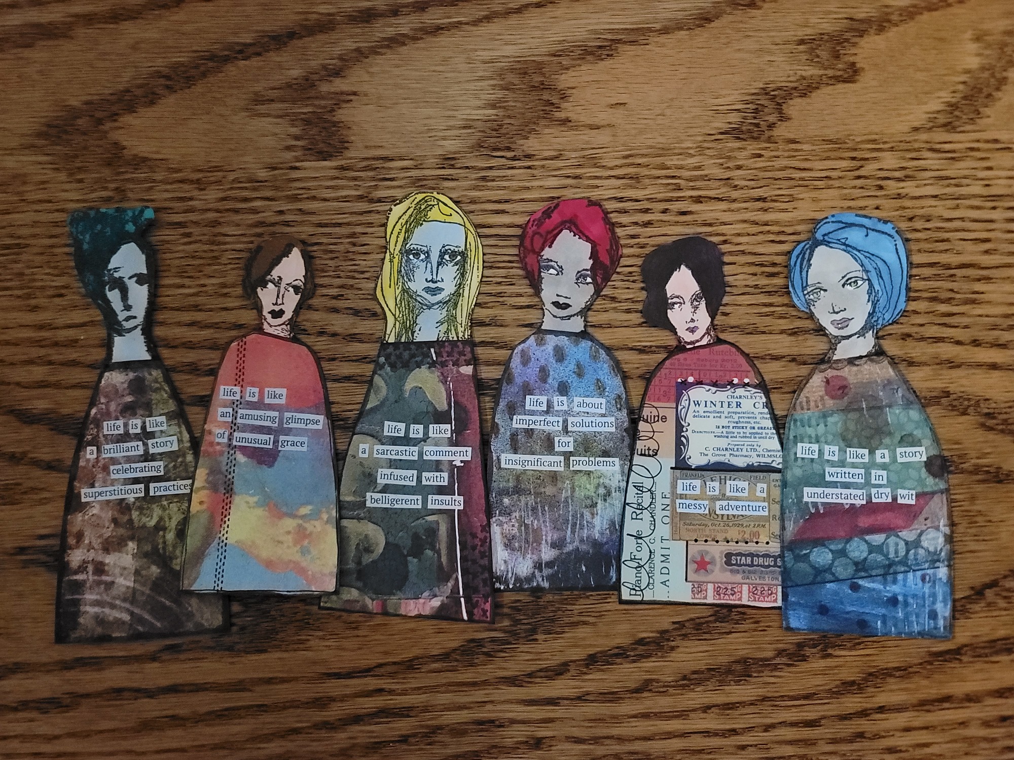 I also will make some bookmarks out of these and my kimono dolls and just randomly hand them out or give them to people. There are eleventeen hundred women that come to drum circle and I am sure many of them appreciate a little bit of weird.
