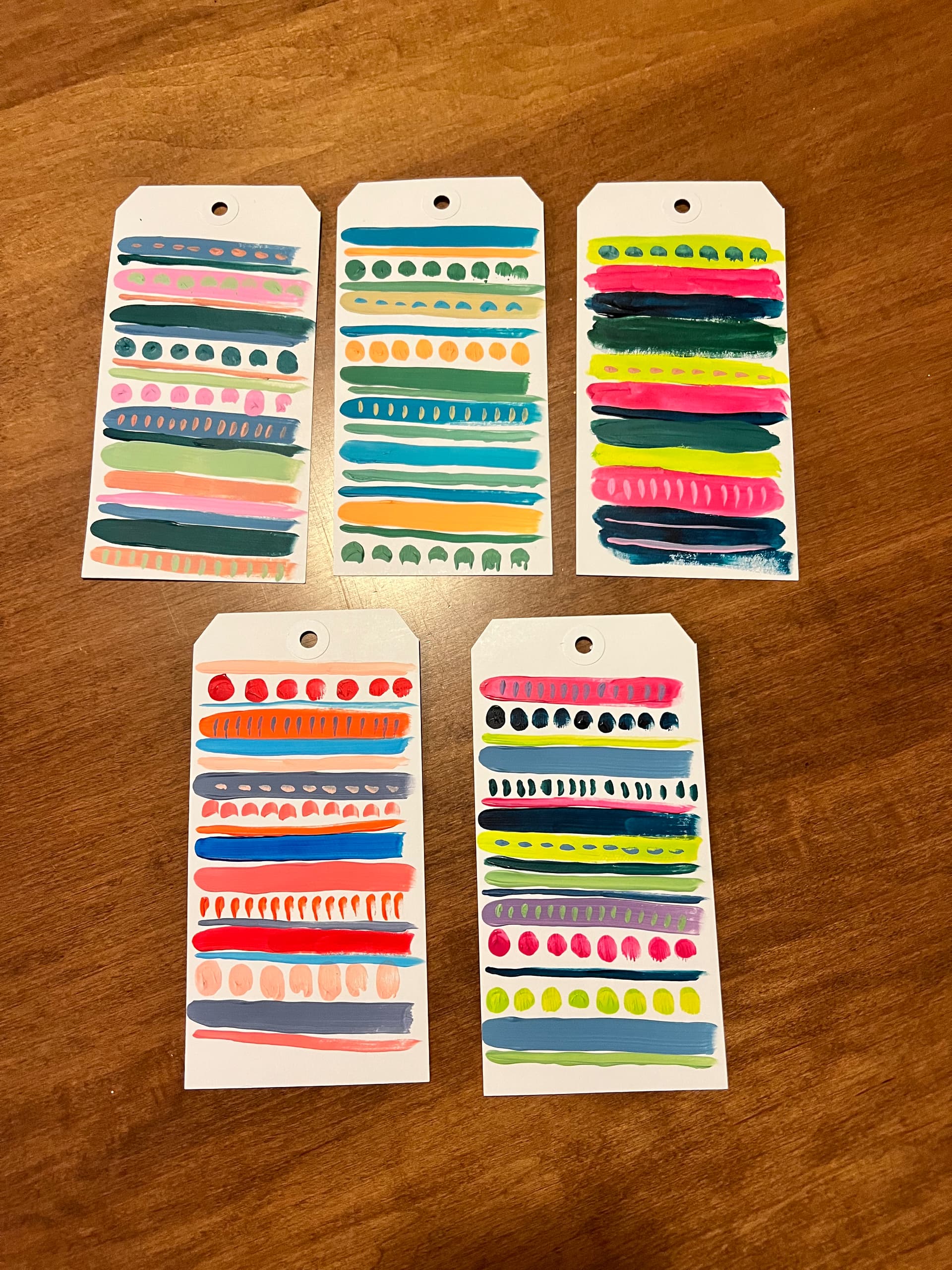 Tonight’s Under the Influence class was inspired by creativechaosstudio.returns. These color scheme tags were fun to make and I can see making a ton more and adding lots more marks and doodles.
