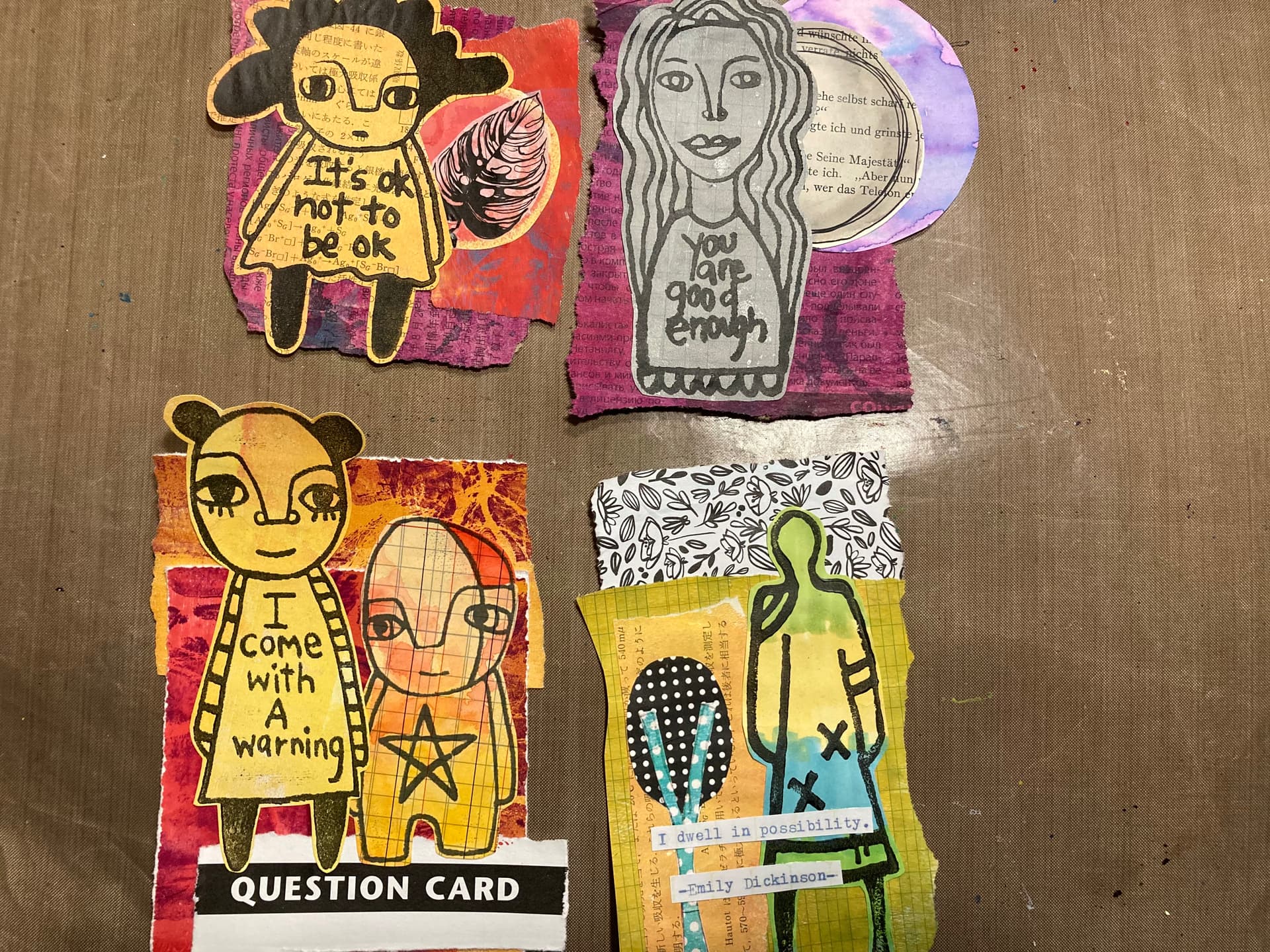 Some are stamped on painty papers and some I colored with alcohol markers. I used up a lot of gel prints and roll-off papers. I want to stamp these on muslin to make mini dolls. I’ll save that project for after my inchie dice are done.