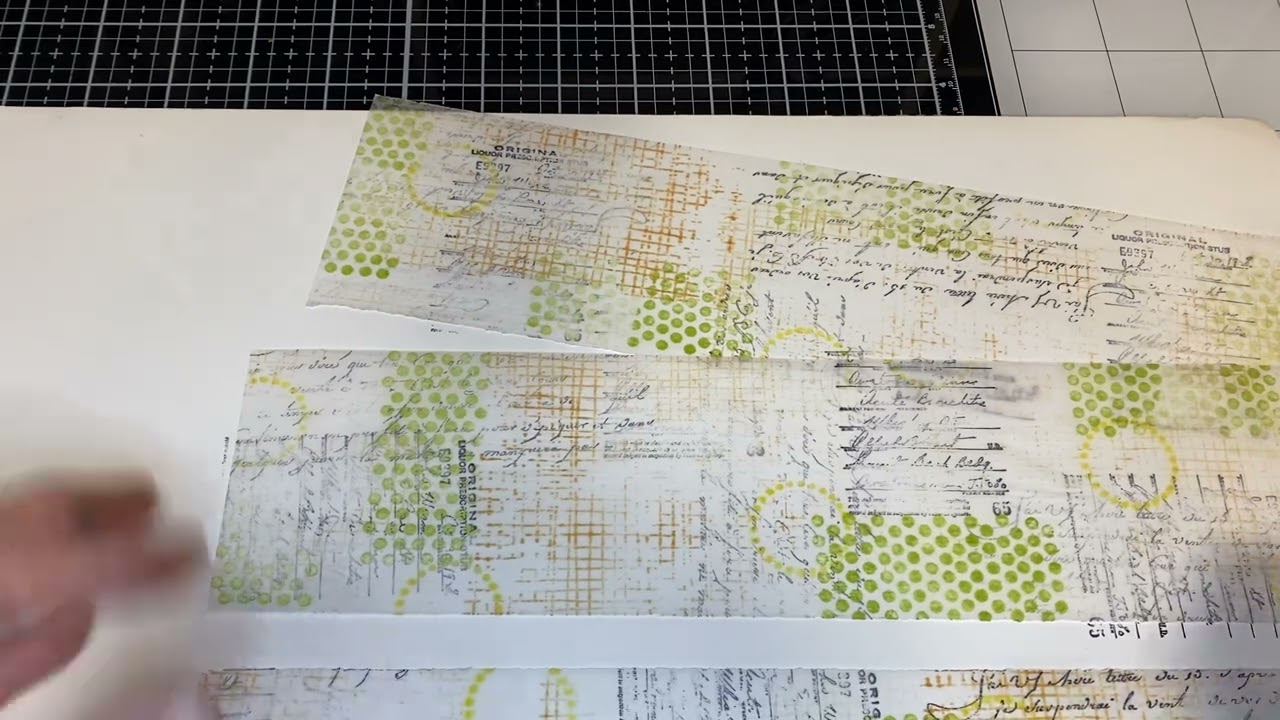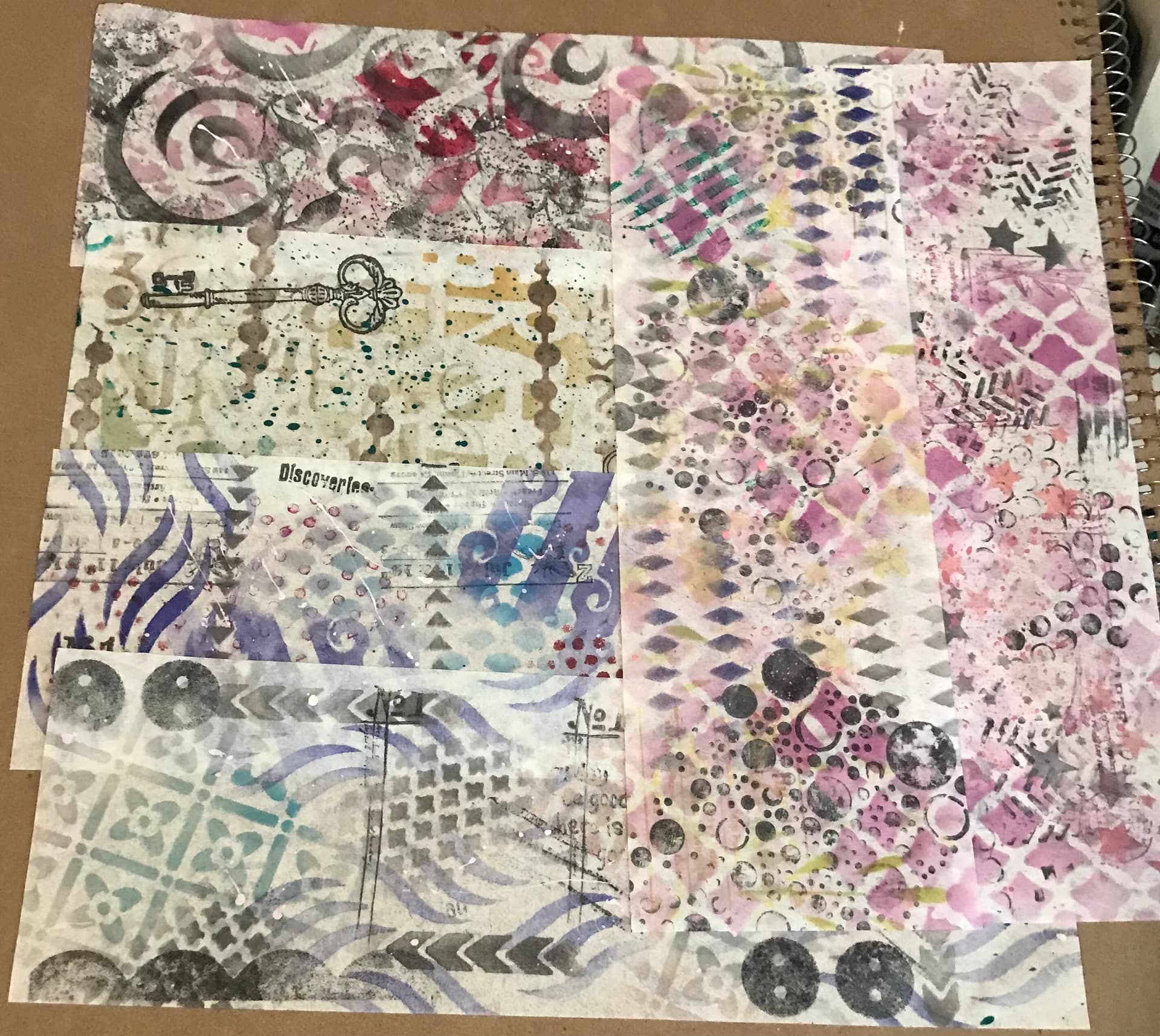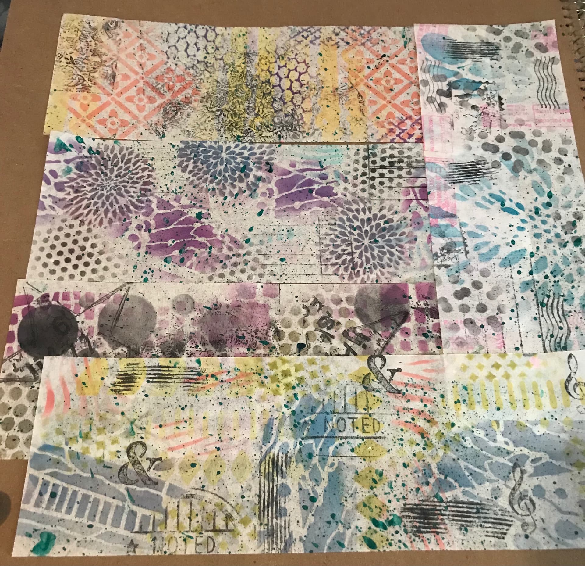 Basically you take strips of tracing paper and stamp and stencil on them to make a stash of collage fodder
