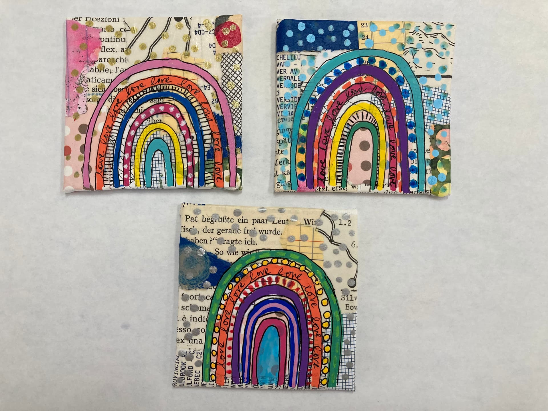 Some WIP mini canvases - a combination of several art lessons. Collaged background, painted rainbows, and doodling. These are on 3” x 3” canvases.