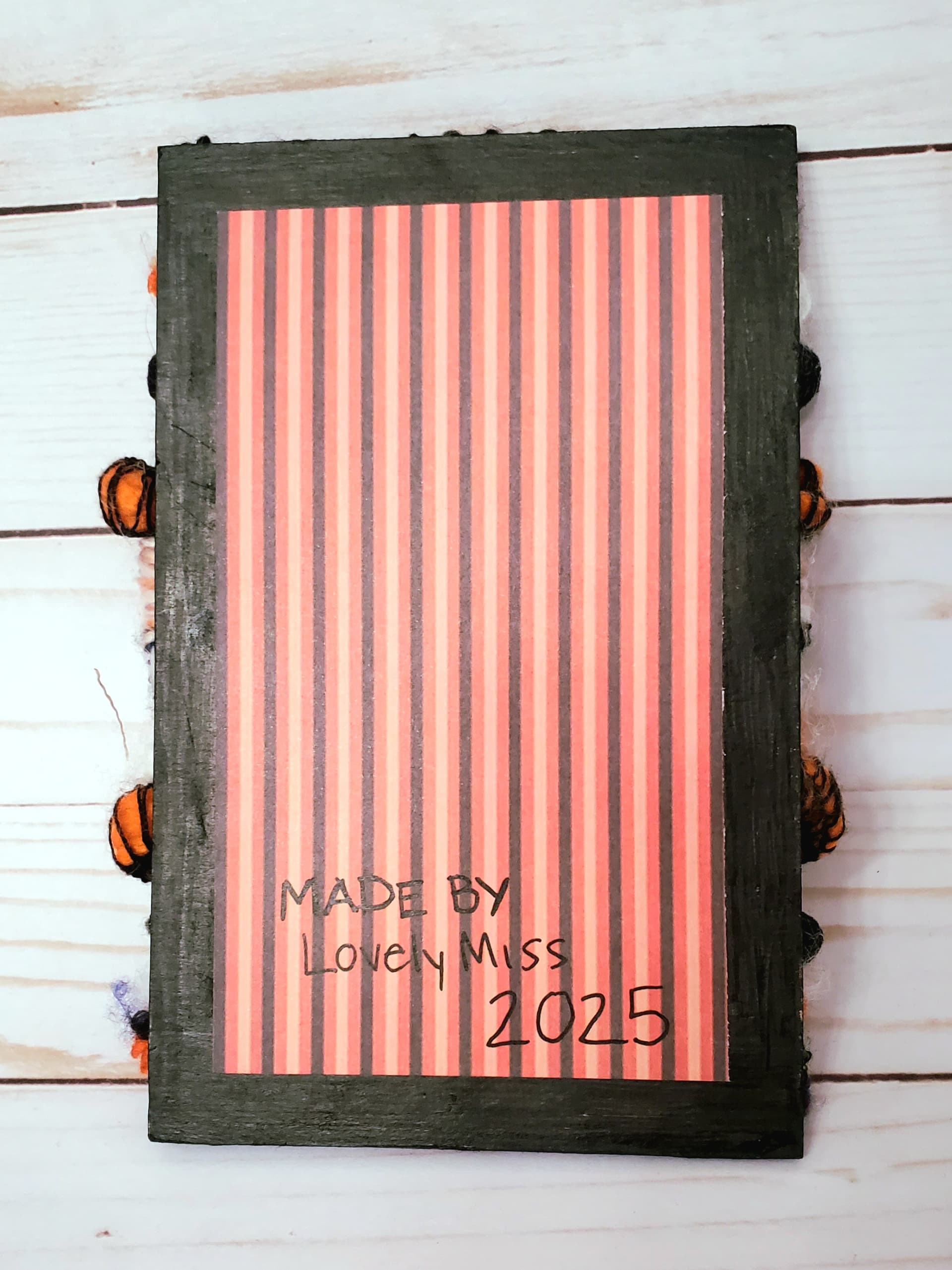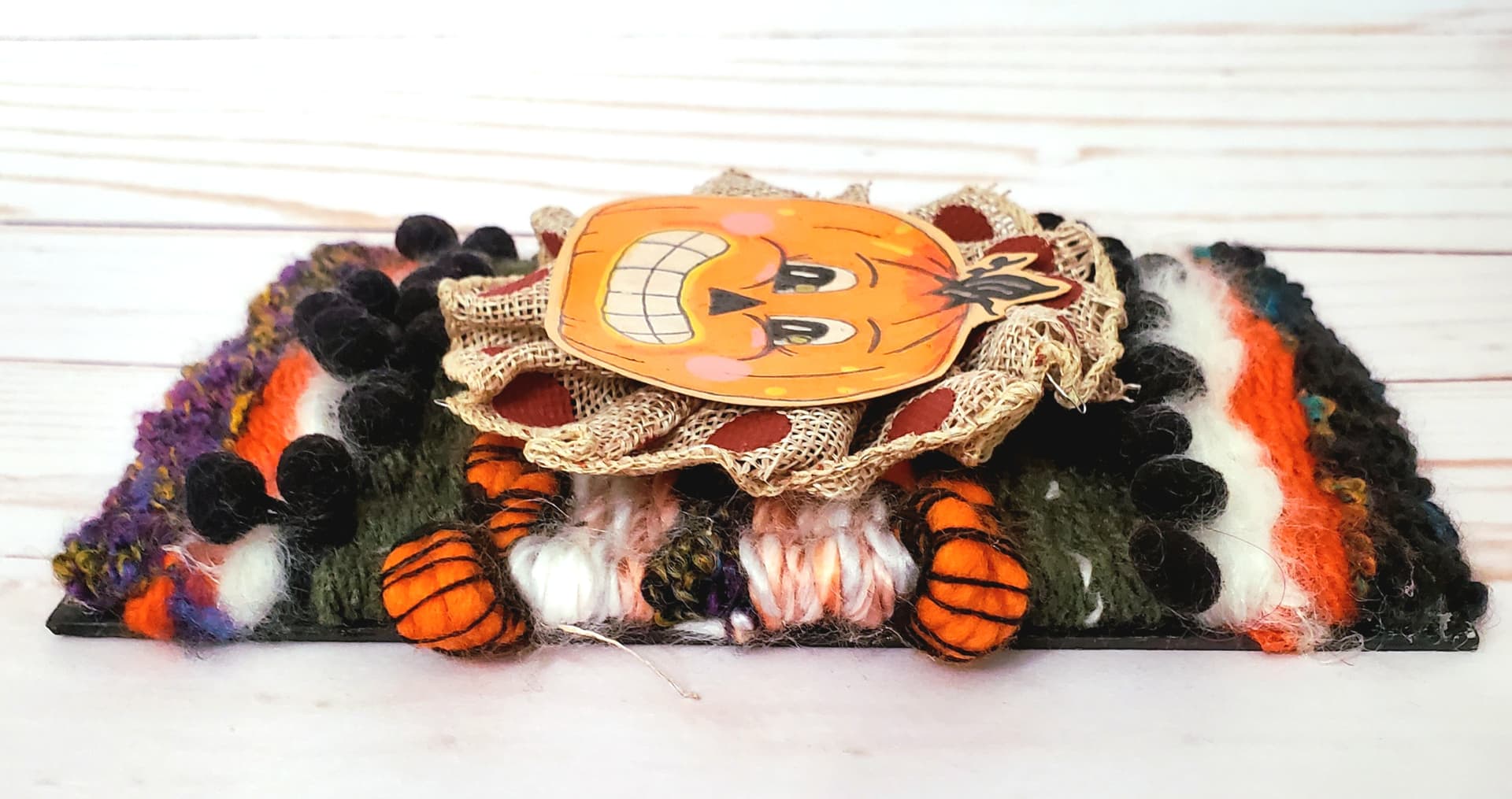 I made the background with a peg loom and a bunch of long-saved special and Halloween-y yarns and fibers. It is glued to the board, though I did so sparingly so it wouldn’t seep through.