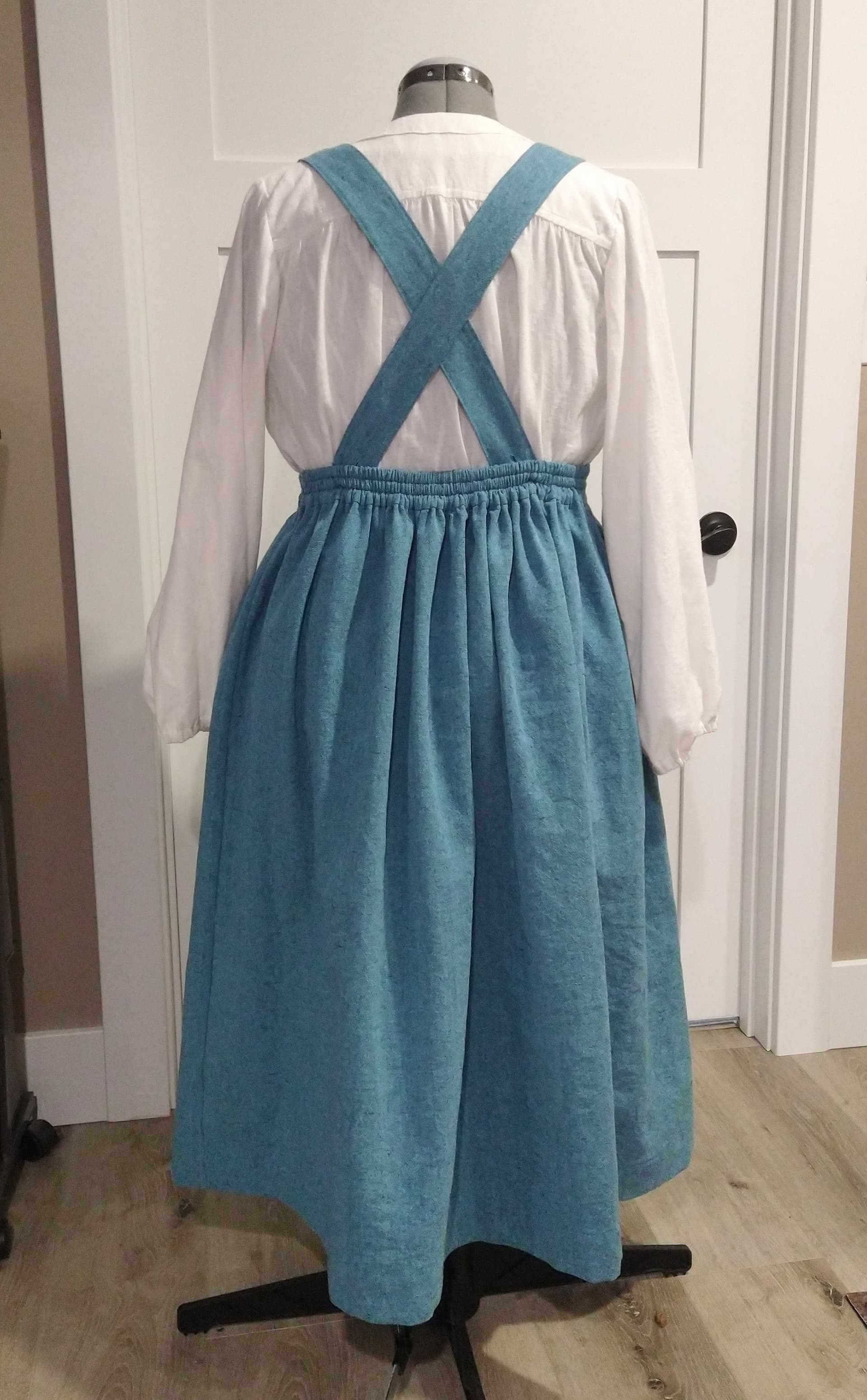 The pattern is called the Pegasus Pinafore Dress. The fabric is a 50/50 cotton and linen blend by Robert Kaufman. The warp and weft are different colors, turquoise and navy blue, so the color has a nice depth to it. I used the sizing chart in the pattern, but needed to remove about six inches of elastic in the back once I tried it on. I would definitely size down the next go around.