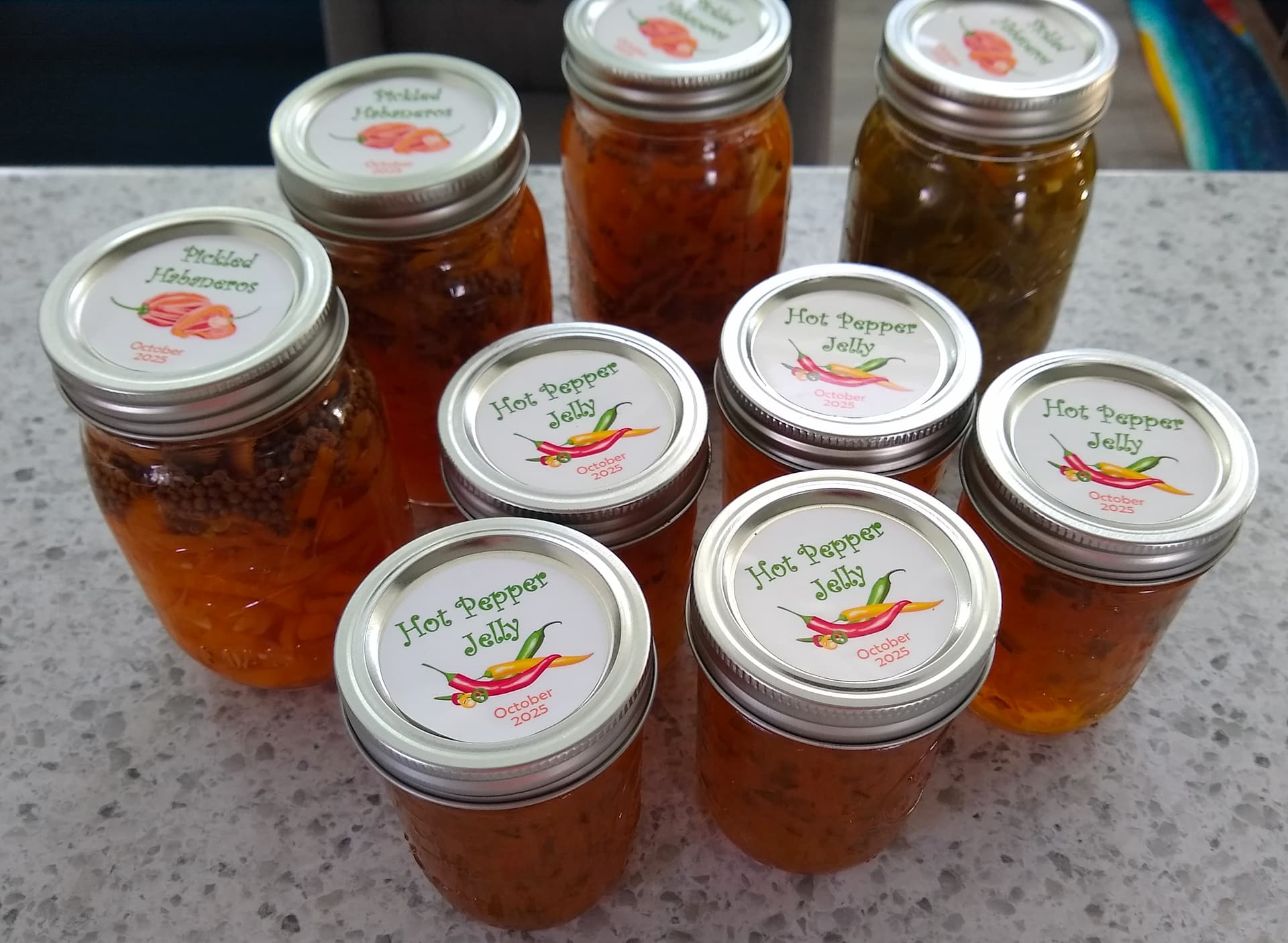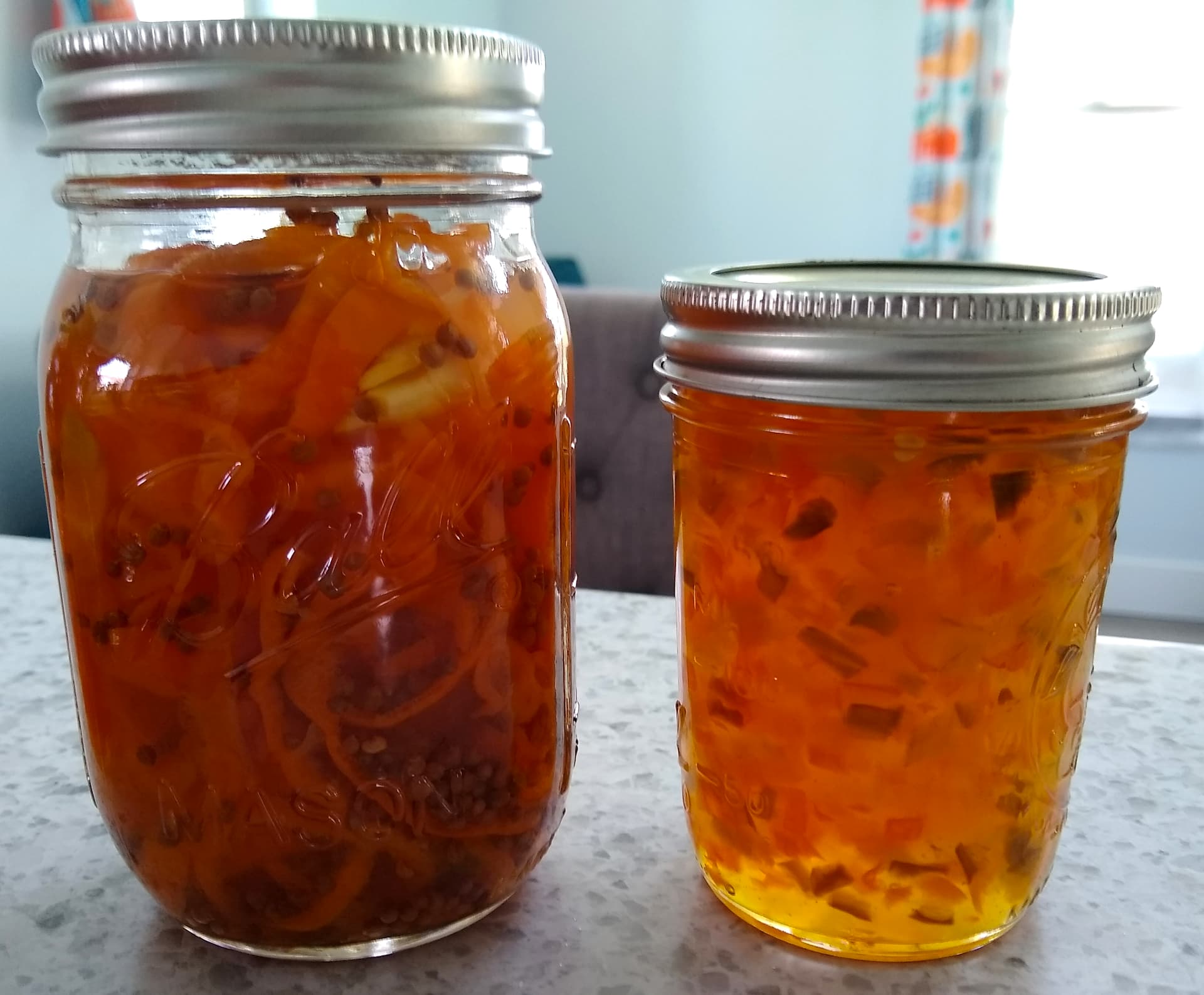 Many people I know love Pepper Jelly (served over cream cheese with crackers), so I made two batches. The first batch I made in September and followed this recipe. It was not hot at all. Like I’m not a big fan of a lot of heat and I found it mild. So for my October batch, I did 4x the amount of habaneros (reducing other sweet pepper quantity accordingly) and it does actually have a little kick.