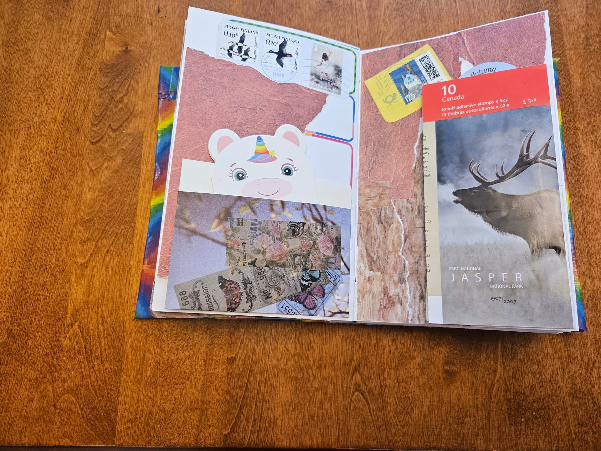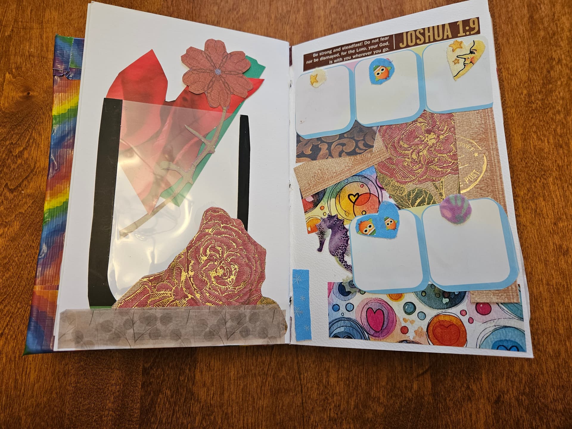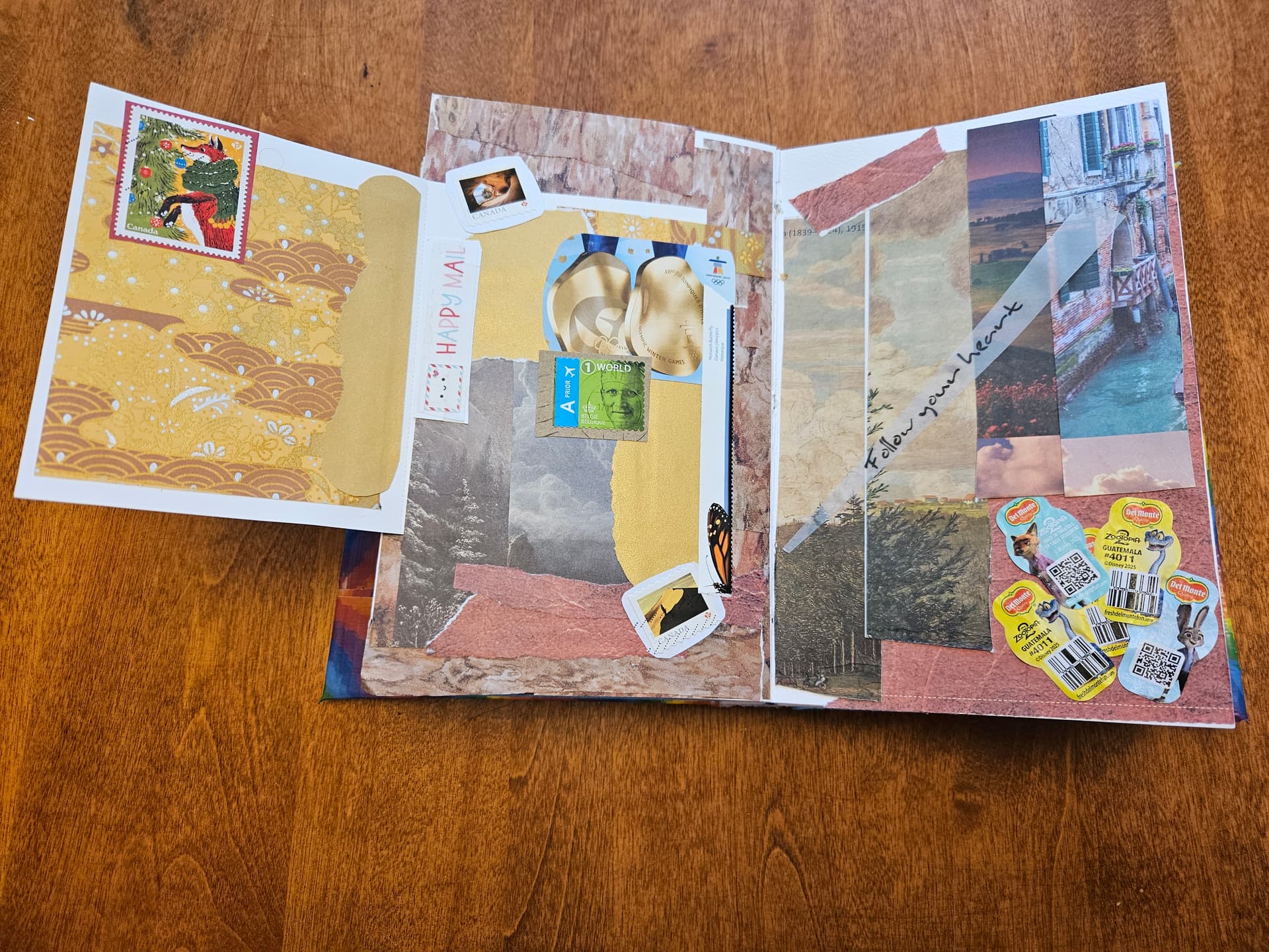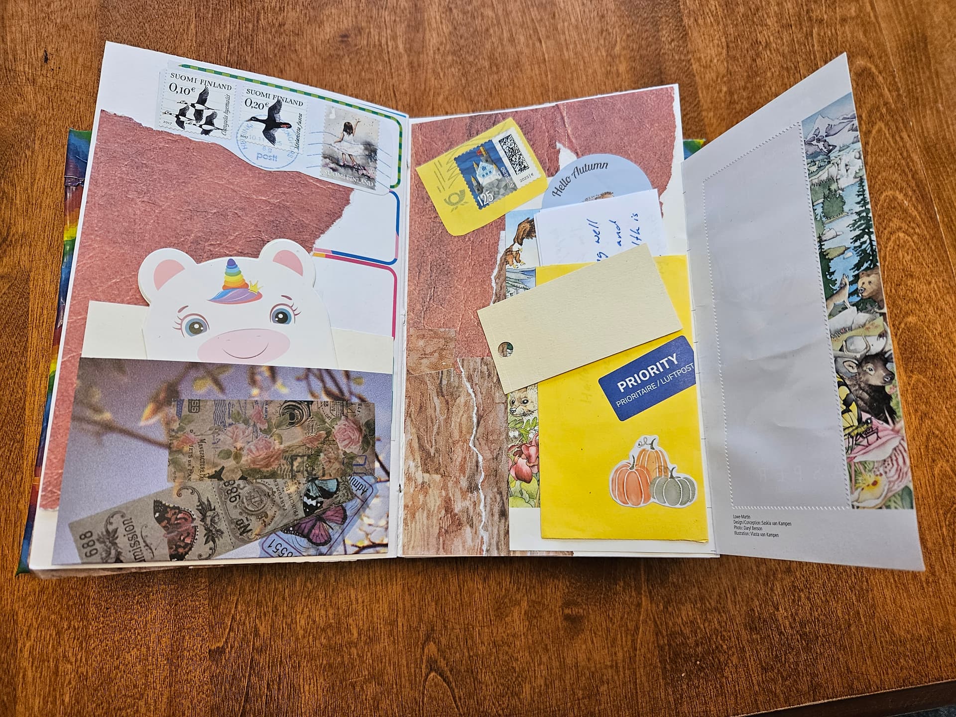 The page below on the left is pure collage with bits and scraps of paper, and a nice quote I saw in a magazine. The page on the right has the flip-down element, which I created by using an empty stamp booklet. These are not recyclable because they’re sticker backings, so you might as well make some art with it