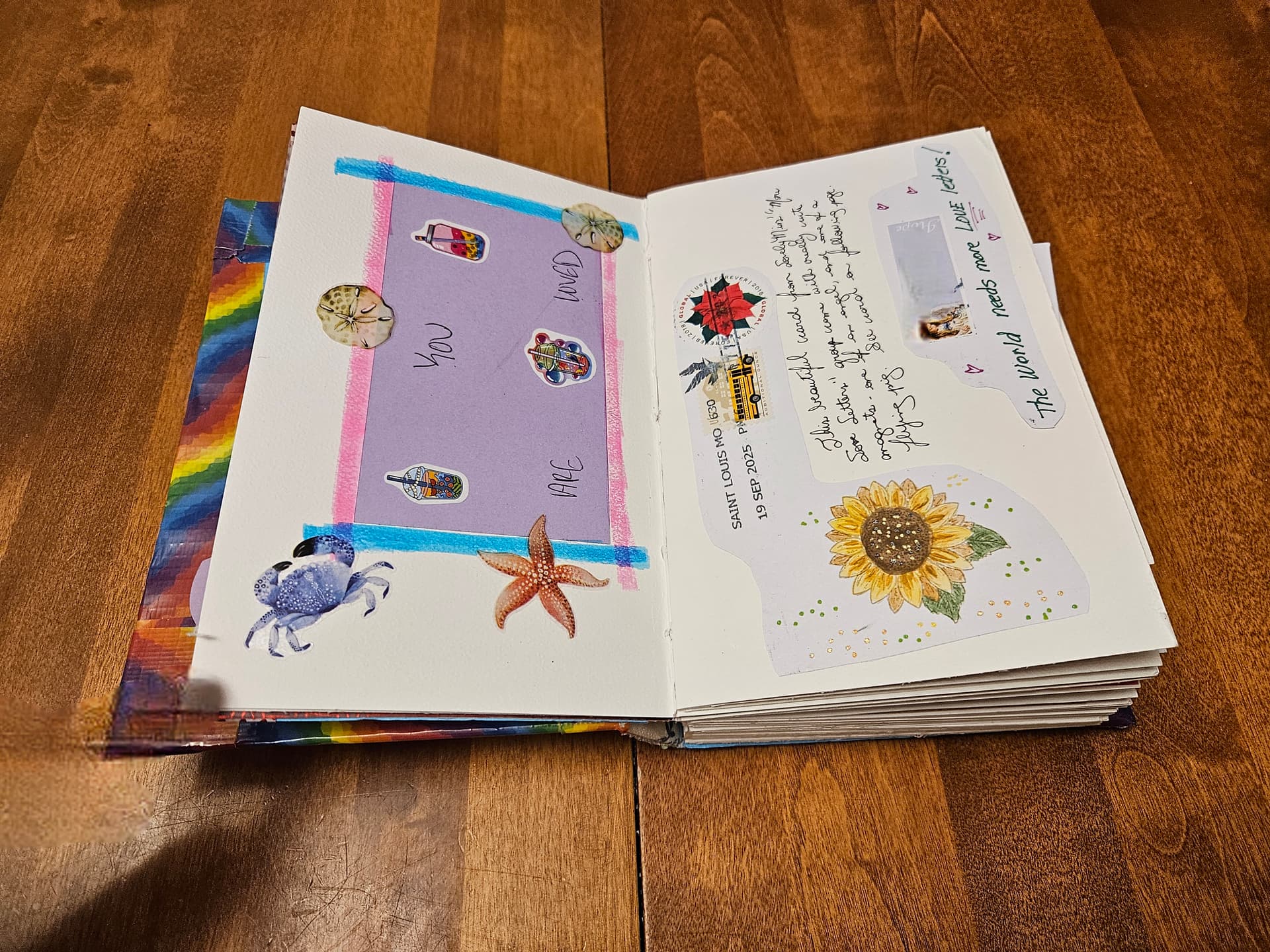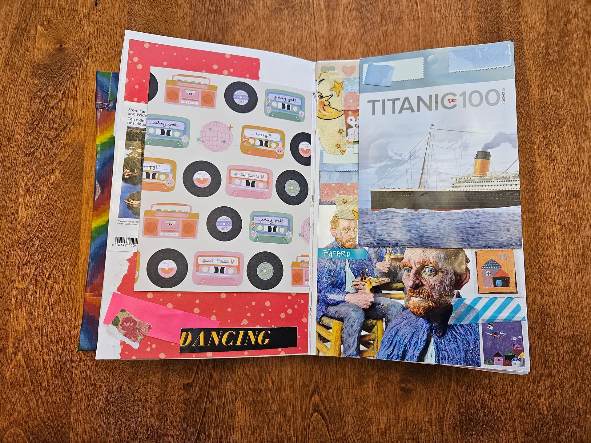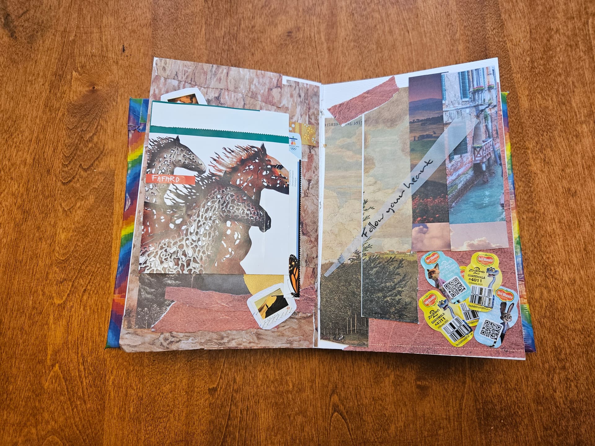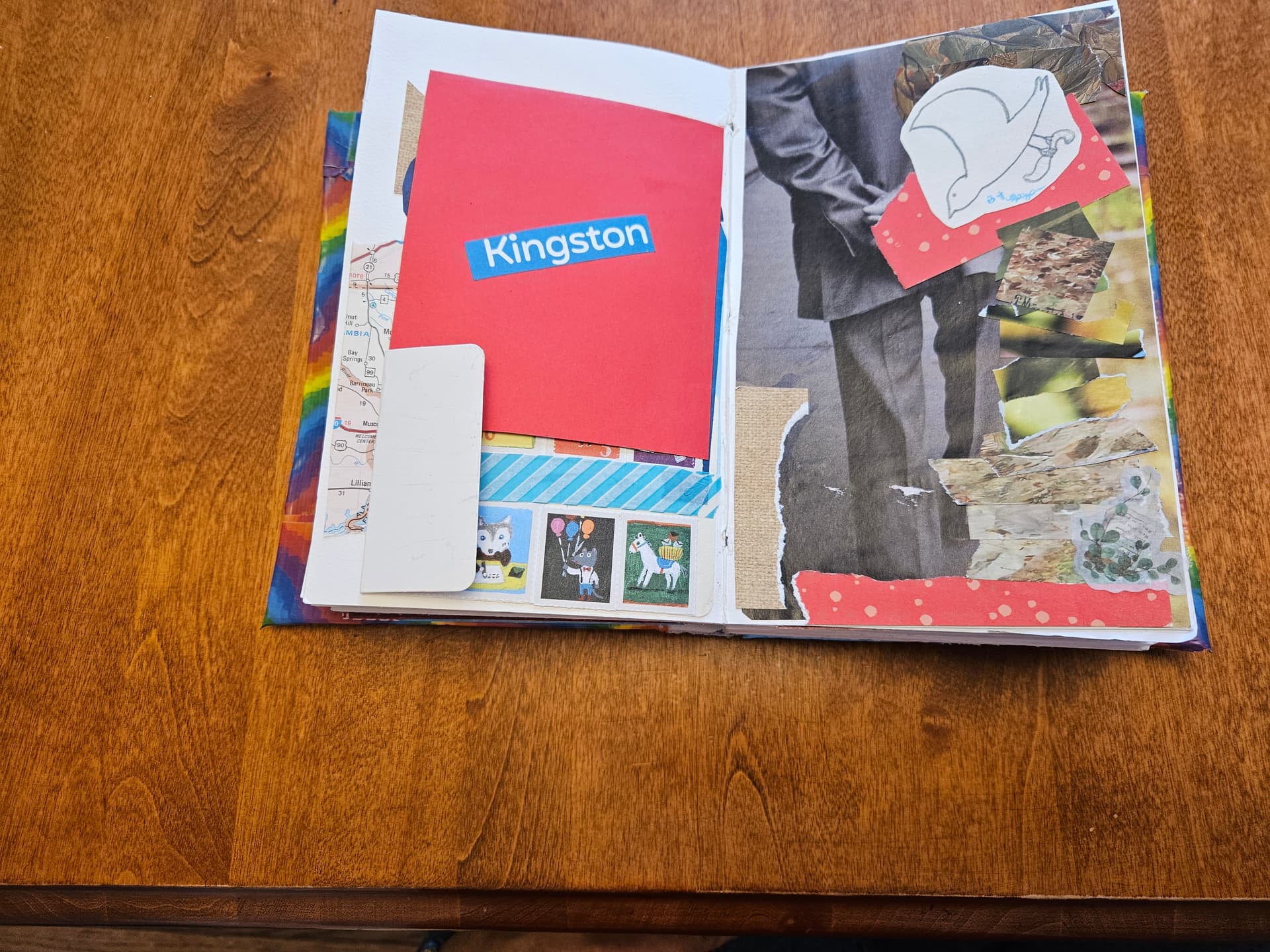 The page below on the left is pure collage with bits and scraps of paper, and a nice quote I saw in a magazine. The page on the right has the flip-down element, which I created by using an empty stamp booklet. These are not recyclable because they’re sticker backings, so you might as well make some art with it
