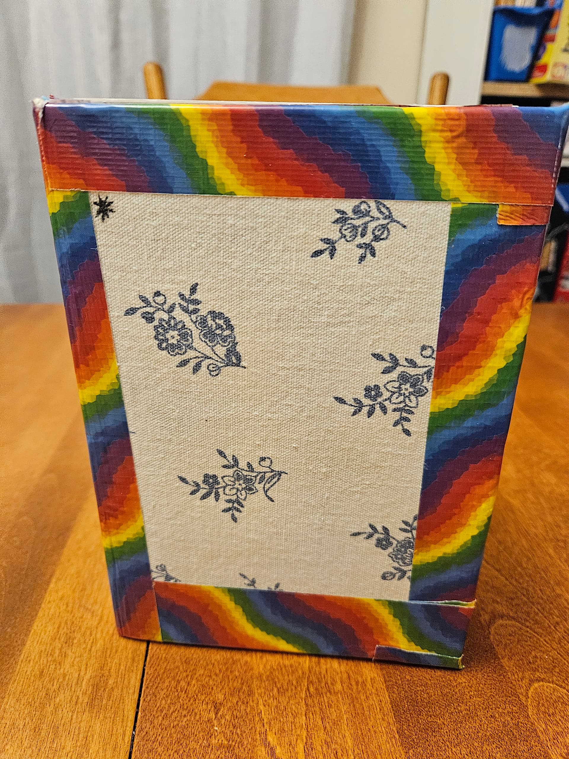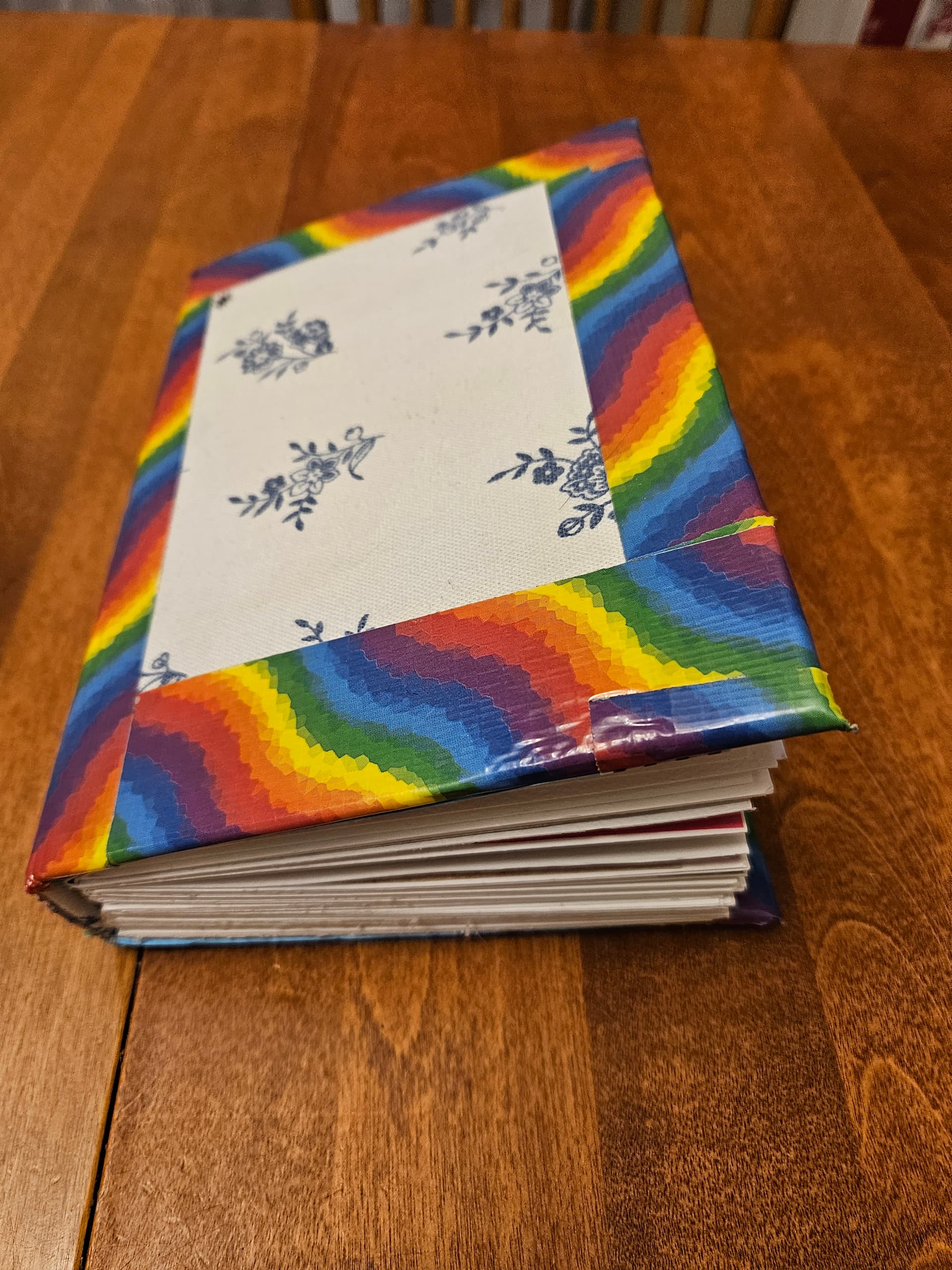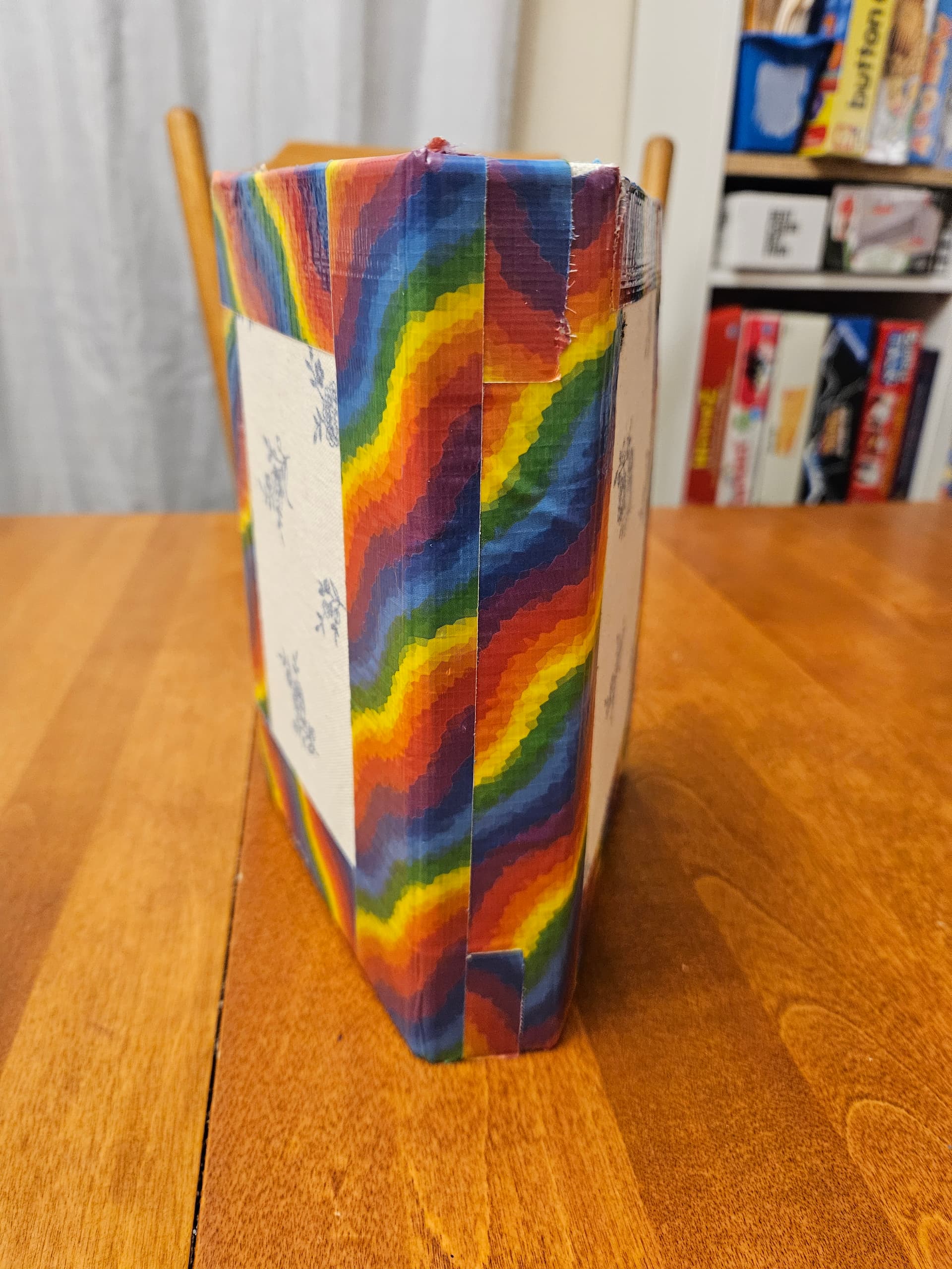 Some in-progress photos of the binding process. I added the tape as reinforcement, because I had an “oops” as I tried to fix a mistake with the fabric. It would have ripped over time without the tape.