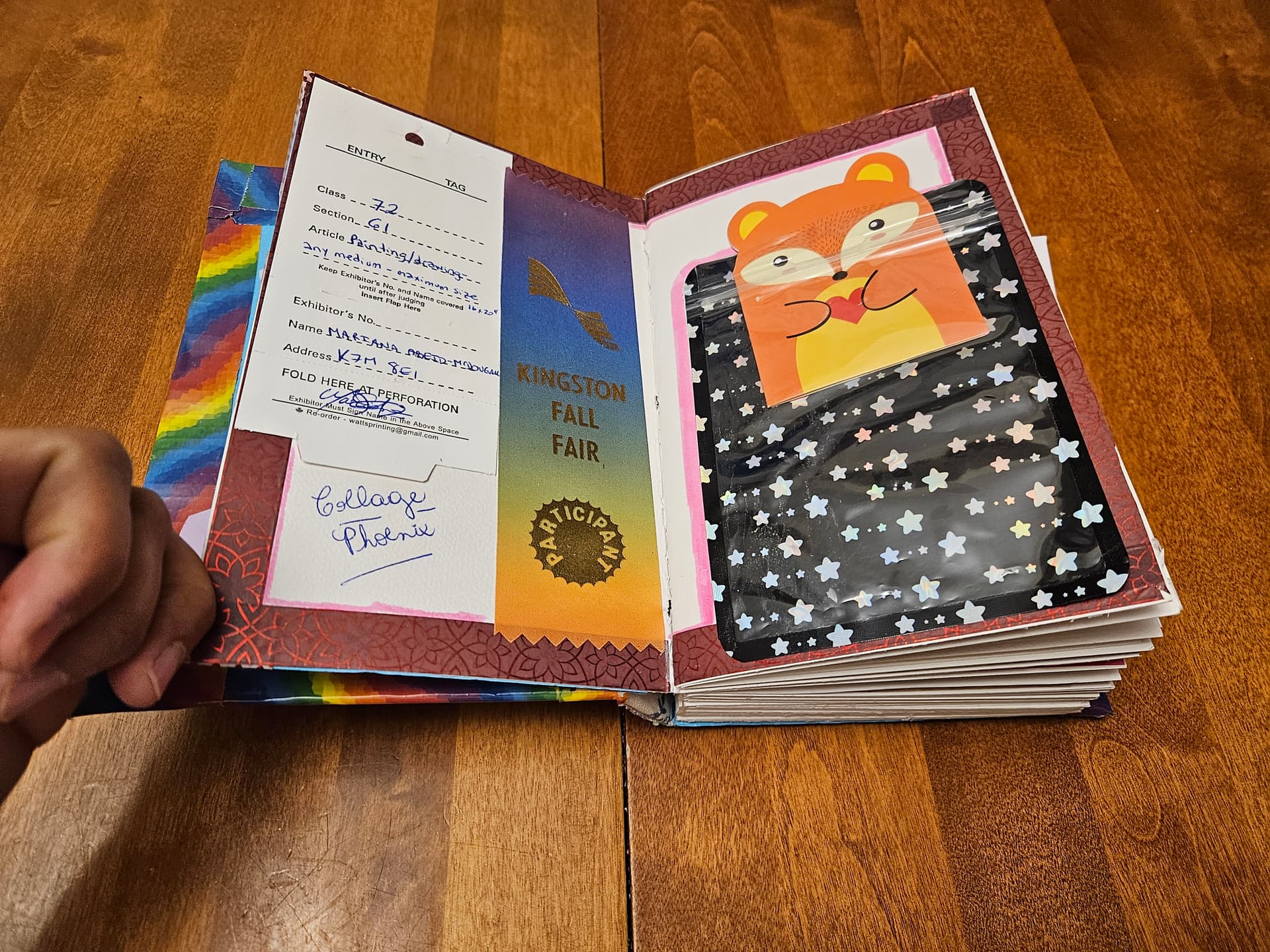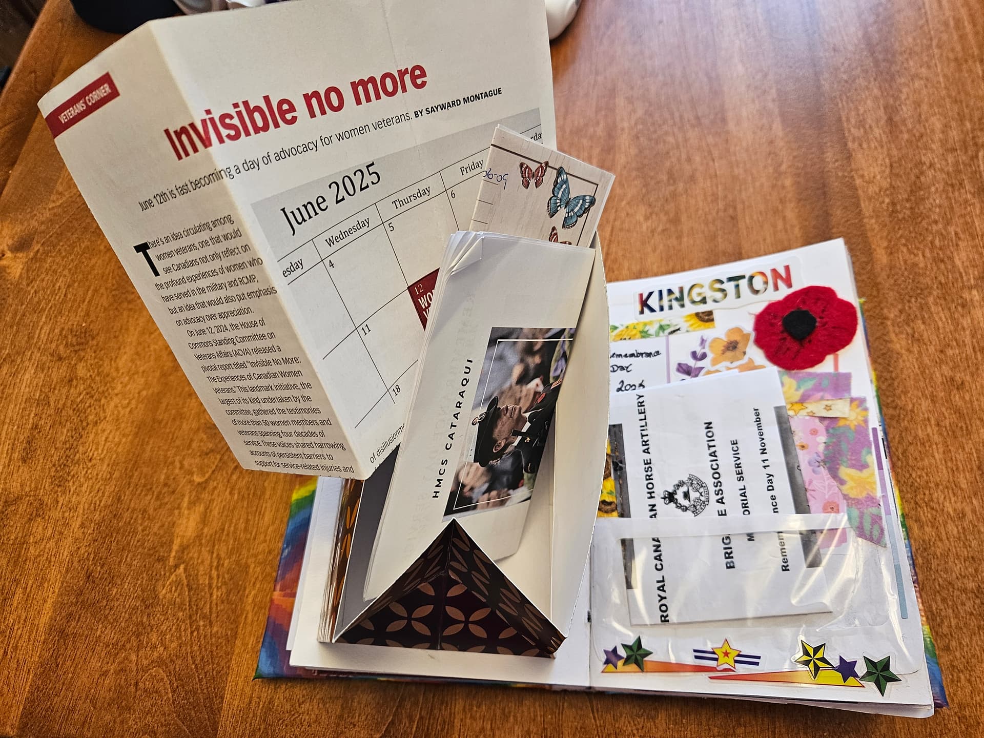 I saw this idea on Pinterest. You cut off the bottom of a paper gift bag, glue the bottom of it to the paper, and then you have a hidden little “pop-up” pocket to store things in. I used it to store the program for Remembrance Day at my former unit, as well as an article about female veterans that @wittychild was so kind to send me in the mail.