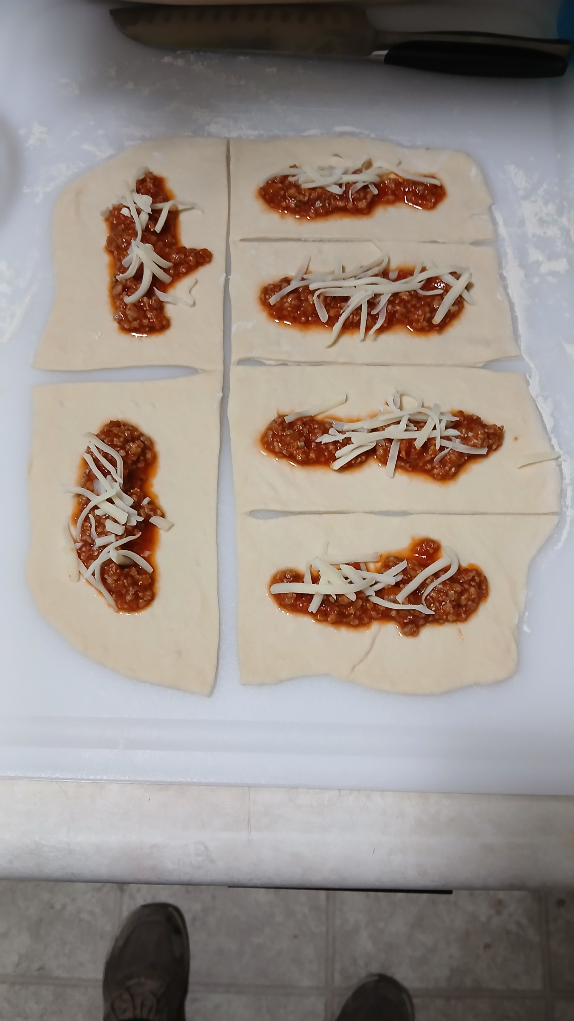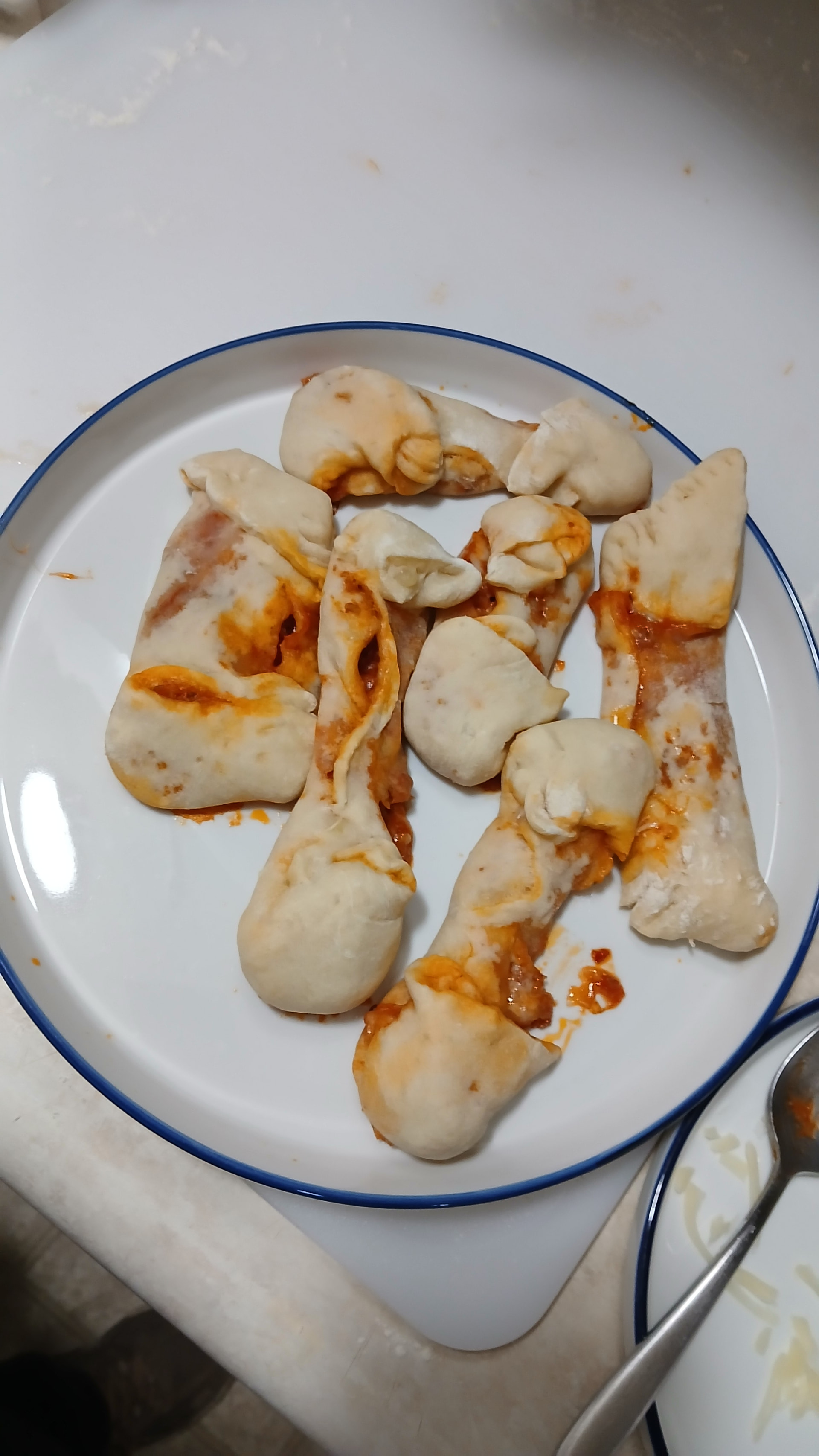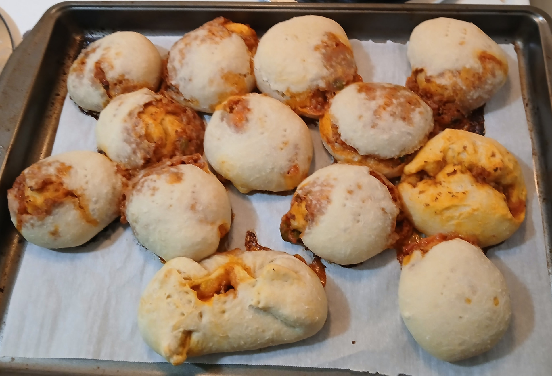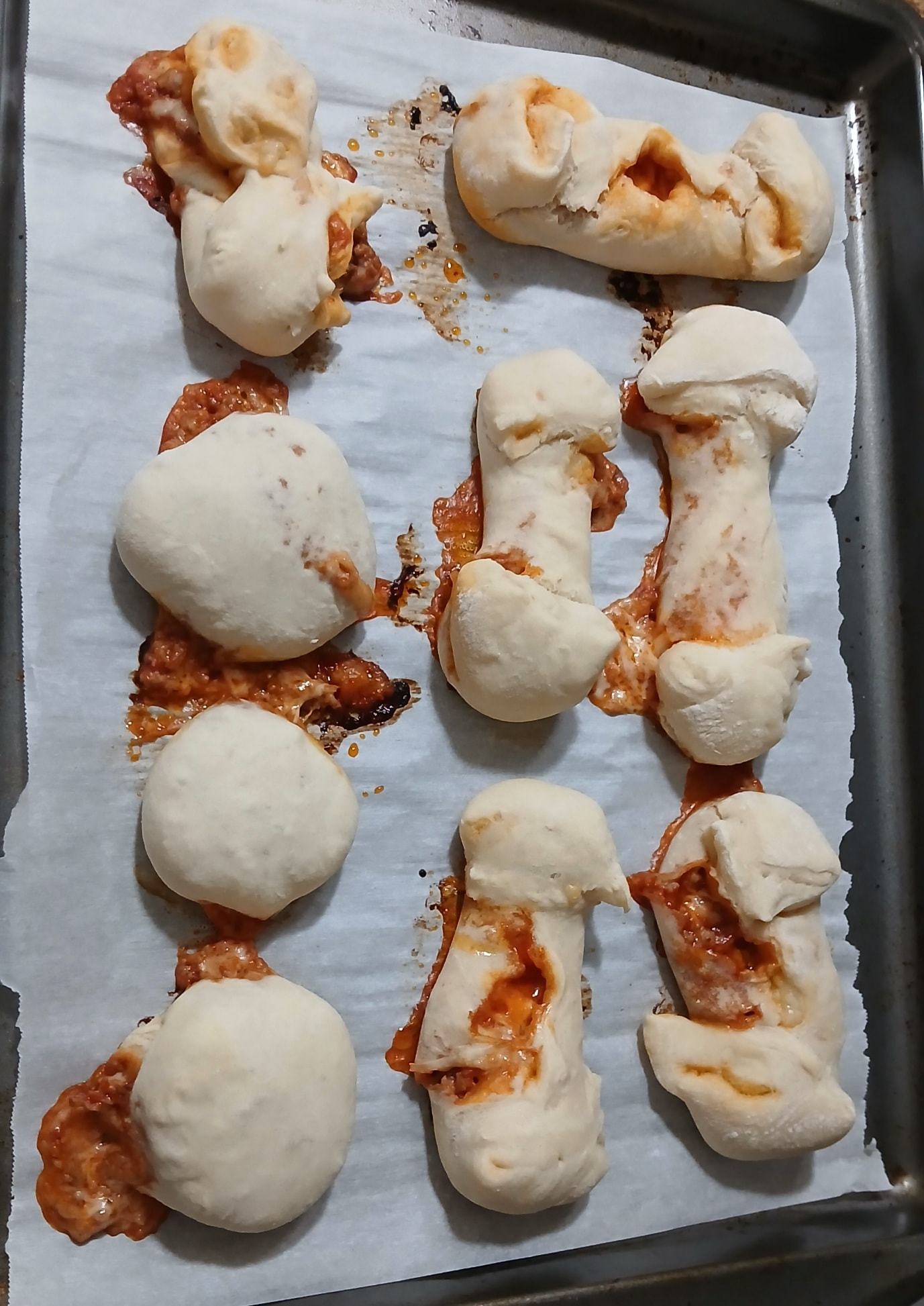 Used my pretzal dough recipe. Plus, I mixed the meat with the pizza sauce to make it easier to build (smoosh?) The pockets.
