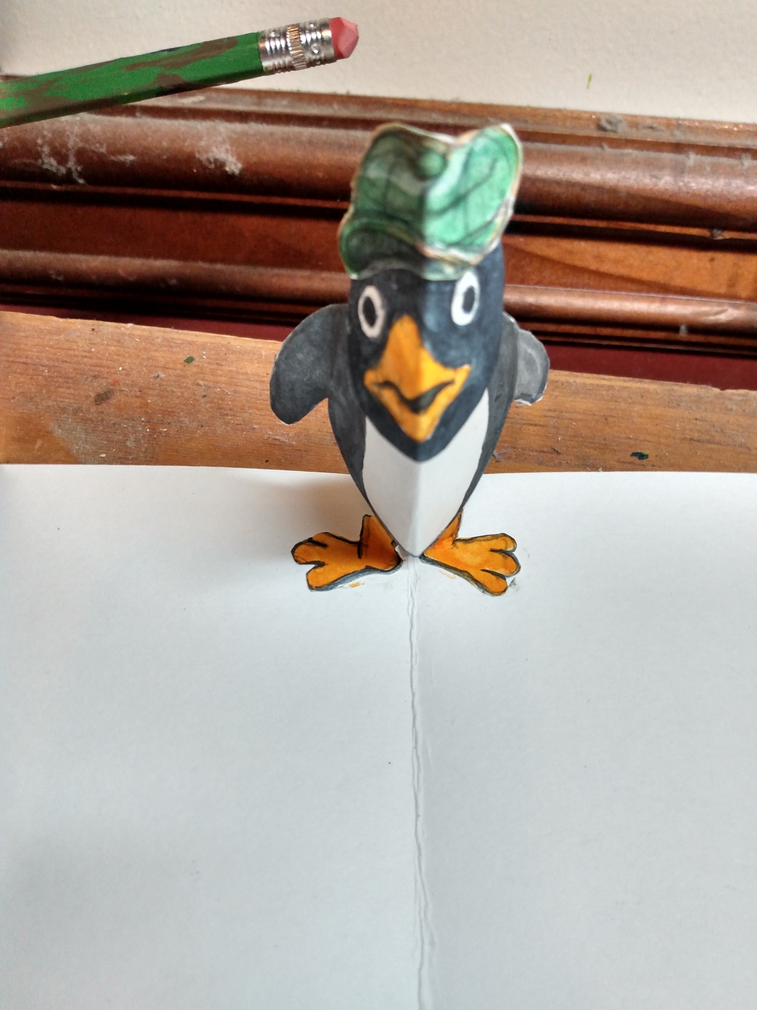 As you might be able to tell, the mechanism is the same for both of them, a single strip of cardstock folded in half, then glued with one “foot” on each side of the center fold of the card so it will go up and down as the card is opened and closed. The visible parts were then glued on to this “spine.”