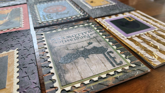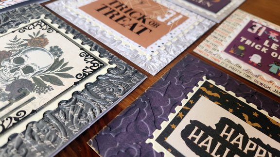 I don’t have a lot of crafting time these days so when I found these Halloween postage stamp embellishments I made a year or two ago, I decided to use them for this year’s H’ween cards.