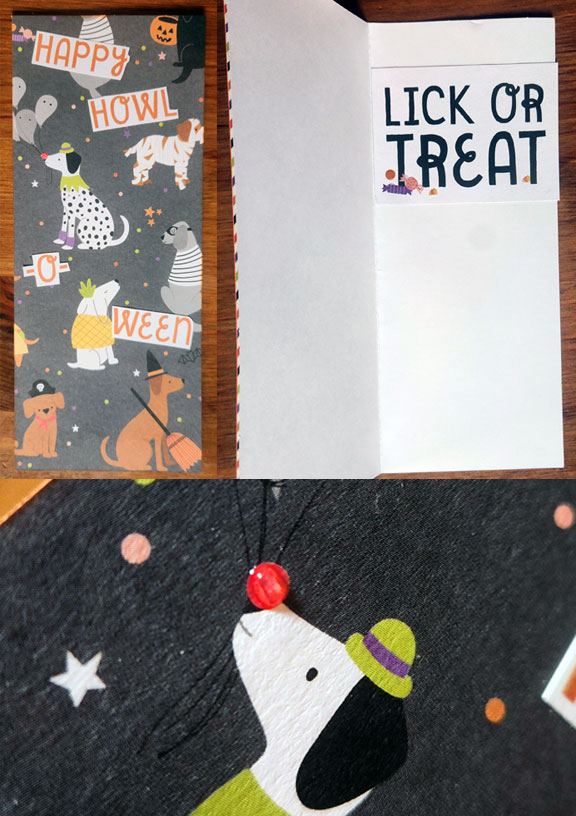 The wiener dog on is for Vivienne’s vet office. I have a pad of pet-themed Halloween cardstock, so decided to make one for the trainer we’ve been using. It’s not a postage stamp version and is mostly about the cute pup prints. I added some glaze to the clown-dog’s nose.