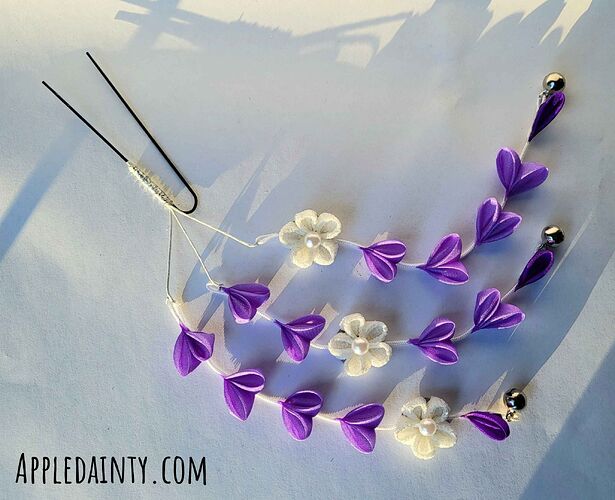 This is a purple plum blossom set that was part of my courses for certification in my art form, tsumami-zaiku. You have to take all three, beginner, middle and advanced courses then do a skills exam and produce a unique work that showcases your mastery to be certified in tsumami-zaiku. I think this from the middle course.