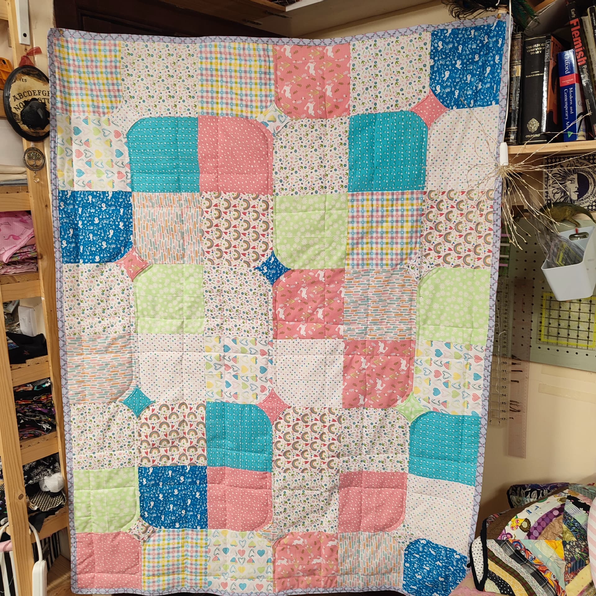 The top was made on the last day of 2023 and I sandwiched, quilted and bound it on the first day of 2024. It’s destined for a friend. I used fairly cheap FQ, and didn’t prewash, so I’m going to toss it in the wash tomorrow and see if I get a nice crinkled effect. The backing was thrifted fabric and so everything was from stash.