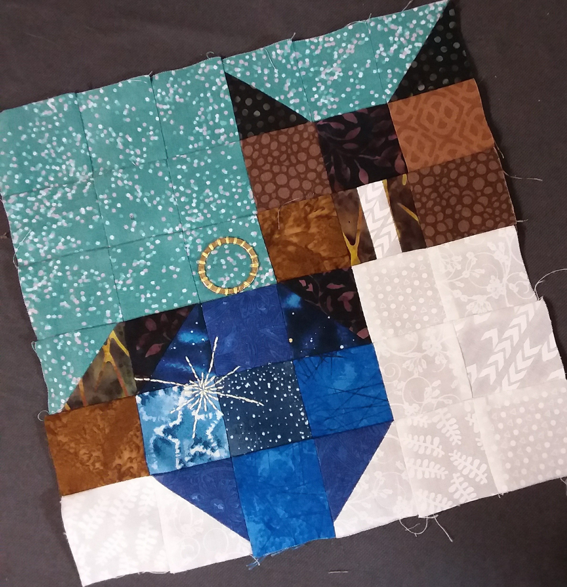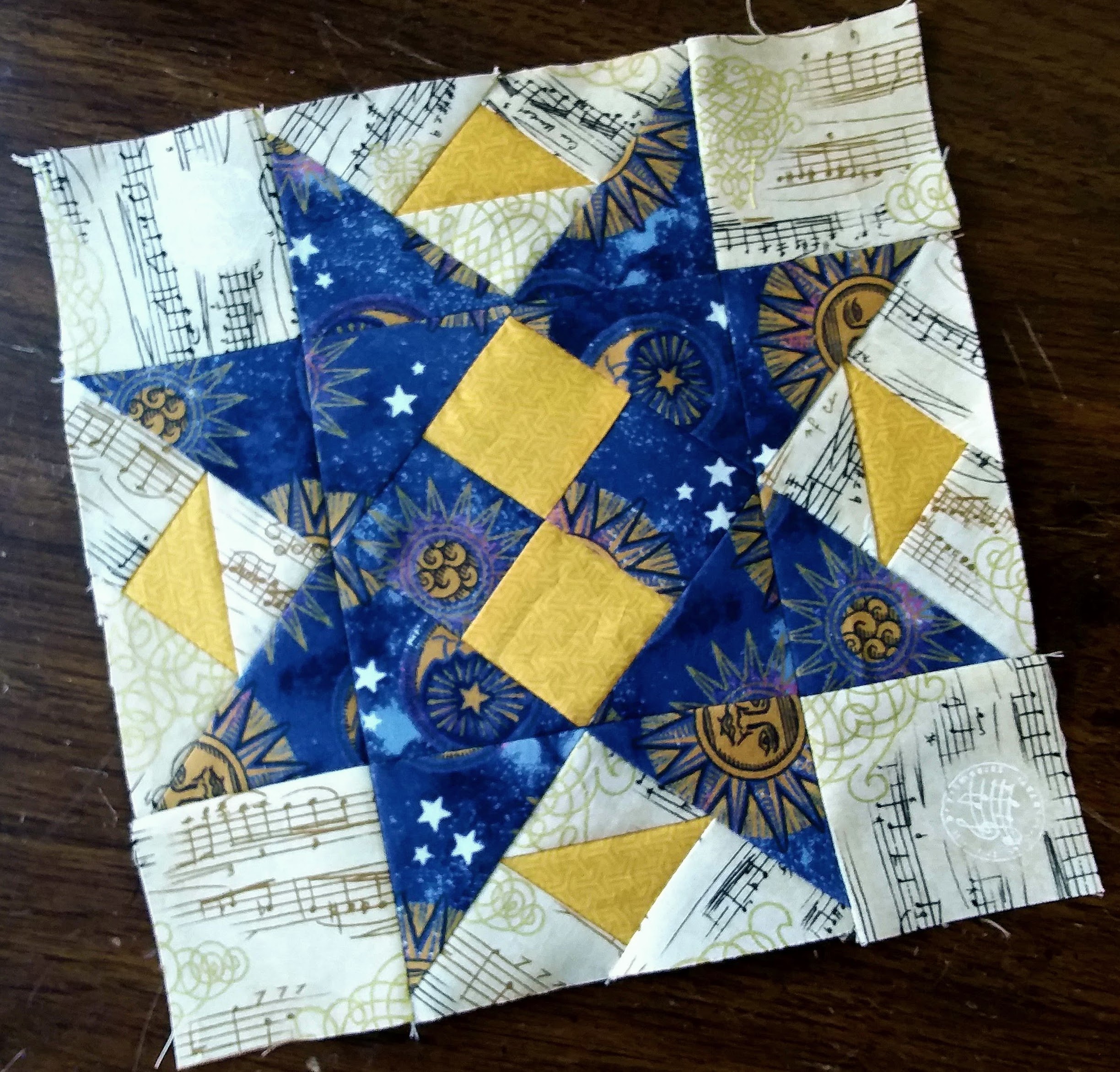 Fun block with the paper piecing, though I only did the fancy blocks on the sides with paper piecing. I wouldn’t want to create a full-size quilt with this method! @MistressJennie is right, traditional quilting techniques would work just as well. But it was fun trying this method. It’s a beautiful block. Staying in my overall color scheme has been a challenge, but I’ve made it work. This is so Starry Nightish.