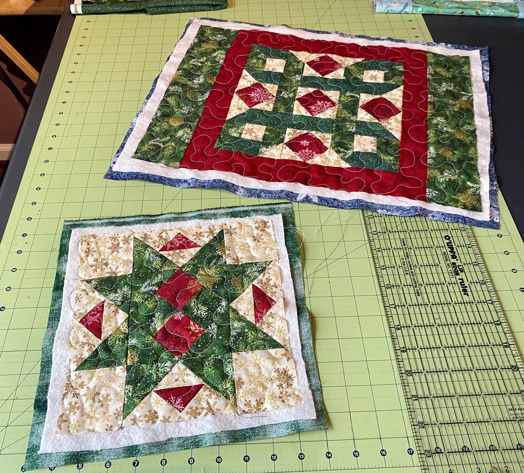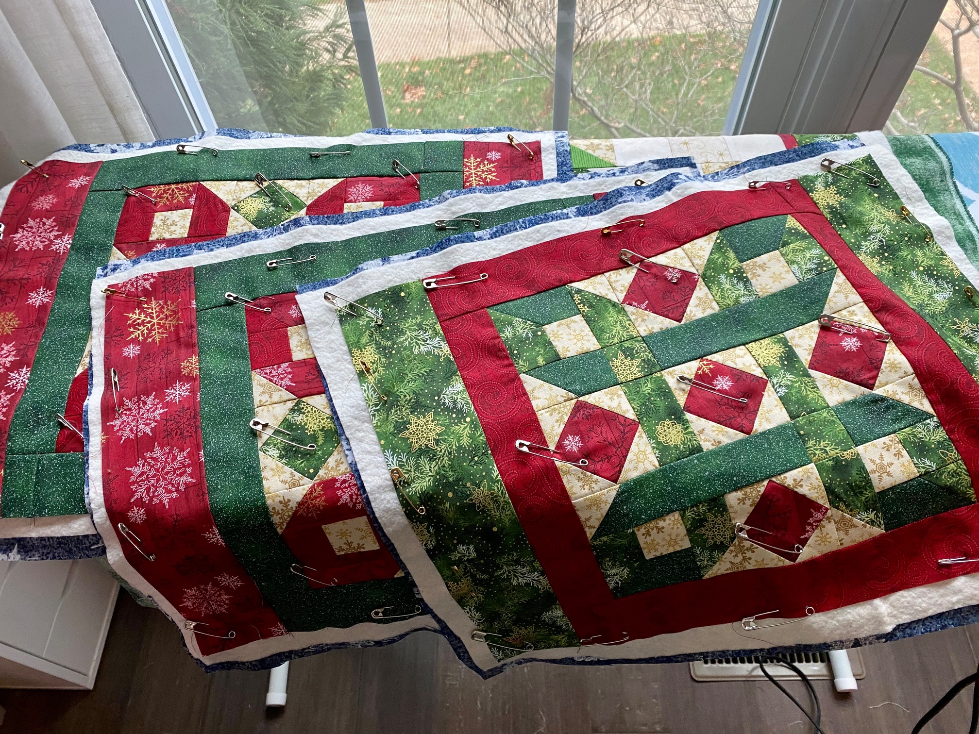 Woot! All 6 pieces have been quilted! Even though it was raining, which the pup didn’t like at all, and even though my mom called again. They worked up pretty fast. I think it was that each one was only a finite size. I wasn’t trying to wrestle an entire lap quilt through the machine. I’ll trim the edges and start binding them all tomorrow.