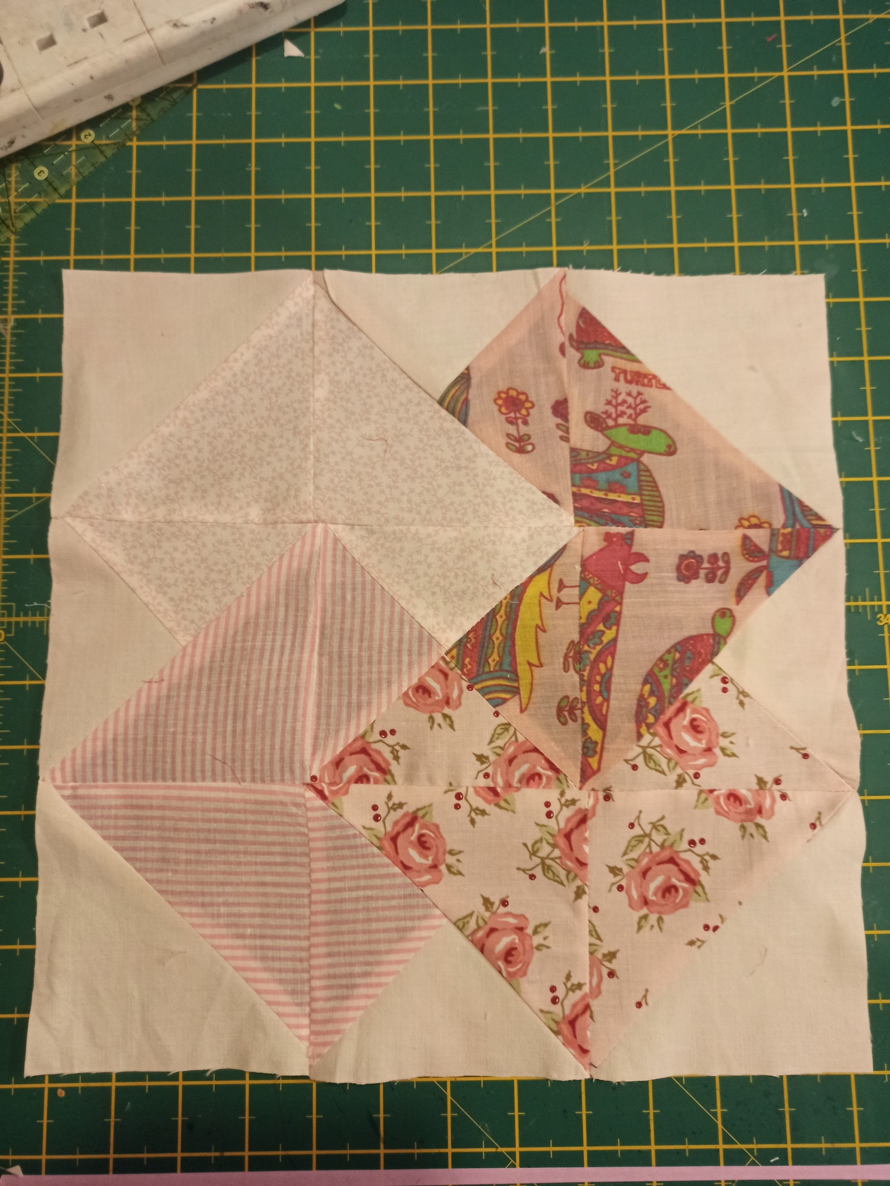 Second piece of advice: The directions have your pieces come out exactly the right size, if youāre using a 1/4" foot. There is no room for squaring or trimming the block down, and if you sew with more than 1/4" seam, even a tiny bit more, your block will come out smaller overall than you planned. Mine came out just under 12.5". If you like to square your HSTs, or are worried about ending up with a too small block, then you might want to cut your pieces 1/4"-1/2" larger than written, and then trim them down after piecing them. When I pieced my second one, I just adjusted my needle position by 1 click, and that fixed the size problem for me.