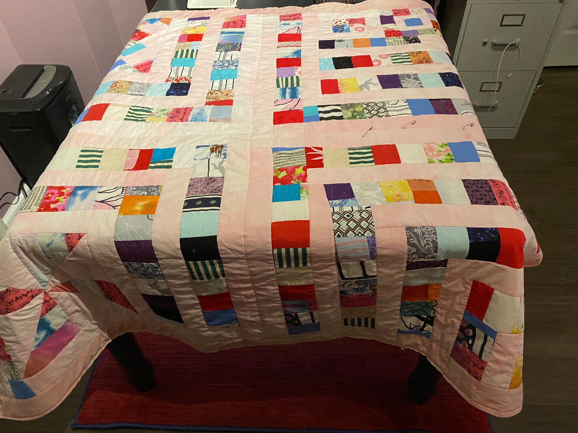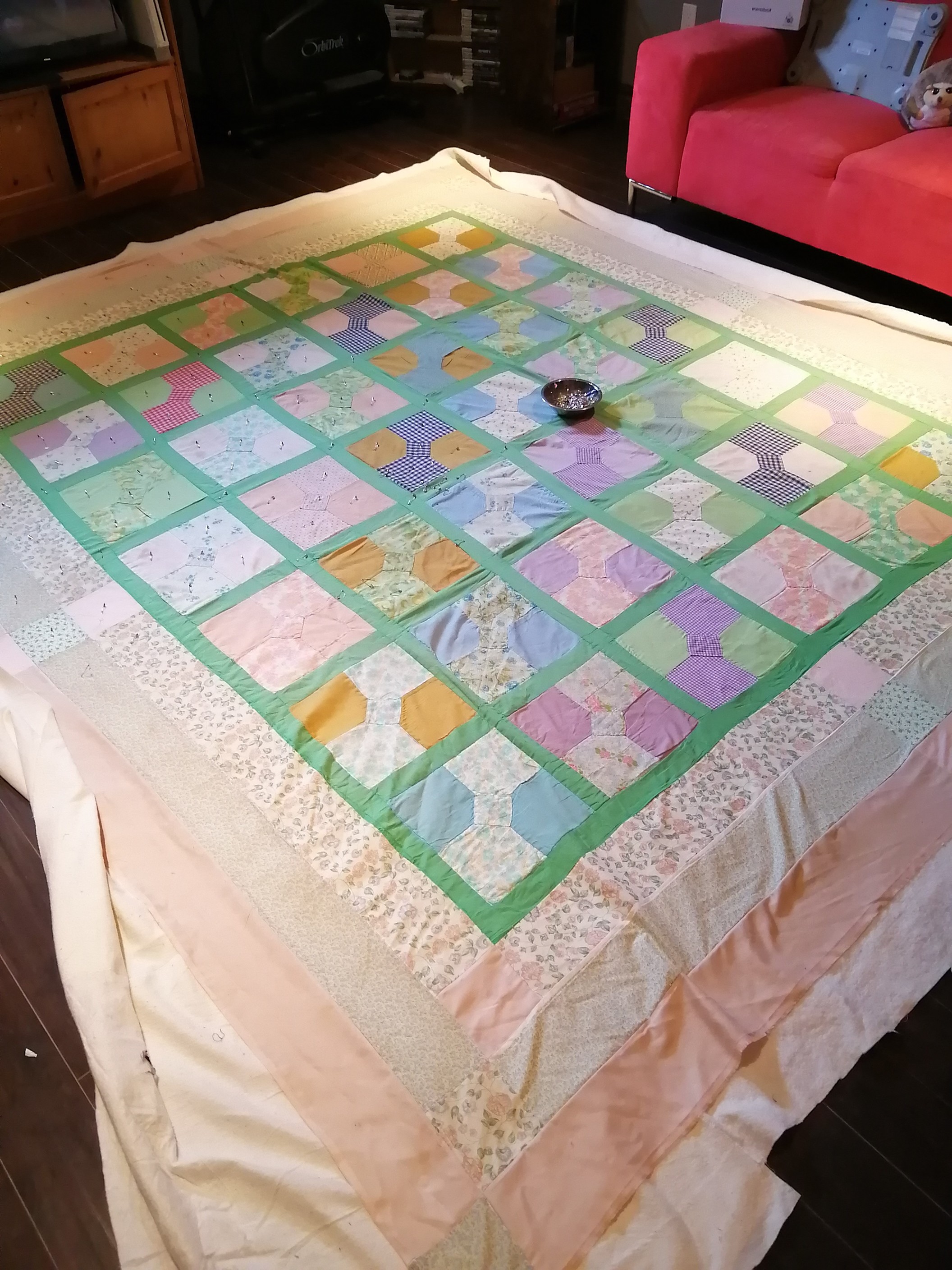 I was so close to finishing another quilt today, for the challenge theme. (This is one of the tops Edel sent me when we swapped earlier in the pandemic.) In fact, if my husbandās D&D game hadnāt been canceled tonight, Iād be stitching on the binding right now. As it stands the whole thing is quilted, and the binding is assembled and ready to go on. Guess Iāll just have to be satisfied with finishing it tomorrow.