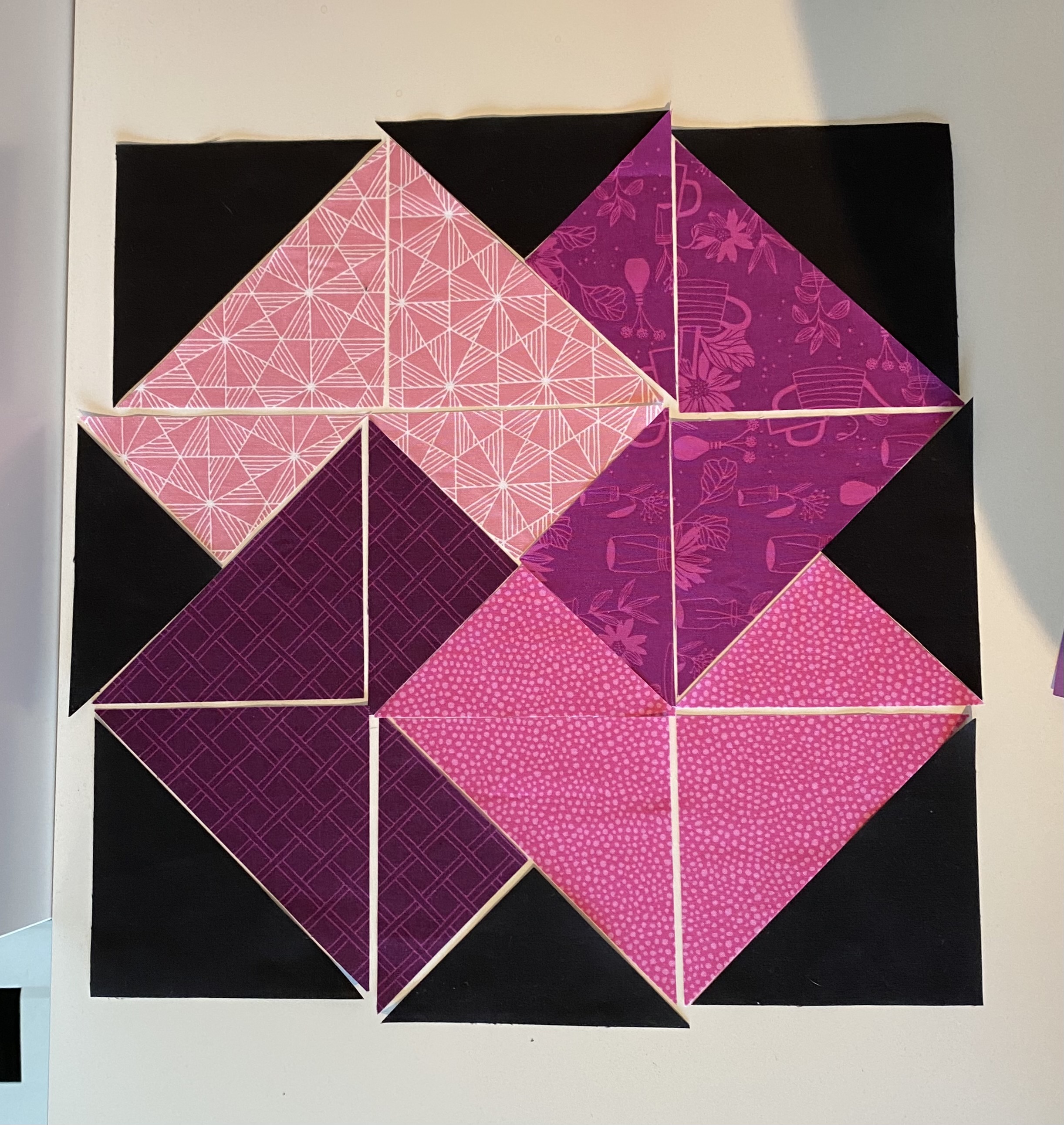 For those of you working on the Card Trick block from the first (original) link; Be careful! I messed my original block up because I wasnāt careful enough. I intended to have the two pink shades opposite one another, and the two violets opposite. In a quick glance at the diagram it looked like the Cards were lettered clockwise as A, B, C, D, so I mentally labeled my pinks A & C, and the violets B & D. But they arenāt actually that way on the diagram! They place them clockwise as A, B, D, C. So I ended up with pinks next to one another, and my violets likewise. Because all of these are cut as triangles, I didnāt want to take my pieces apart to fix the situation, because Iād end up with stretched out pieces after seam ripping.