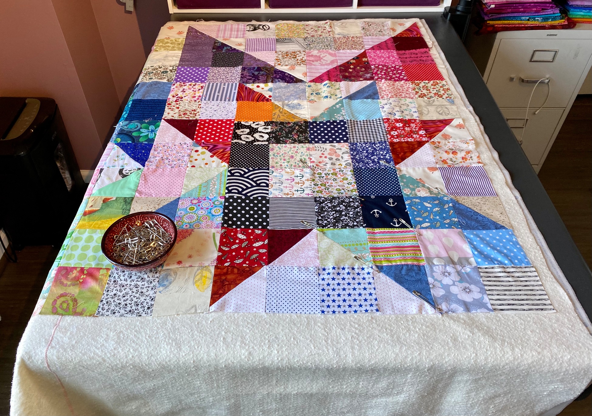 This scrappy quilt top was sent to me by our very own Edel, about a year ago. We agreed to craft scrappy quilt tops with what we had on hand during the early days in the pandemic. It has been hanging out in my stash since then, waiting to be quilted. I’m so glad to have finished another project, and gotten something out of the pile! More info in the project post.