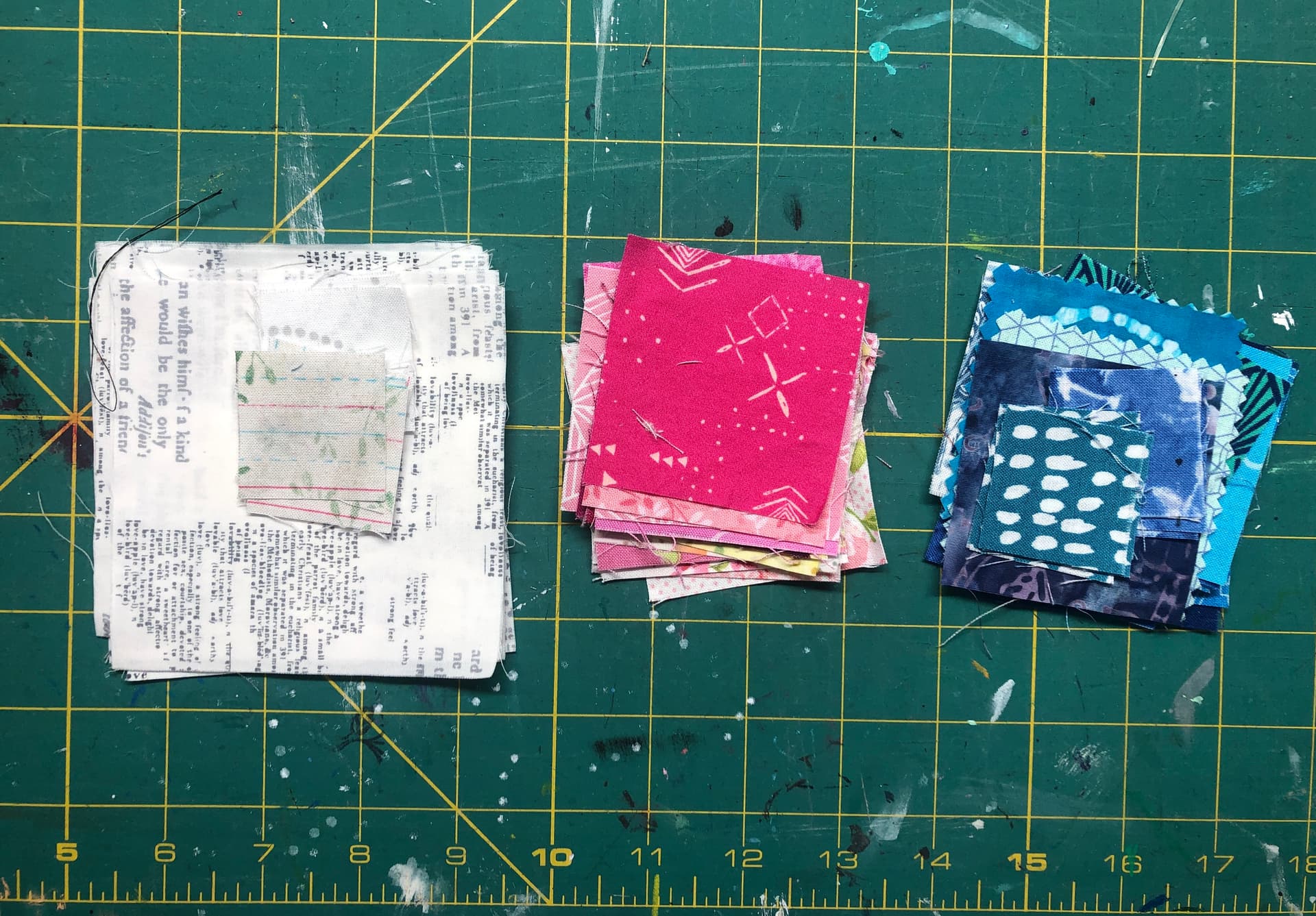 - some projects are more scrappy than others. Some can be made with tiny squares of true scraps, others require bigger squares and a lot of different, but matching fabrics. I’m sure a lot of you could pull twenty different red or teal or purple fabrics out of your stash but I’m trying to keep my stash as small as possible.