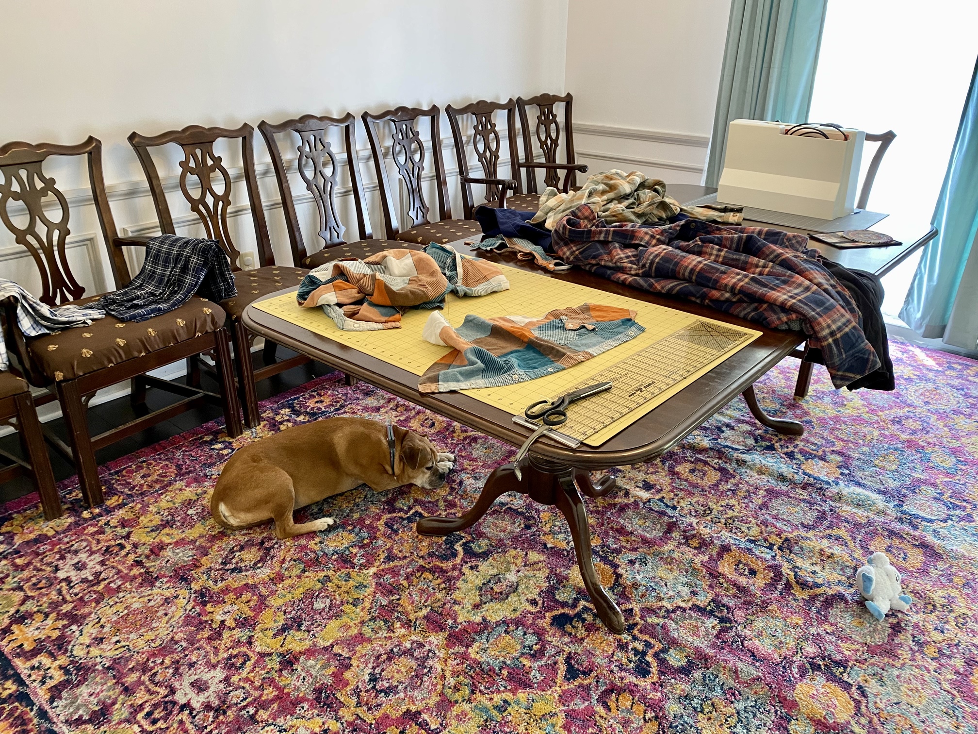Was relatively productive during Ada’s morning nap. Set up a rough sewing space in the unused dining room, and managed to disassemble 2 of the 4 flannel shirts. I dug through what boxes are here from my studio, and found the cutting mat and ruler, and my sewing machine, ans well as a smaller cutting mat that I formerly used on my beading area in my last studio. It’s a perfect size to protect the table from the machine.