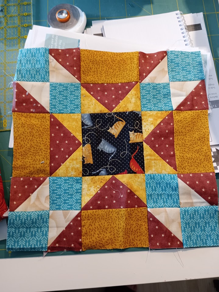 What a different look with just using different colors and layout! I really do love your mom’s cat themed blocks. It is going to be a lovely quilt!
