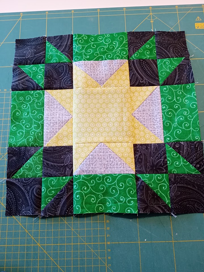 This one Im a bit proud of. The earlier BOMs have my mum finished first, and I have asked her if I felt un-sure how to do something. This time she finished her 9 squares for the final assembly and left it with that. So while she had a garage sale, I sewed my square, with only the description at hand. ![]()