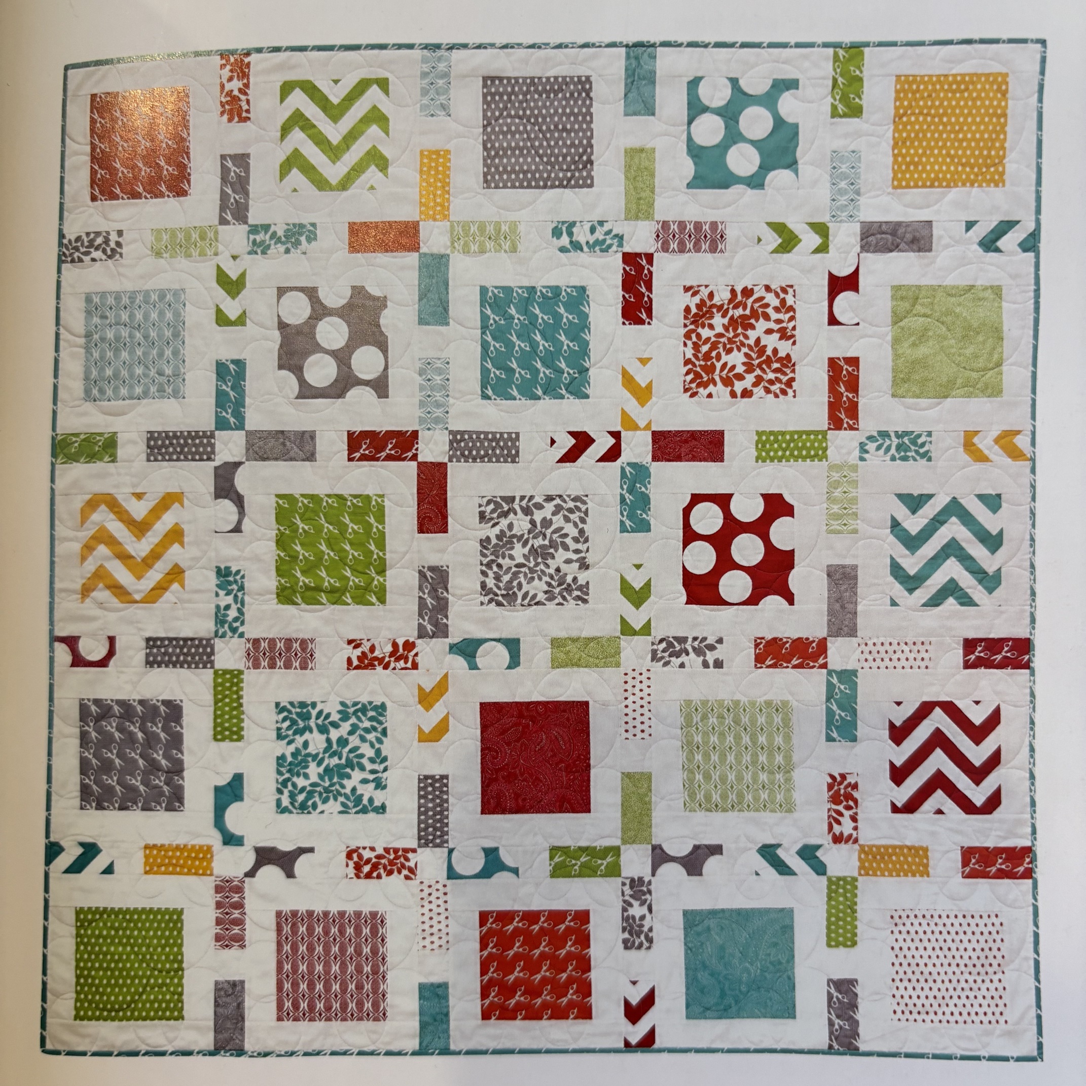 1.Crib quilt, cut, pieces, sandwiched, quilted and trimmed, ready for binding.