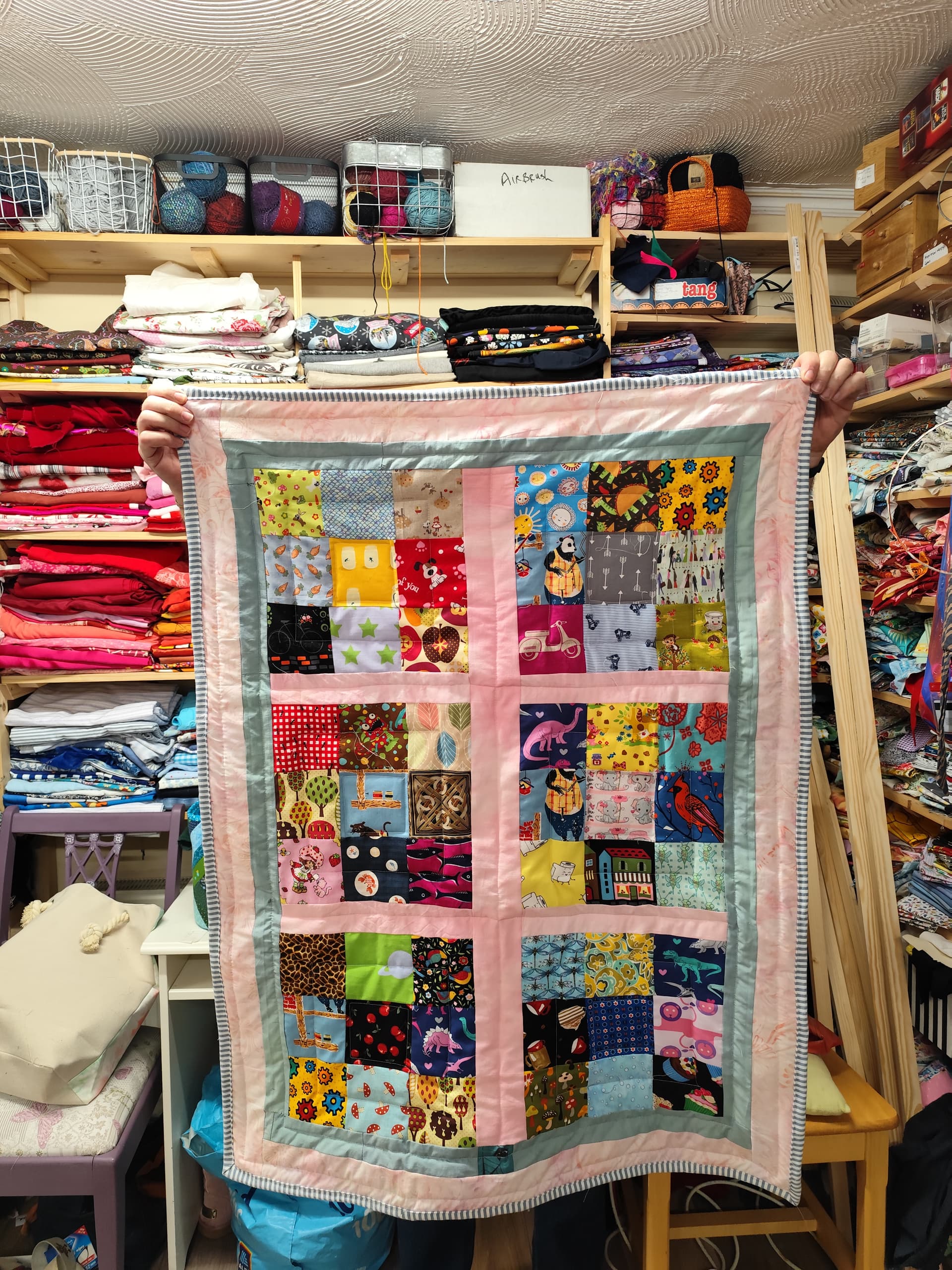 This quilt is really special, because I put it the call to you lovely people for fussy cut squares for the hypothetical grandbaby quilt. These squares were left overs, and so I used them for this baby quilt. This is another grandbaby quilt-my husband’s granddaughter.