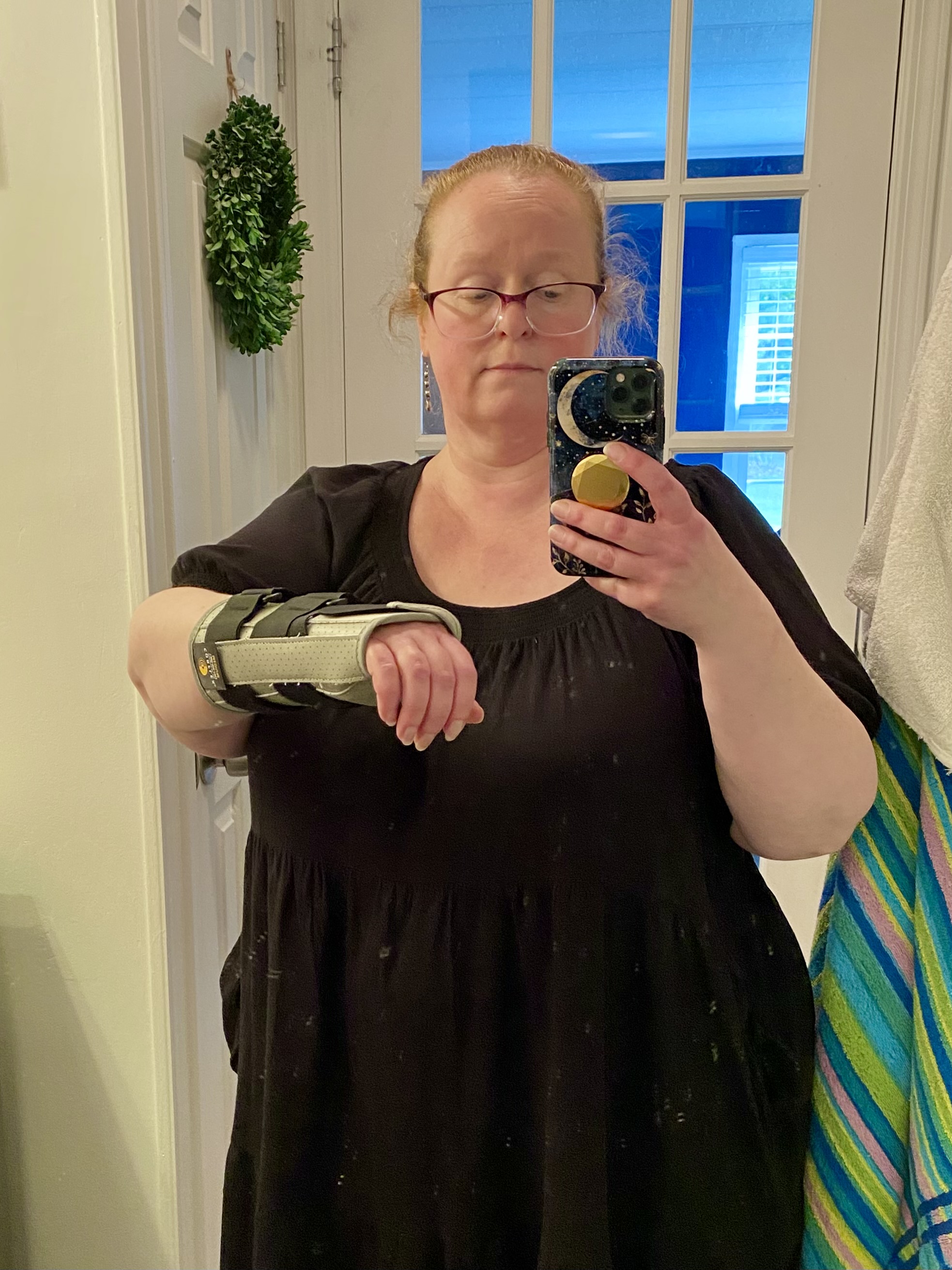 I tripped over Ada, fell, and broke my wrist. While I am visiting my parents in NH, just as a ton of relatives arrived for a party. I was looking forward to quilting when I got home, but now there won’t be any crafts for awhile. And I still have to fly back home with a toddler on Wednesday.